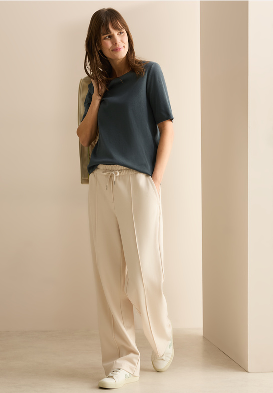 Basic Cecil Shirt mit kurzen Ärmeln, Rundhalsausschnitt und feiner Rippstruktur. Das Cecil Shirt hat eine schmale Passform und ist aus einer Baumwollmix mit bequemem Stretchanteil.