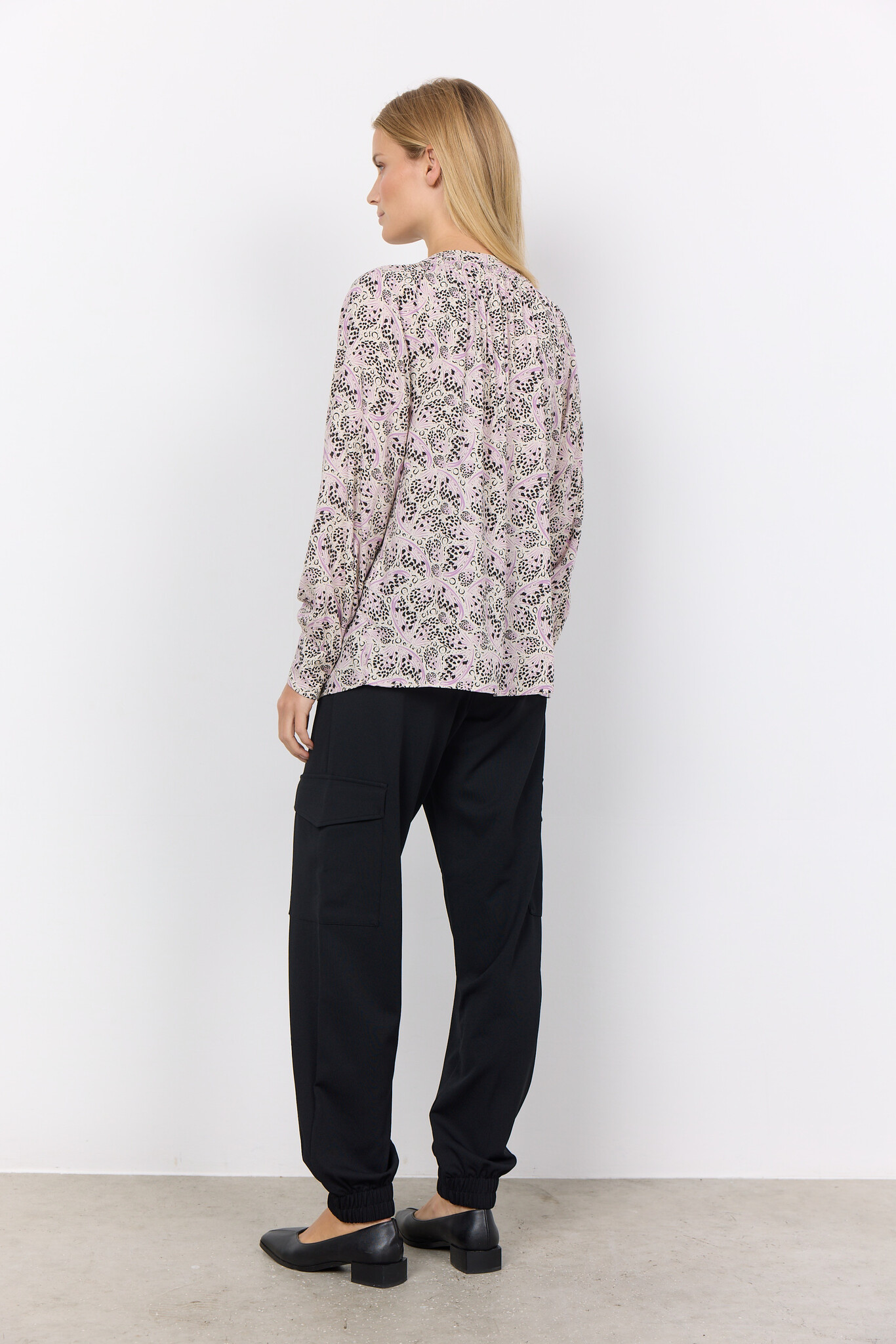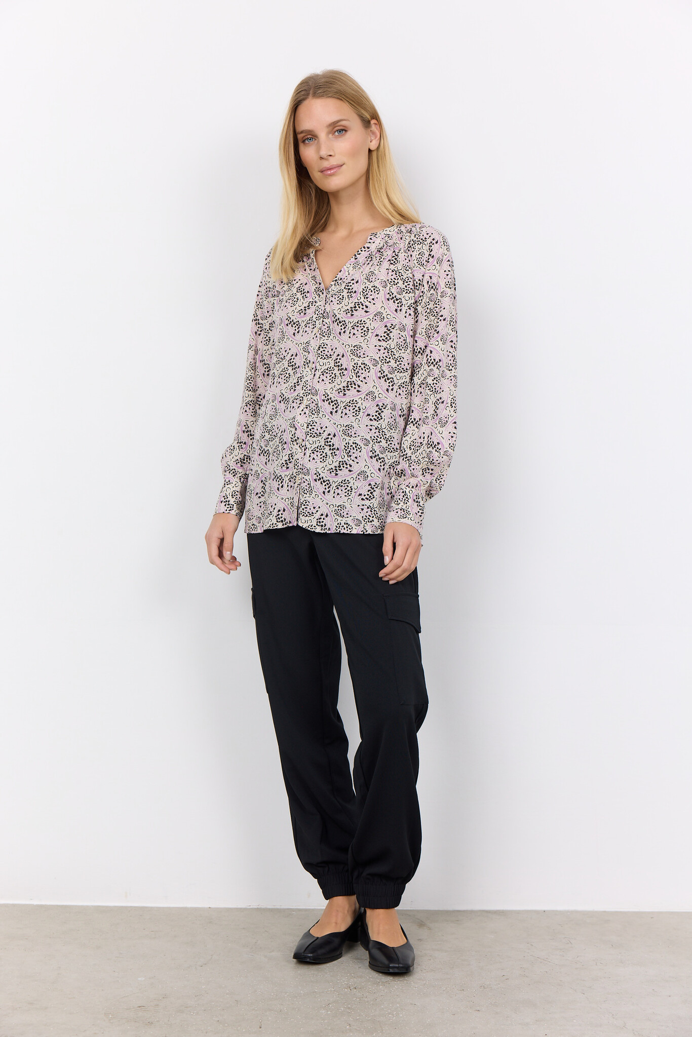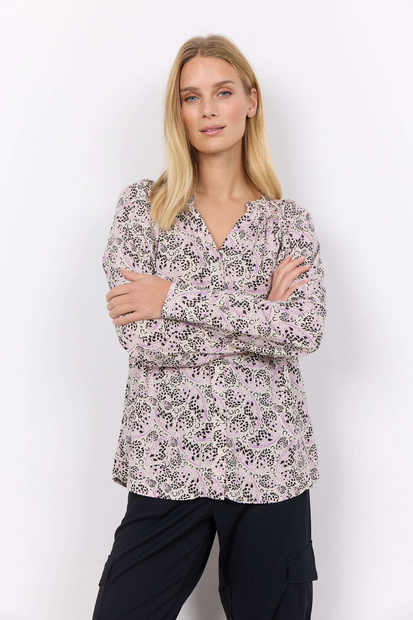 Soyaconcept SC-Agnes 2. Soyaconcept Bluse mit langen Ärmeln, Rundhalsausschnitt mit Schlitz und Allover-Print.