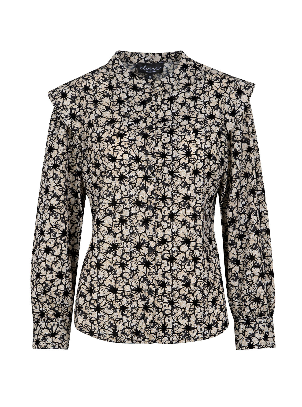 Elvira Collections Flower. Elvira Collections Bluse mit langen Ärmeln, Allover-Print und kragenloser Rundhalsausschnitt mit langer Knopfleiste. Die Elvira Collections hat eine dezente Falte an den Schultern.