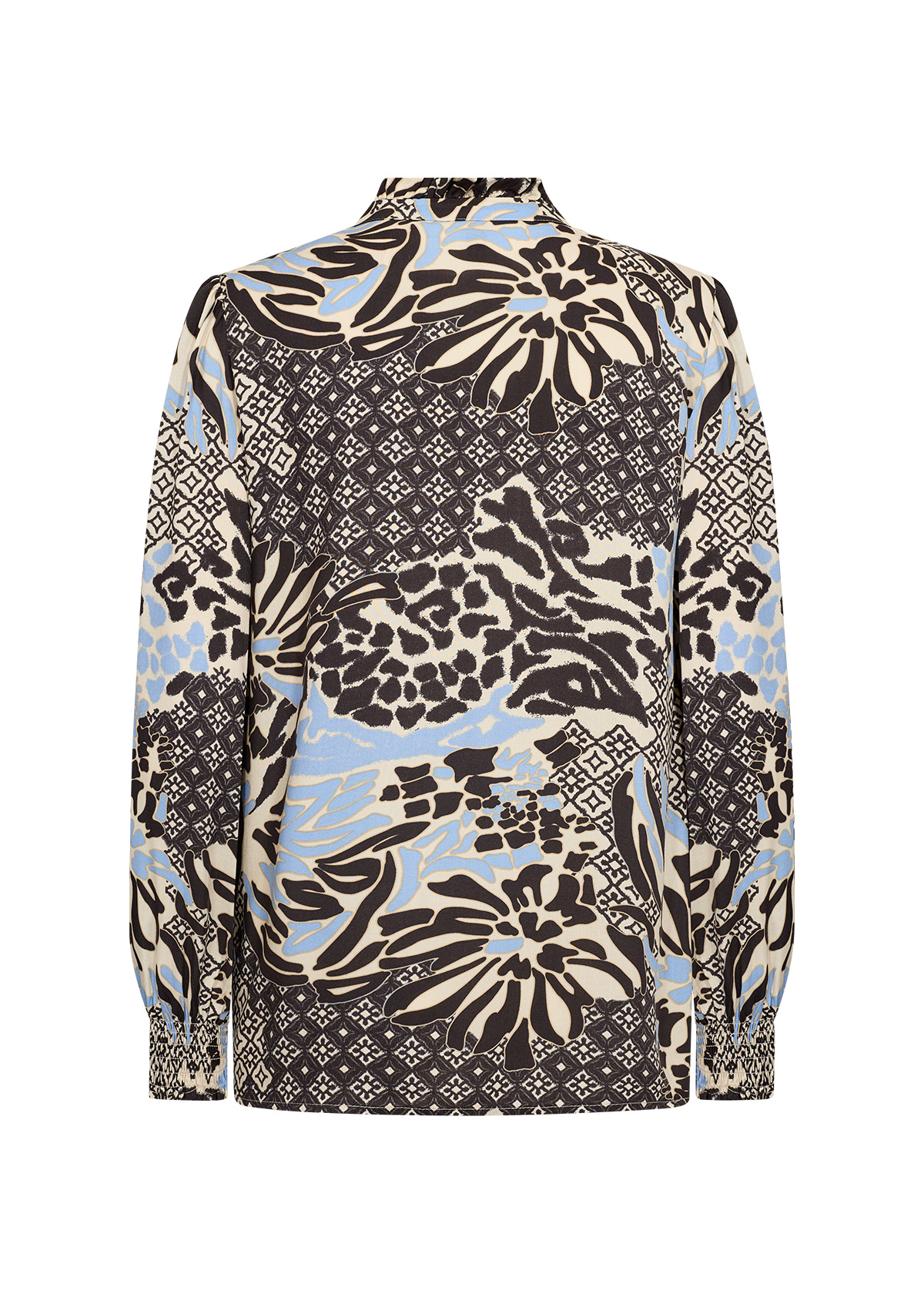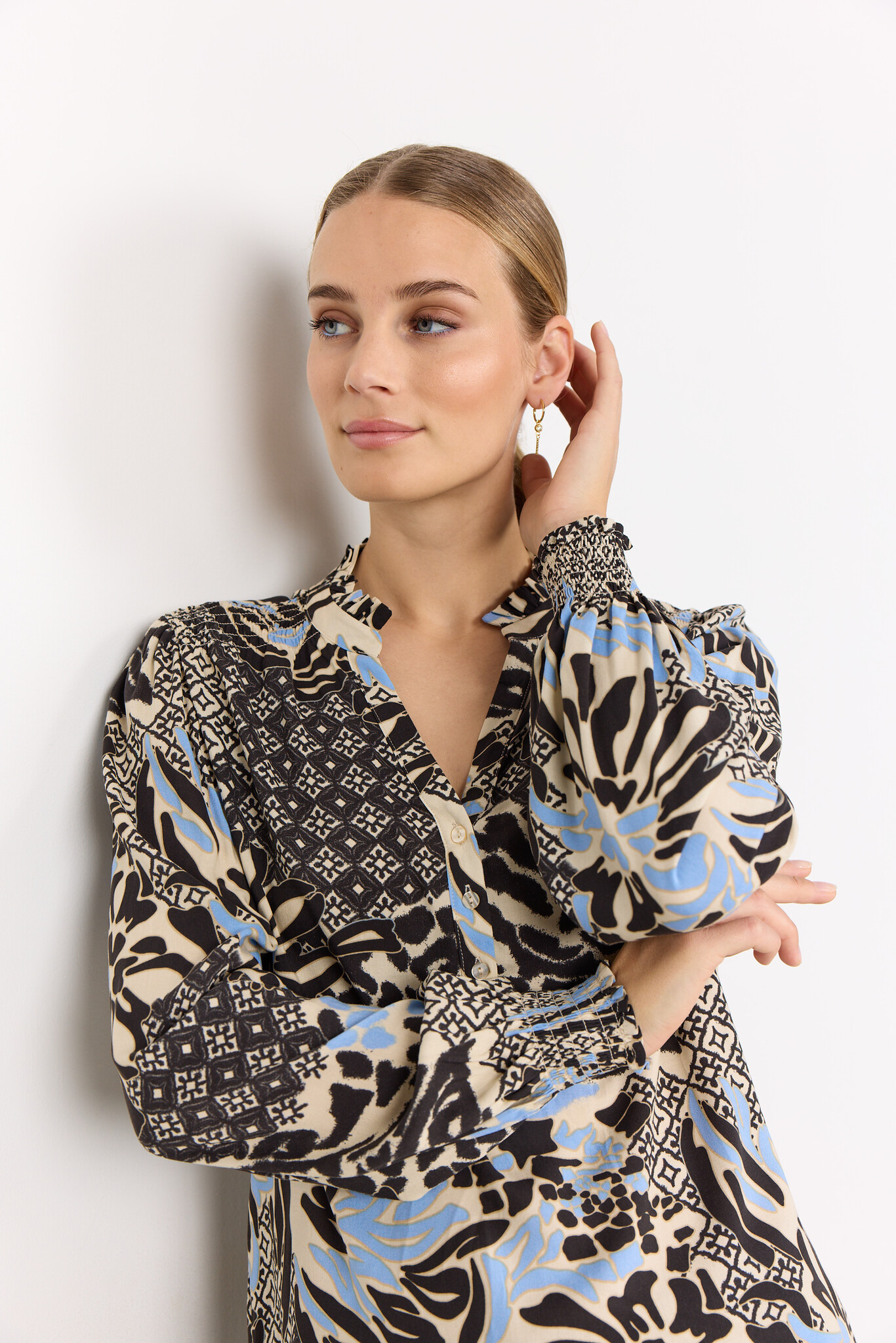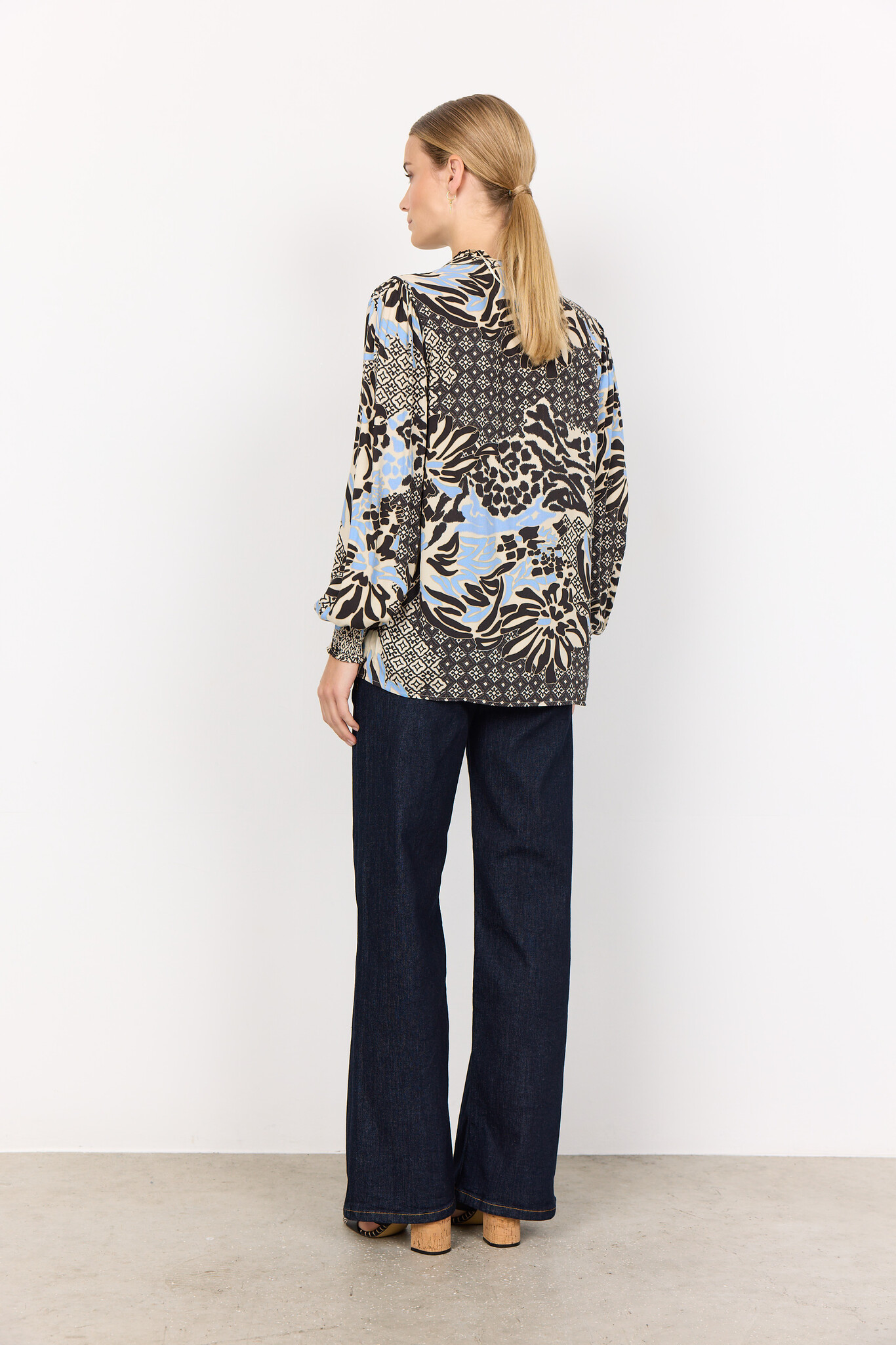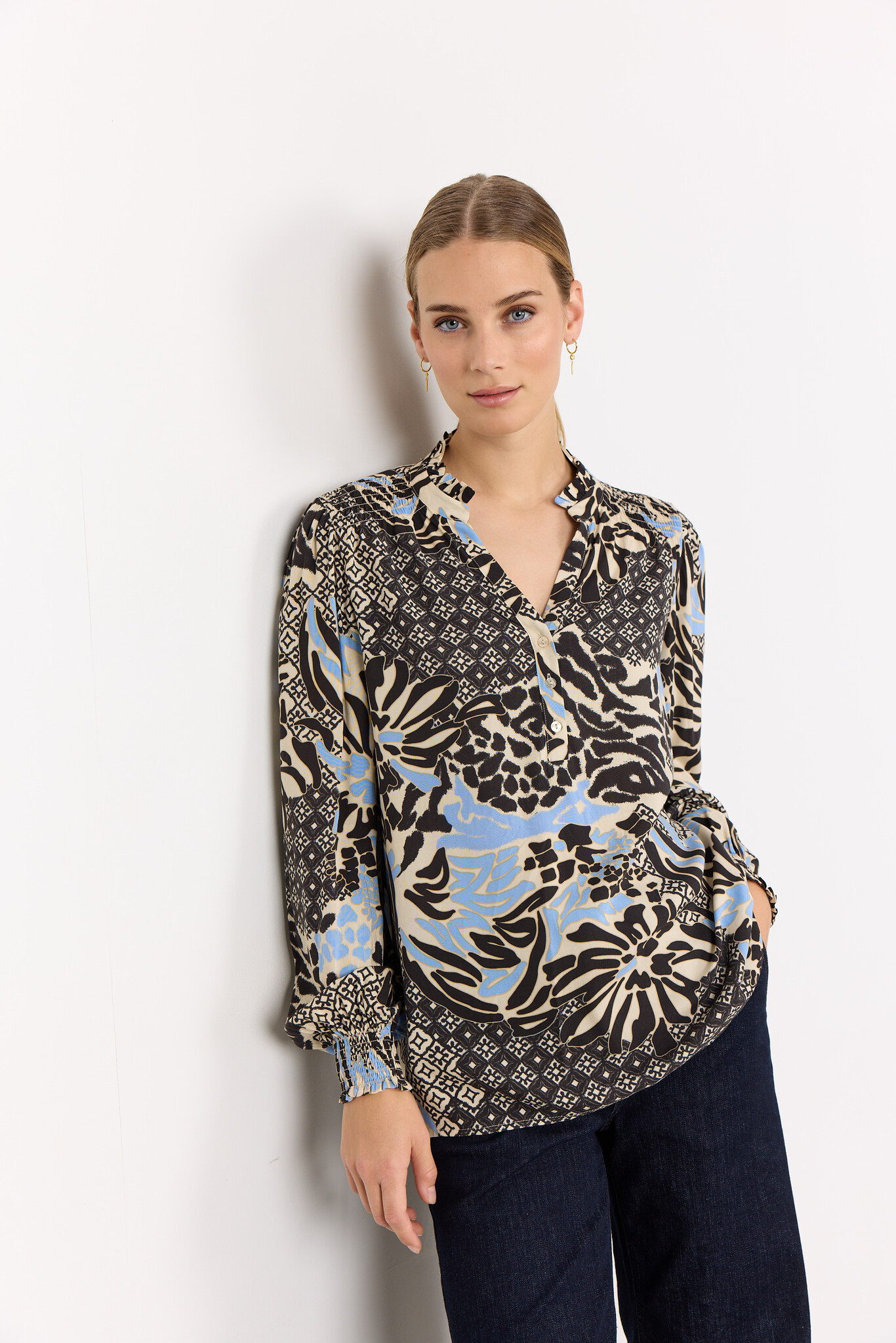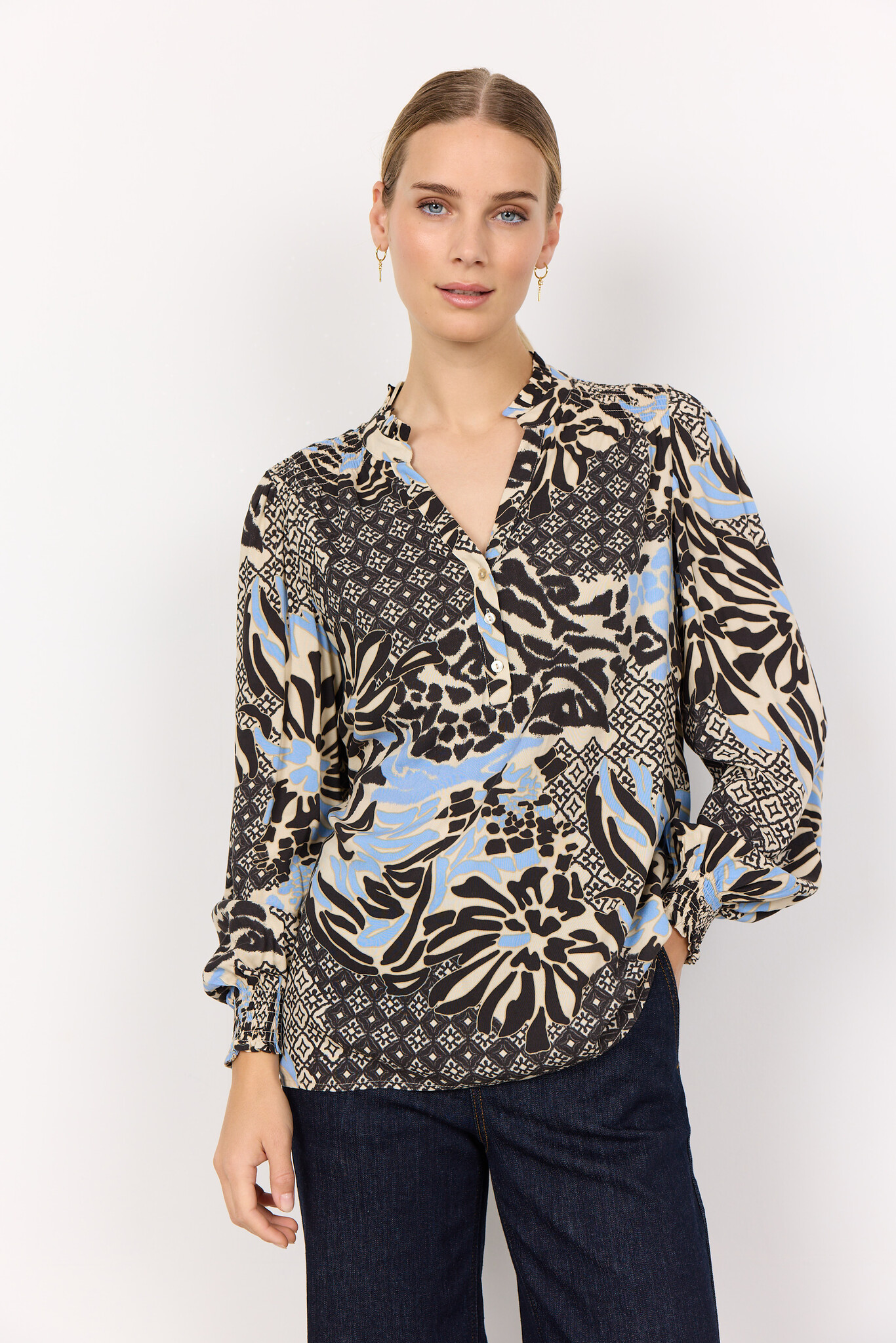 Soyaconcept Olette 1. Soyaconcept Bluse mit langen Ärmeln, Stehkragen mit Schlitz und Allover Print. Die Soyaconcept Bluse hat einen halben Knopfleiste und ist aus nachhaltiger Viskose.
