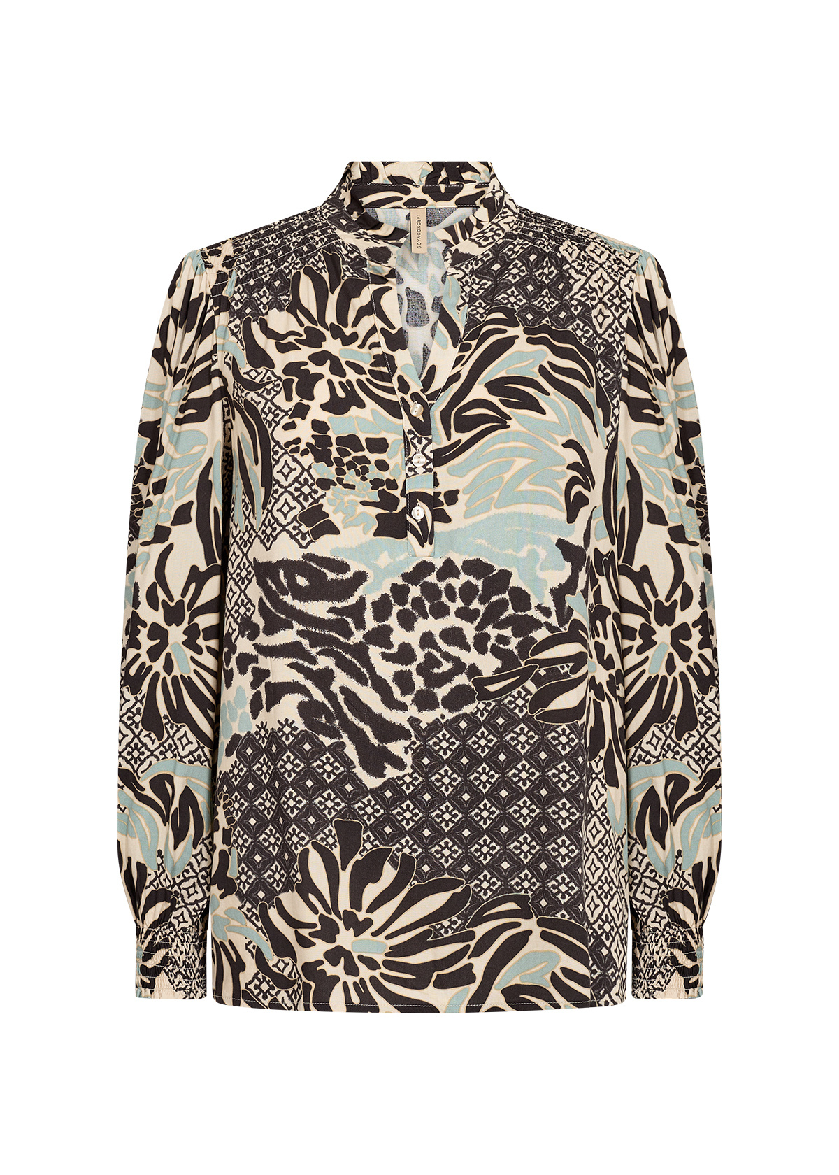 Soyaconcept Olette 1. Soyaconcept Bluse mit langen Ärmeln, Stehkragen mit Schlitz und Allover Print. Die Soyaconcept Bluse hat einen halben Knopfleiste und ist aus nachhaltiger Viskose.