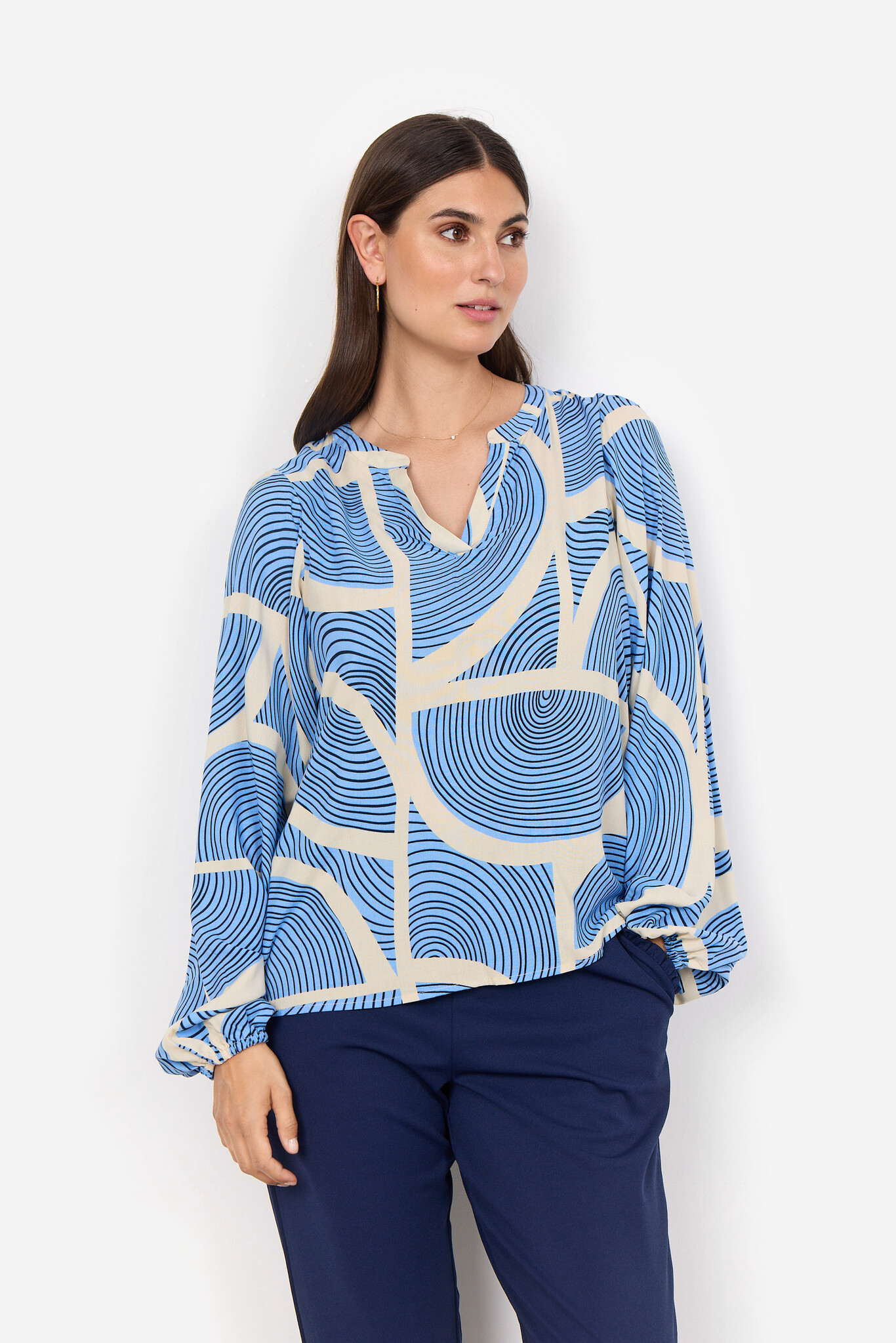 Soyaconcept SC-Olivera 1. Soyaconcept Bluse mit langen Ballonärmeln, ein geschlitzter Rundhalsausschnitt und Allover Print. Die Ärmel sind mit Gummizug. Die Soyaconcept Bluse ist aus nachhaltiger Viskose.