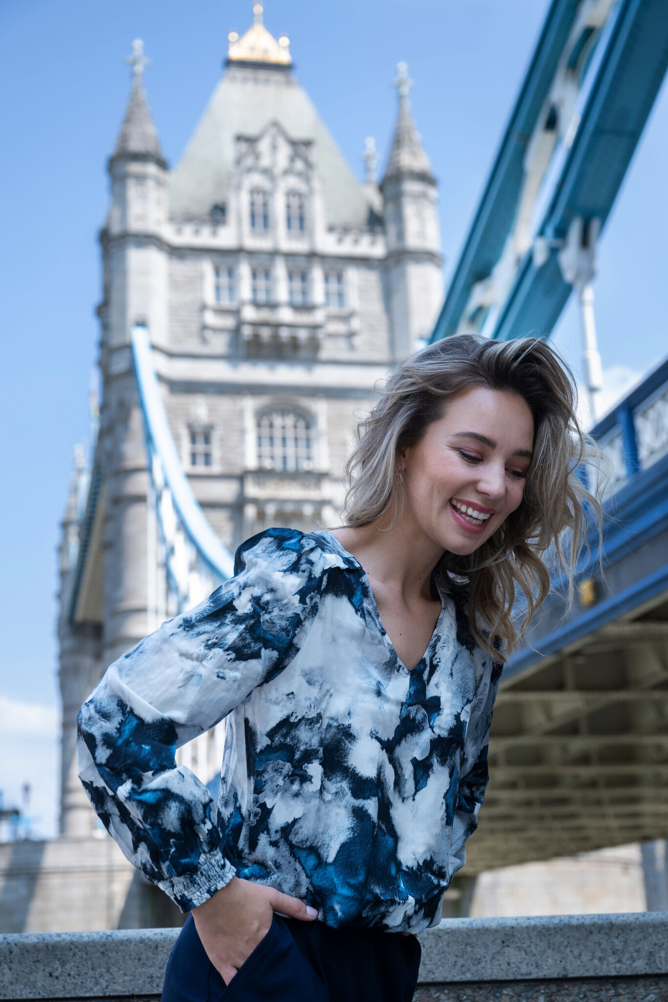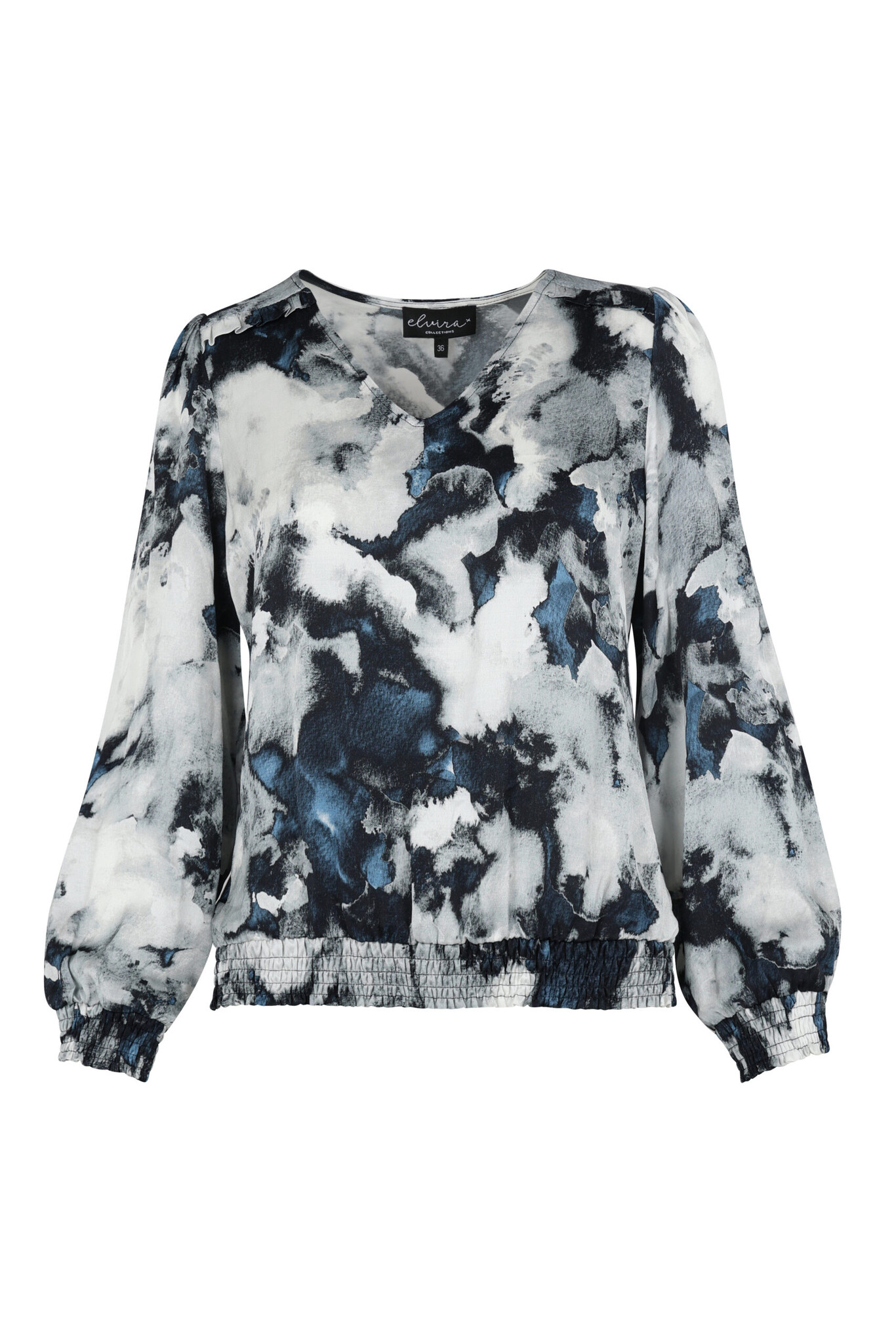Elvira Collections Vivian. Elvira Collections Bluse mit langen Ärmeln, V-Ausschnitt und Allover Print. Die Ärmel und der Saum sind mit elastischen Smoknähten.