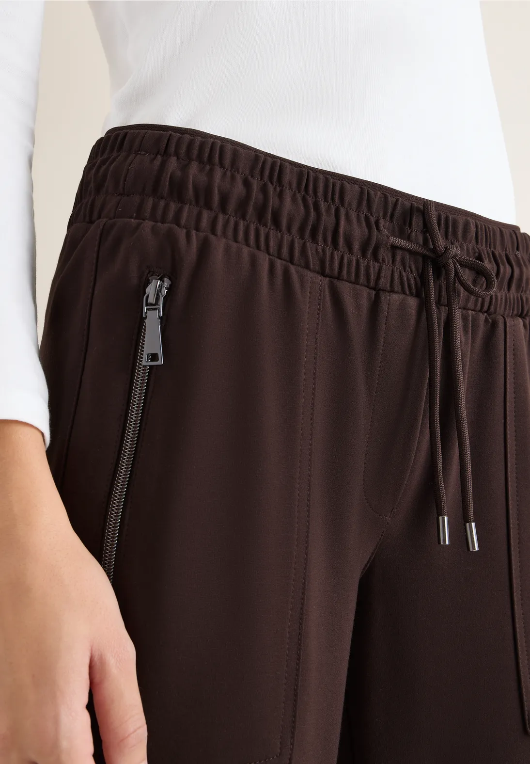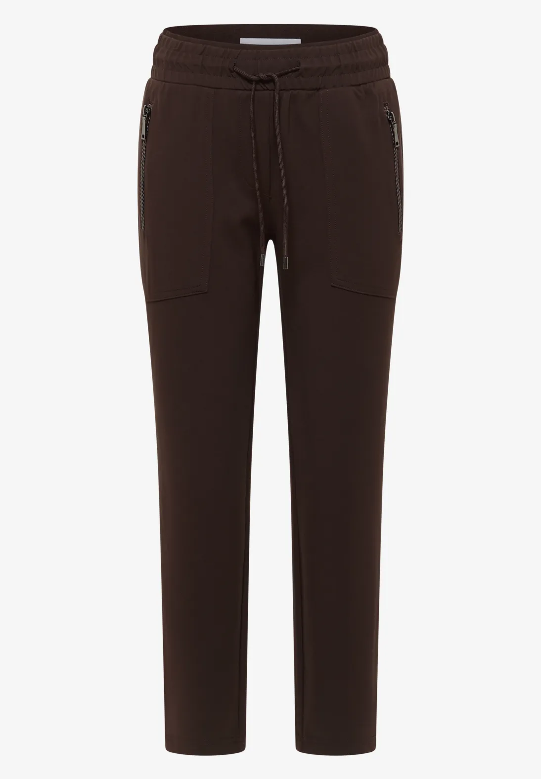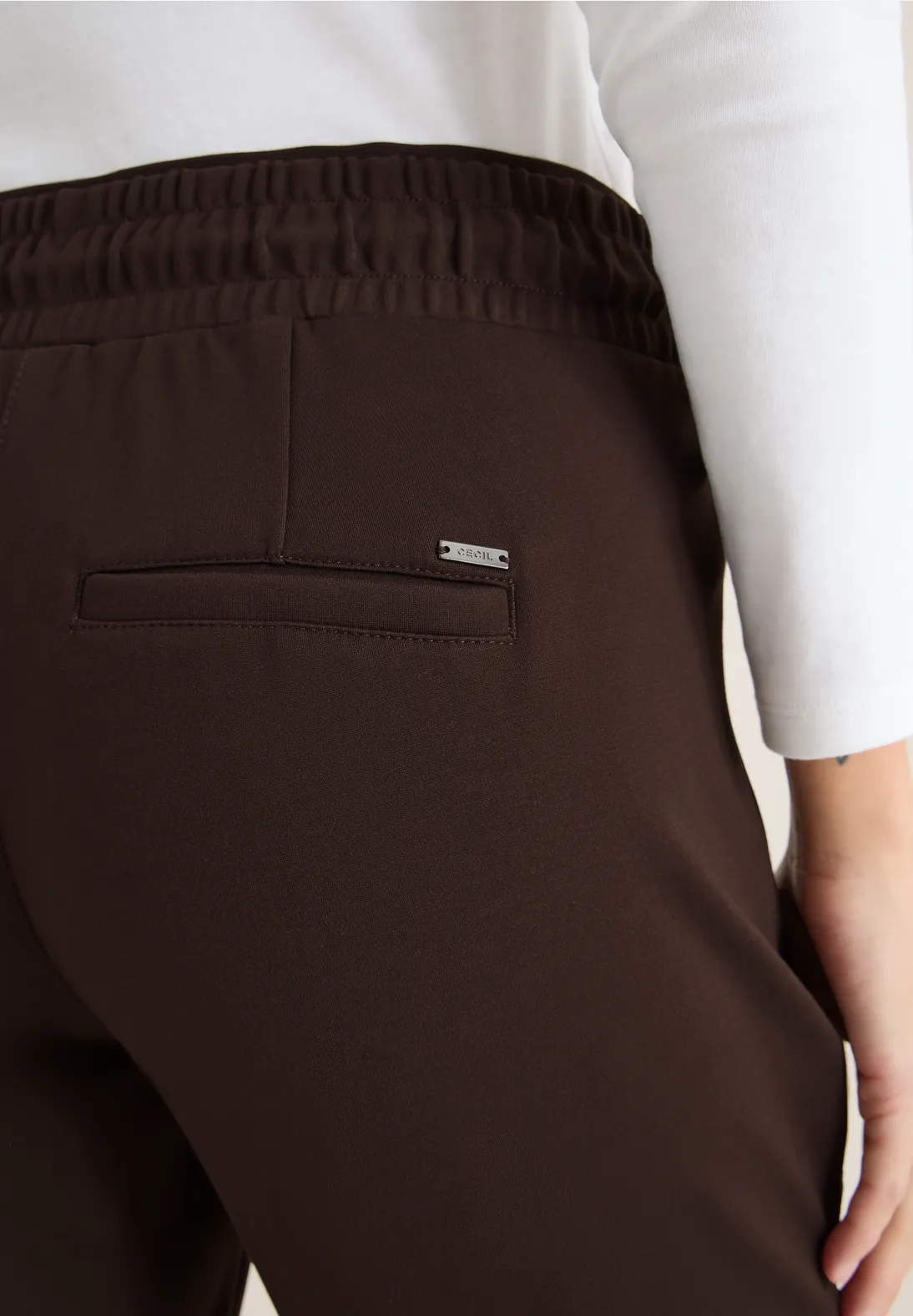 Die Tracey Hose von CECIL in Tartufo Brown ist ein sportliches Essential für den Alltag. Mit Mid Waist, schmalem Bein und einem elastischen Bund mit Kordelzug bietet sie optimalen Tragekomfort und eine moderne Passform. Reißverschlusstaschen sorgen für einen lässigen Look, während der Viskosemix mit Stretchanteil angenehmes Tragen garantiert.