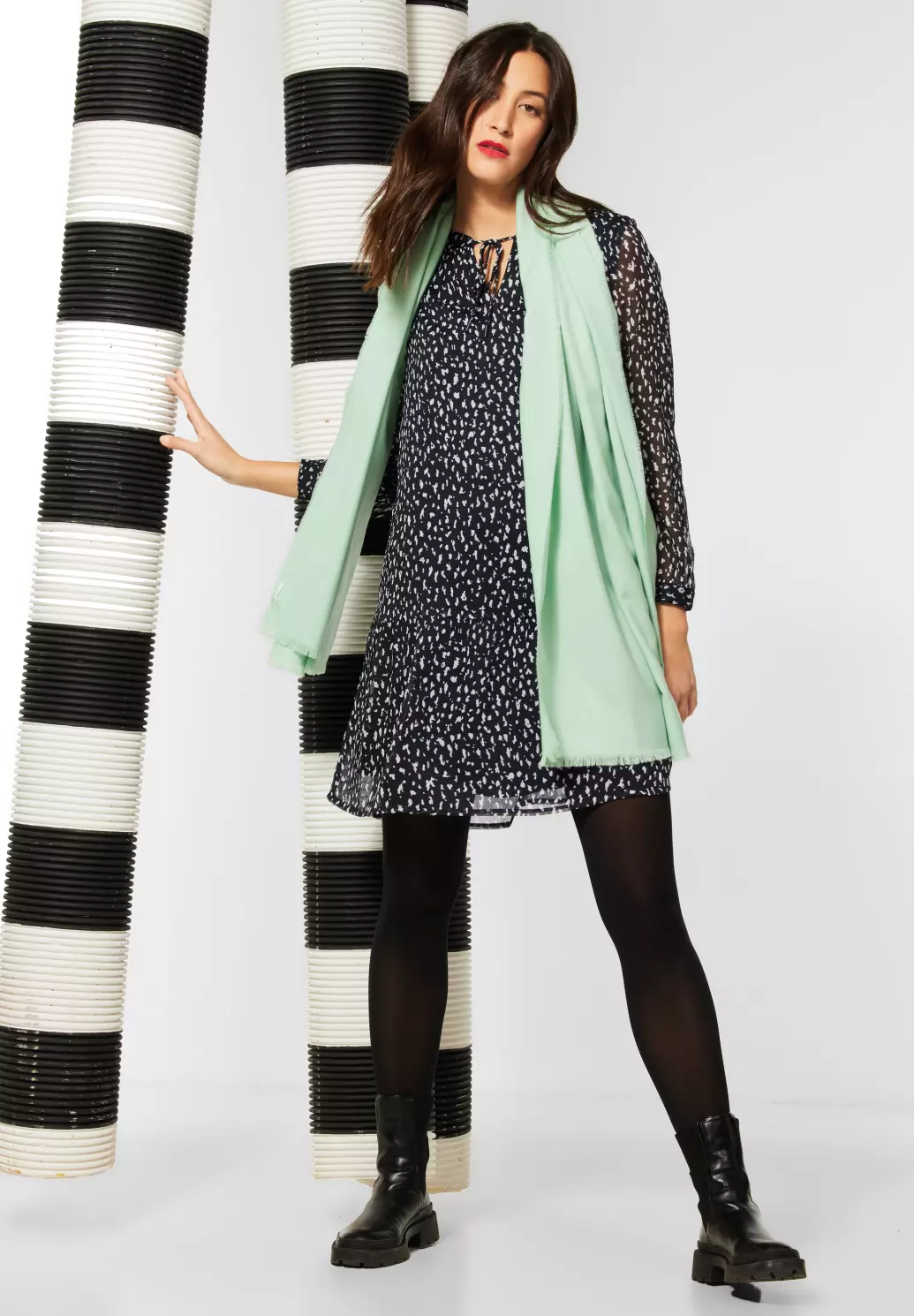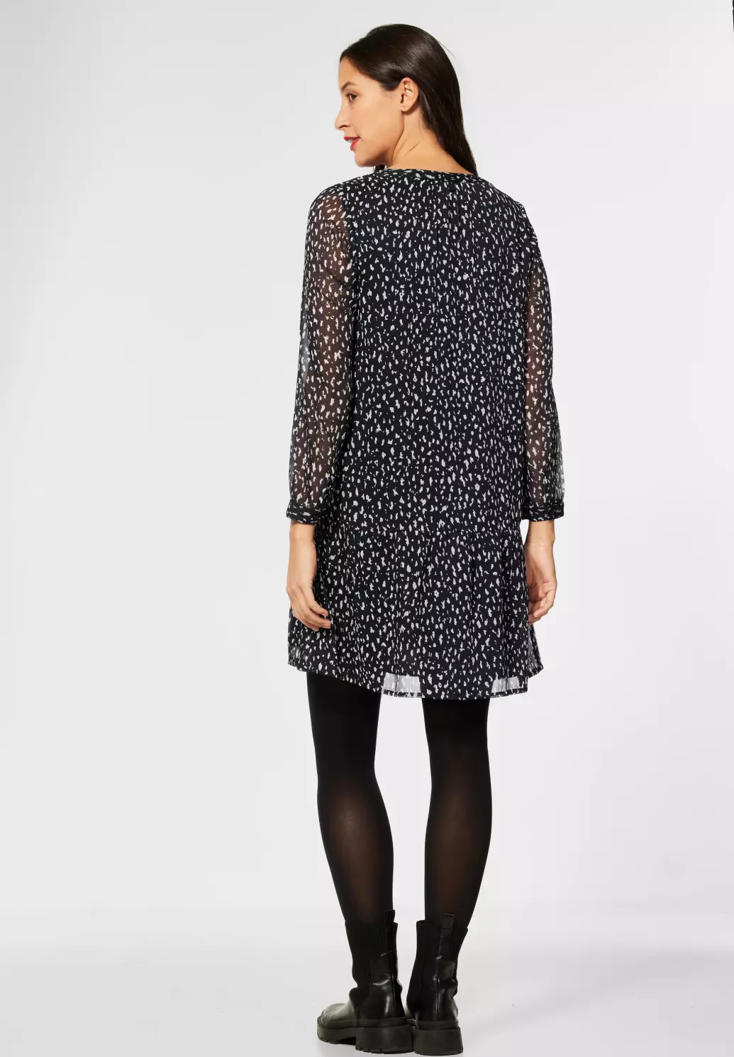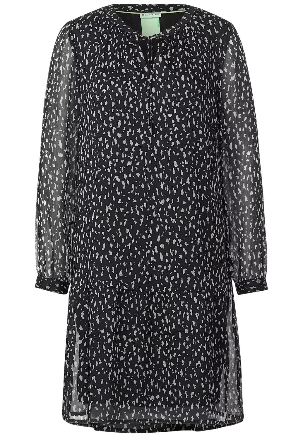 Street One Kleid mit semi-transparenten Ärmeln, V-Ausschnitt mit Tunikaträgern und Allover-Print. Die langen Ärmel sind mit Manschetten. Das Street One Kleid ist aus weichem Chiffon.