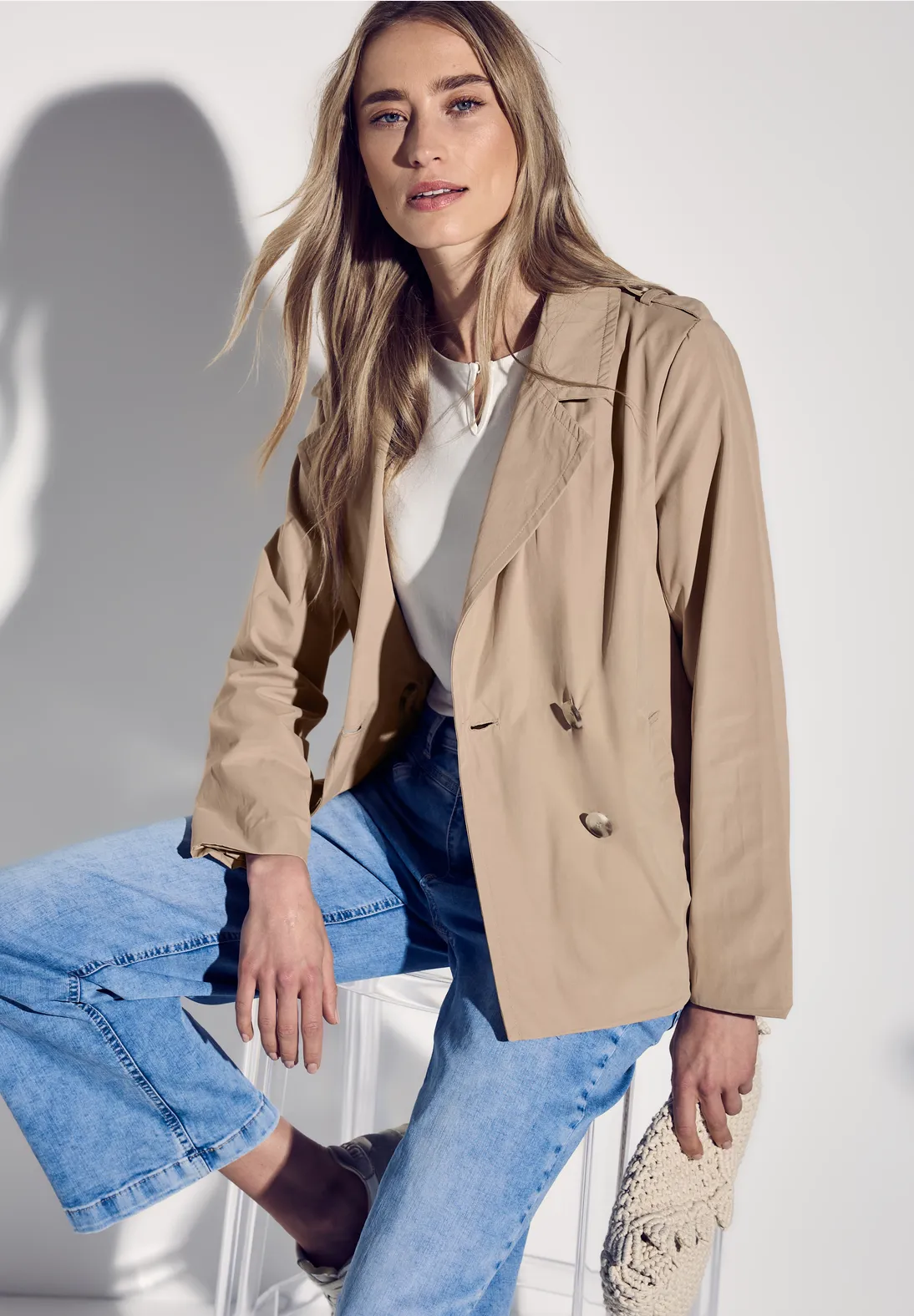 Street One Trenchcoat mit klassischem Reverskragen, seitlichen Taschen und doppelter Knopfreihe.