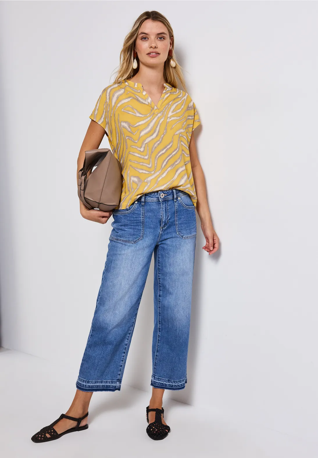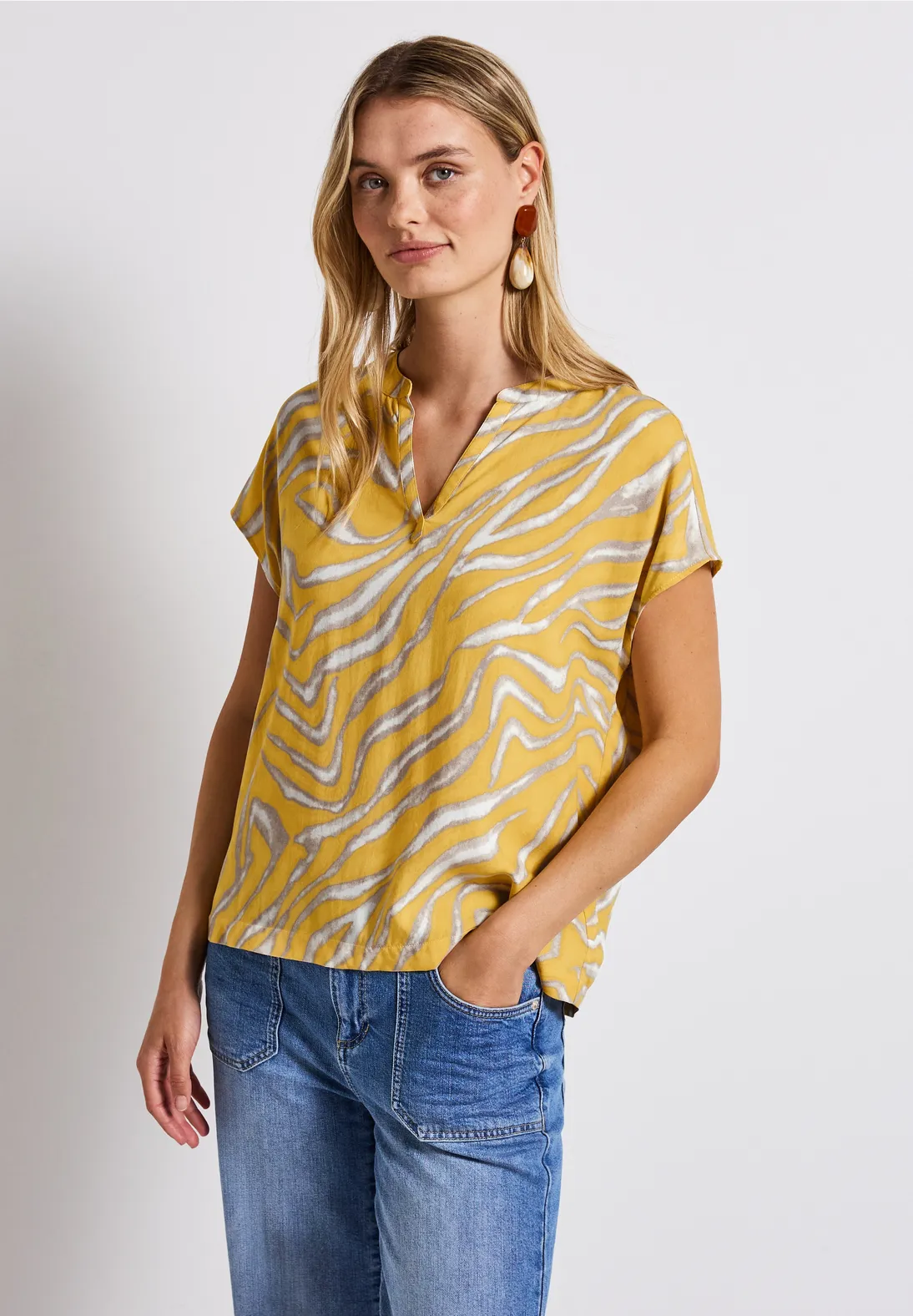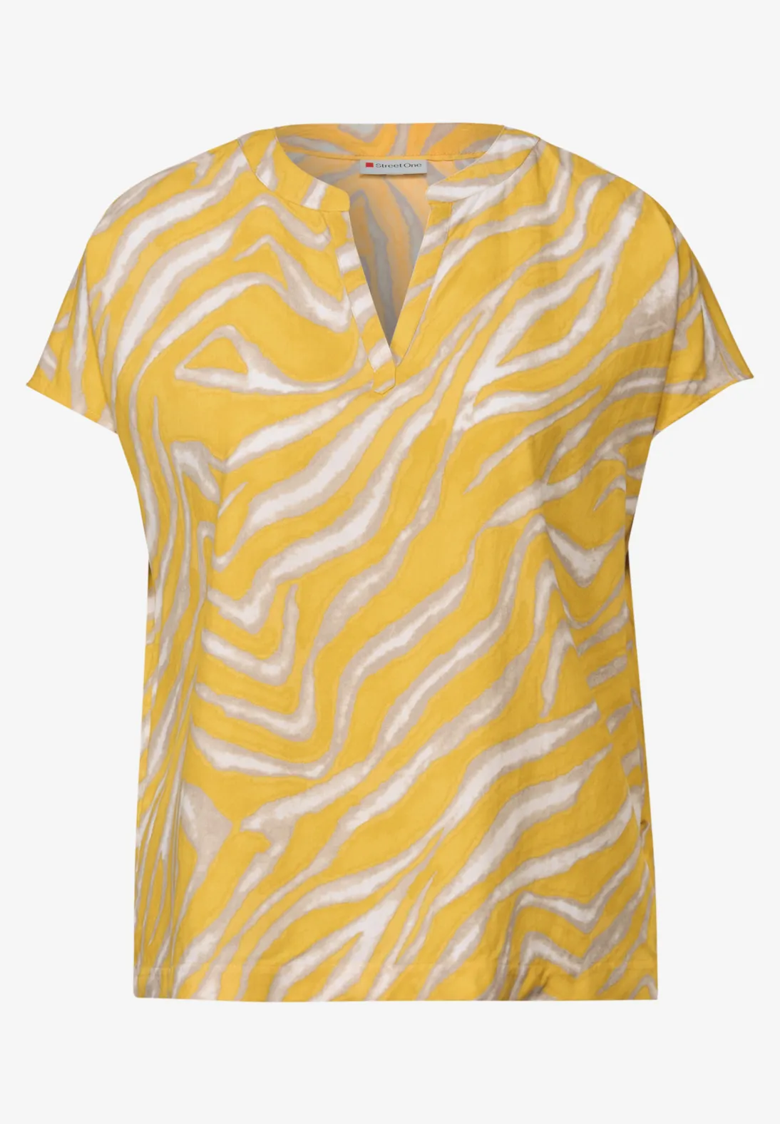 Street One Sommer Bluse mit kurzen Ärmeln, Ausschnitt mit Schlitz und ein grafischem Print. Die Street One Bluse ist aus fließender Viskose.