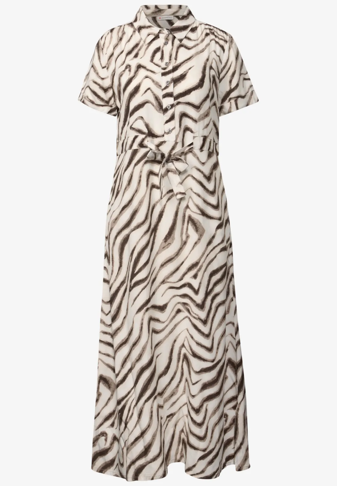 Street One Maxikleid mit kurzen Ärmeln, Kragen und halbem Knopfleiste. Das Street One Kleid kommt mit einen Allover-Print, seitliche Schlitze und einen Kordelzug. Aus weicher Viskose.