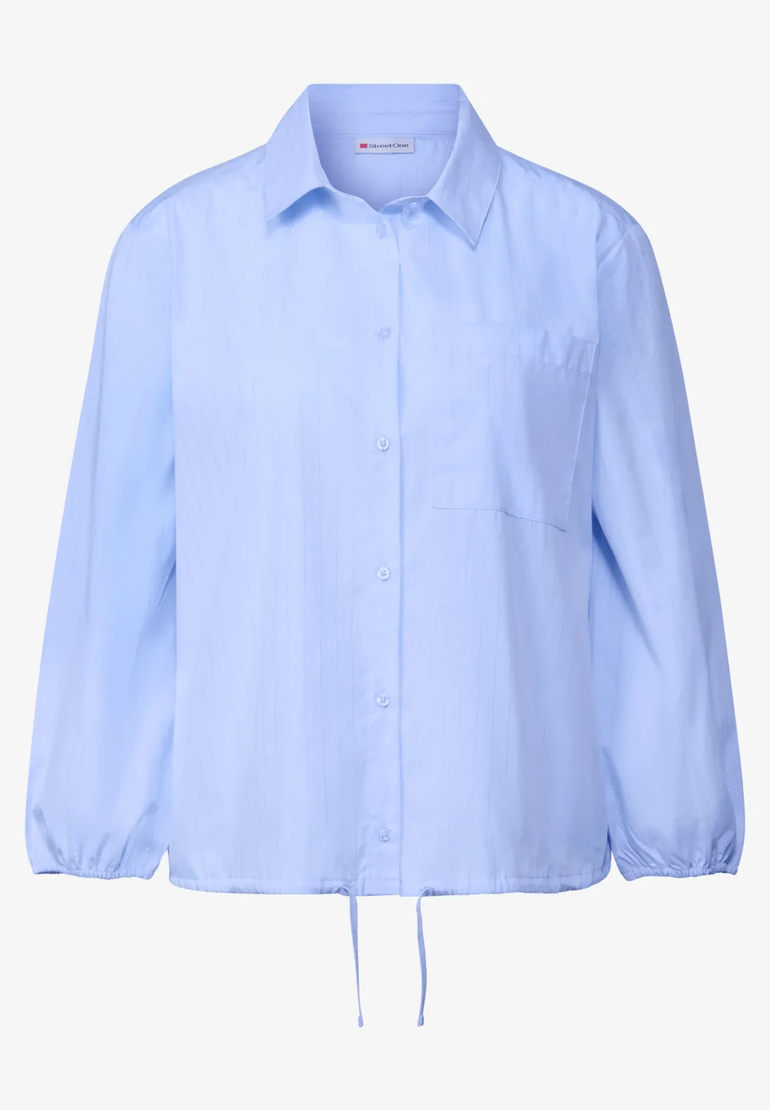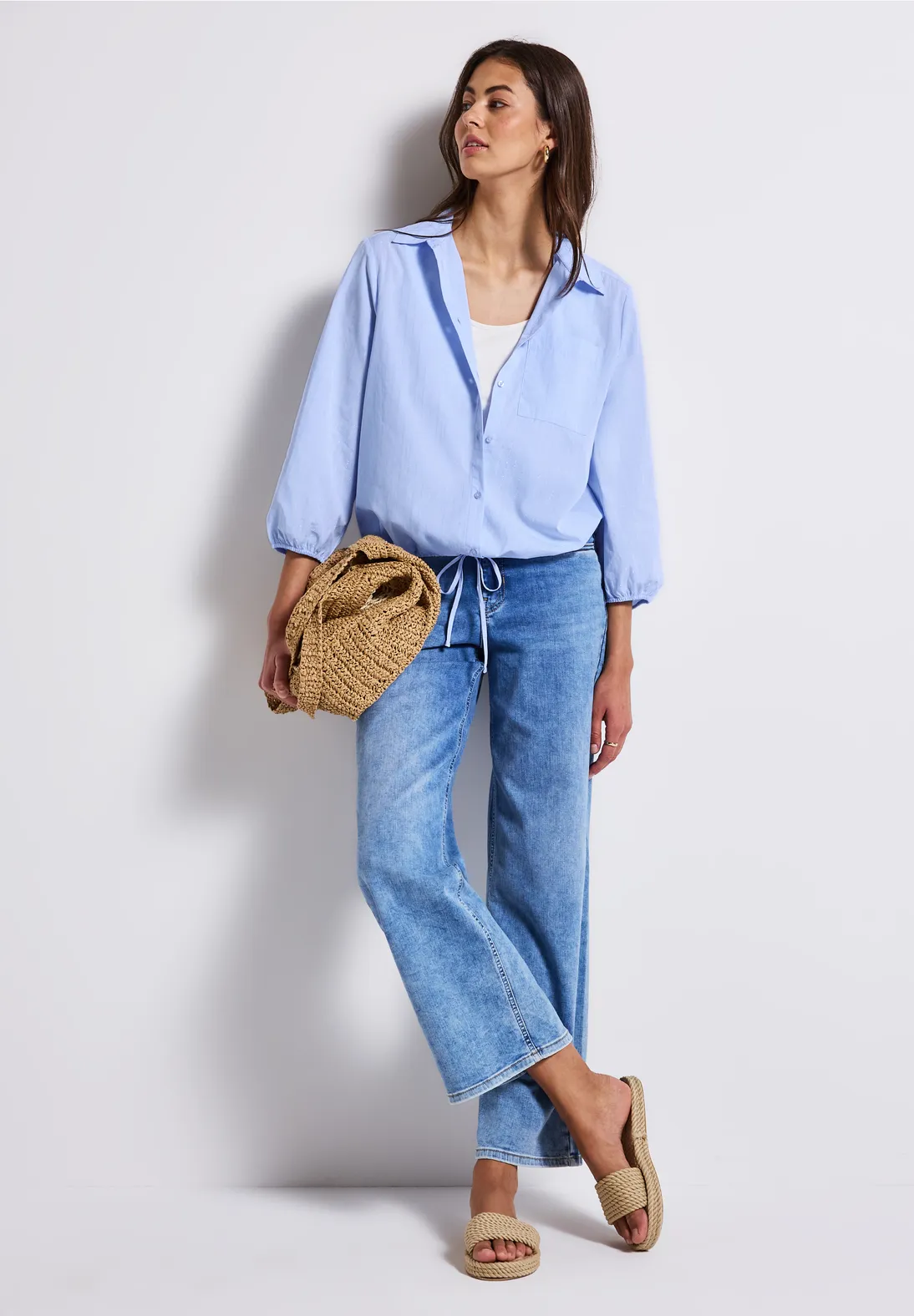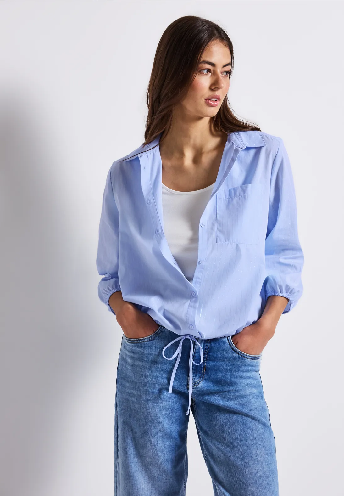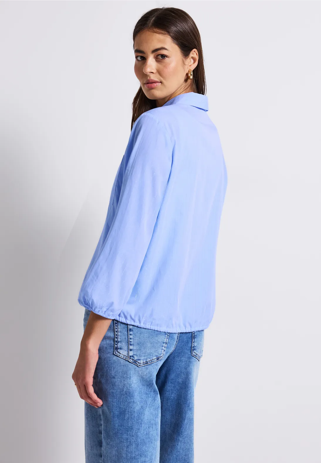 Street One Chambray Bluse mit 3/4-Ärmeln, Hemdkragen und Glitzerdetails. Die Street One Bluse hat einen langen Knopfleiste, elastische Manschetten und Tunnelzugsaum. Die Brusttasche rundet den Look perfekt ab.