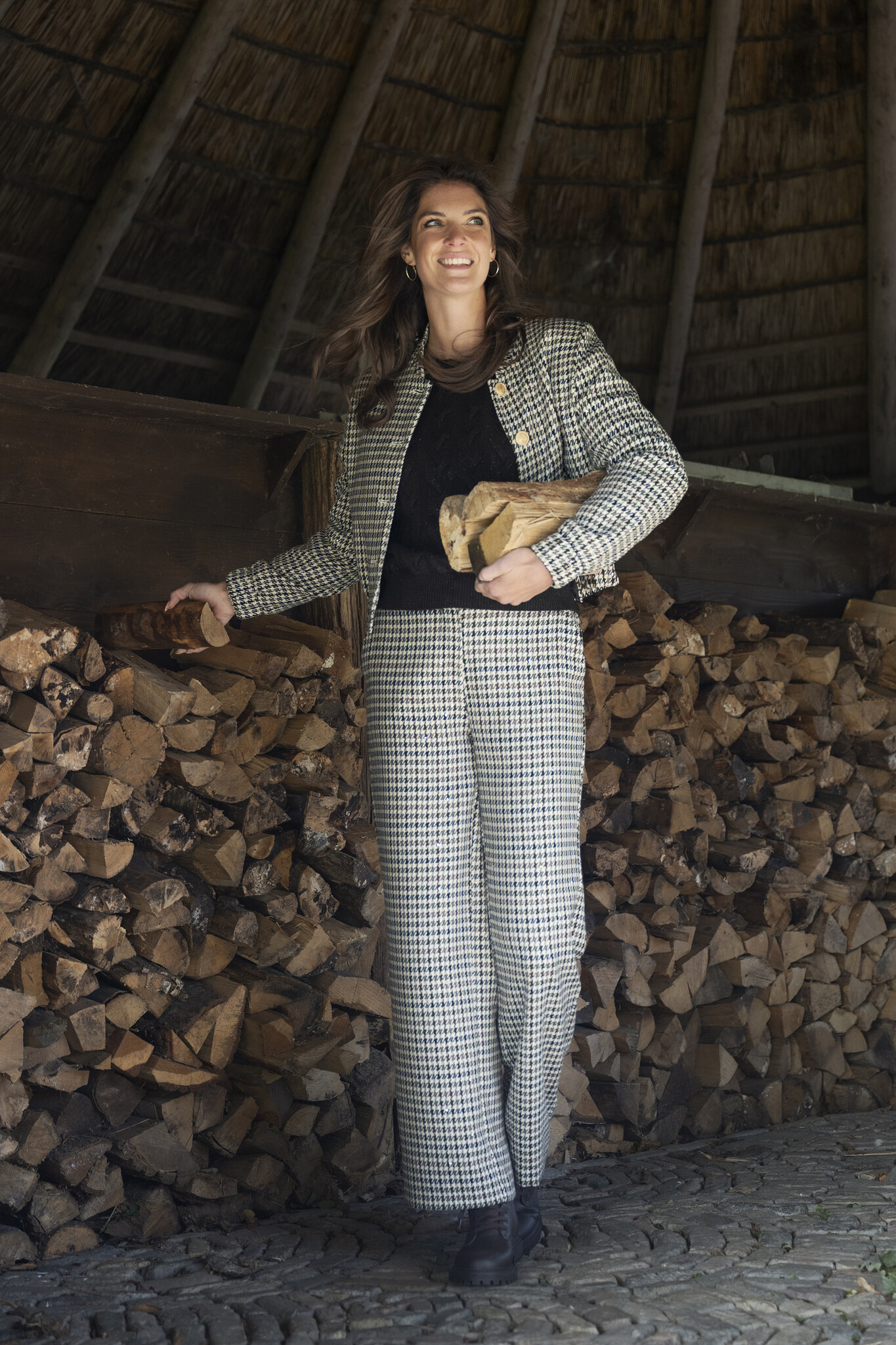 Die Elvira Collections Hose Maud in Checked Green besticht durch ein stilvolles mehrfarbiges Karomuster in Grün- und Brauntönen auf hellem Grund, verziert mit hier und da glitzernden Pailletten für einen dezenten Schimmer. Die Hose mit hoher Taille und weitem Bein vereint Komfort mit modernem Stil. Ausgestattet mit praktischen Eingrifftaschen und einem Hakenverschluss mit Reißverschluss und Knopf. Ideal in Kombination mit der passenden Bomberjacke Maud für einen kompletten Look.