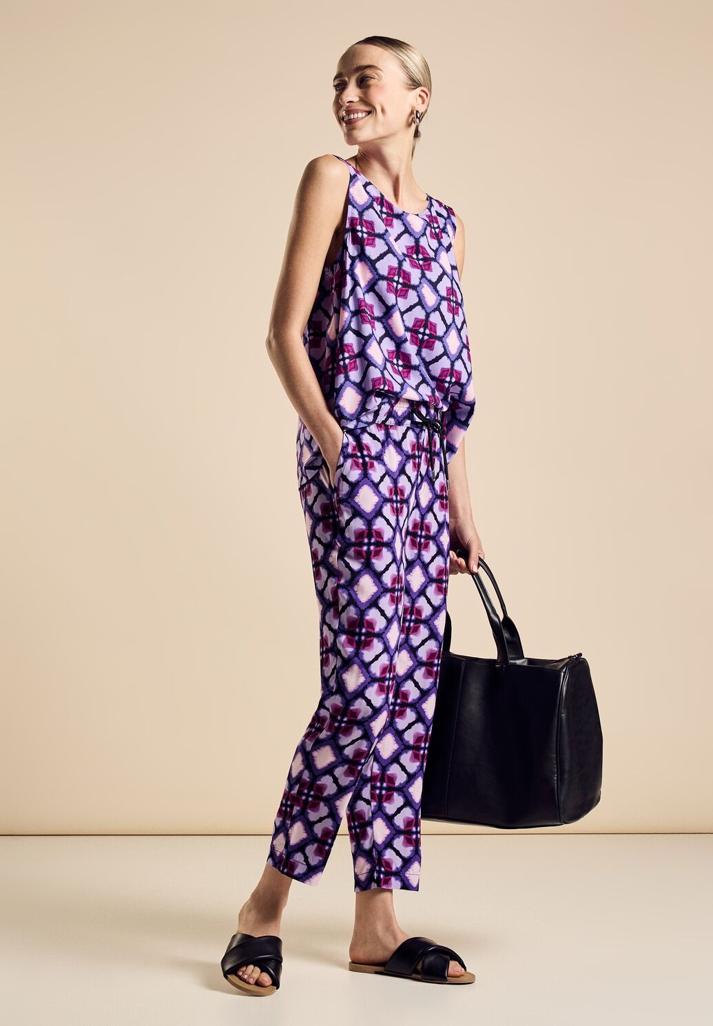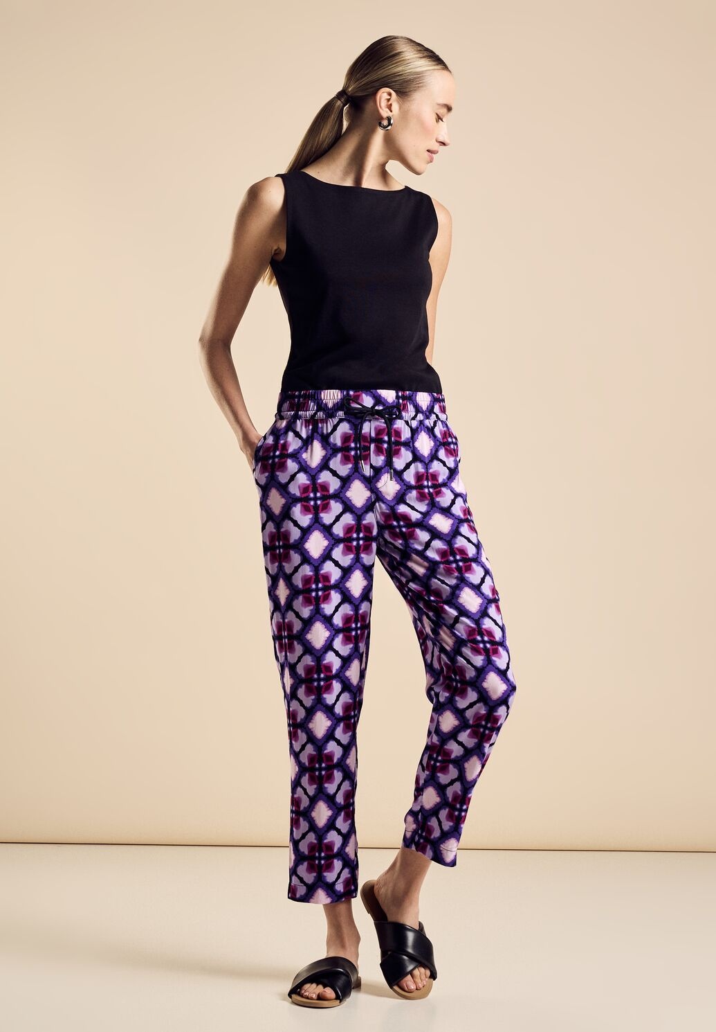 Street One Bonny. Street One Hose mit Loose Fit, mittelhoher Taille und schlanken Beinen. Die bequeme Street One Hose kommt mit Allover Print und Elastikbund.