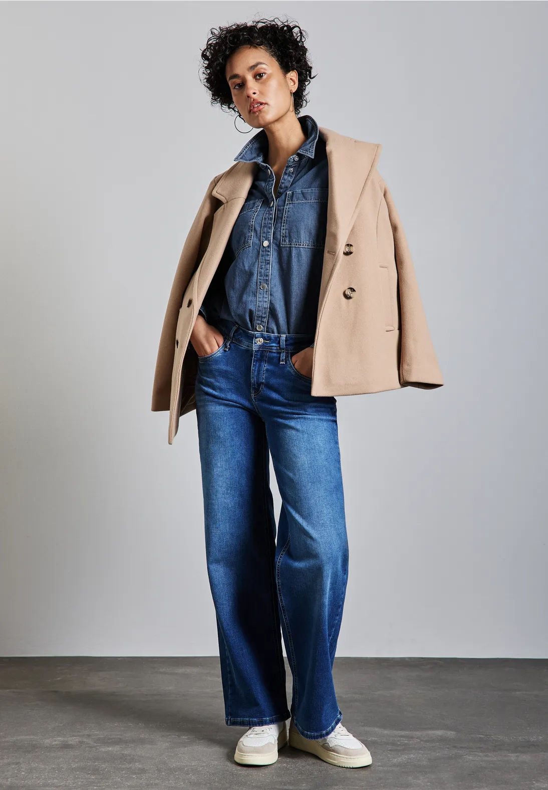 Kurzes Street One Hemd mit langen Ärmeln, Kragen und Brusttaschen. Die Street One Bluse ist aus reiner Baumwolle. Die langen Ärmel sind mit Manschetten und einem Knopf versehen.