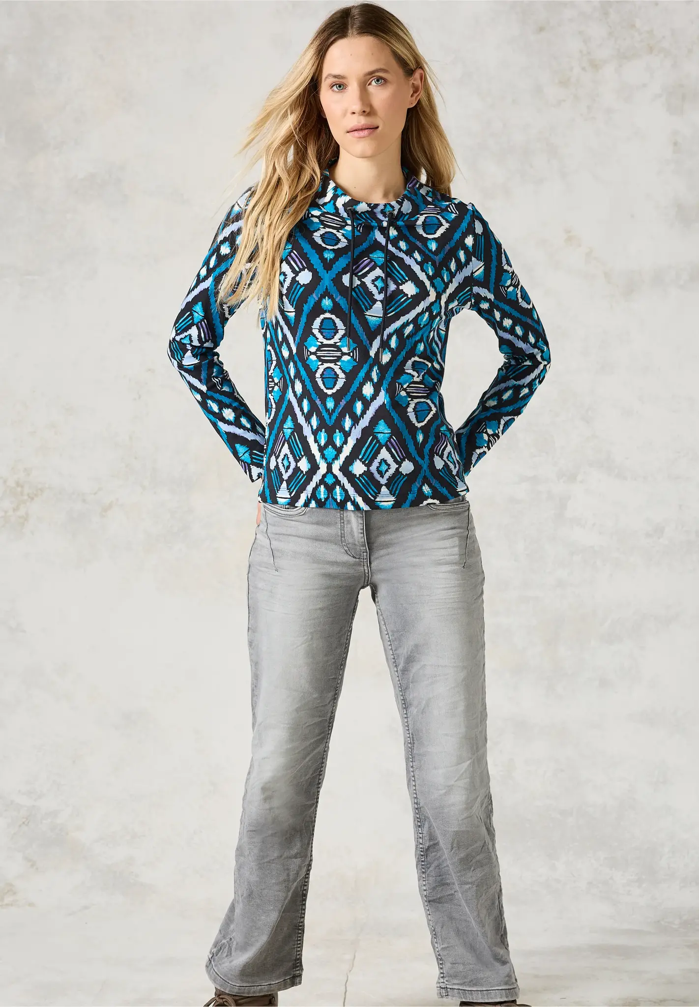 Cecil Shirt mit langen Ärmeln, Kragen mit Kordelzug und Grafikprint. Das Cecil Shirt ist aus reiner Baumwolle.