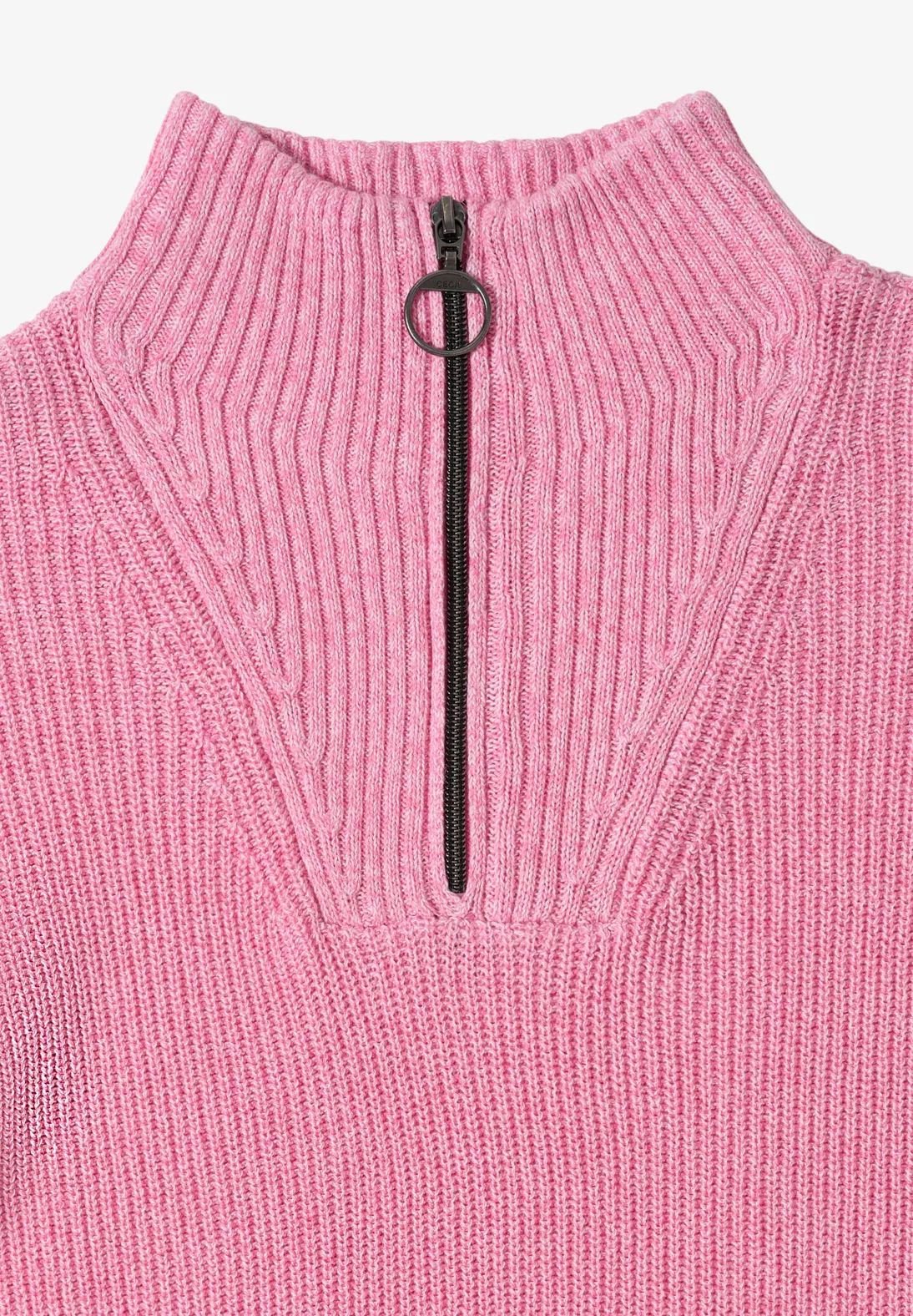 Der Mouliné-Strickpullover von CECIL in der Farbe Dark Blossom Melange kombiniert sportliche Elemente mit femininen Details. Die Troyer-Kragenform und die seitlichen Schlitze verleihen dem Look eine moderne Note, während reines Baumwollmaterial (100 % Baumwolle) für ein angenehmes, natürliches Tragegefühl sorgt. Gerippte Ärmelabschlüsse runden das Design stilvoll ab – perfekt für den Alltag oder gemütliche Momente.