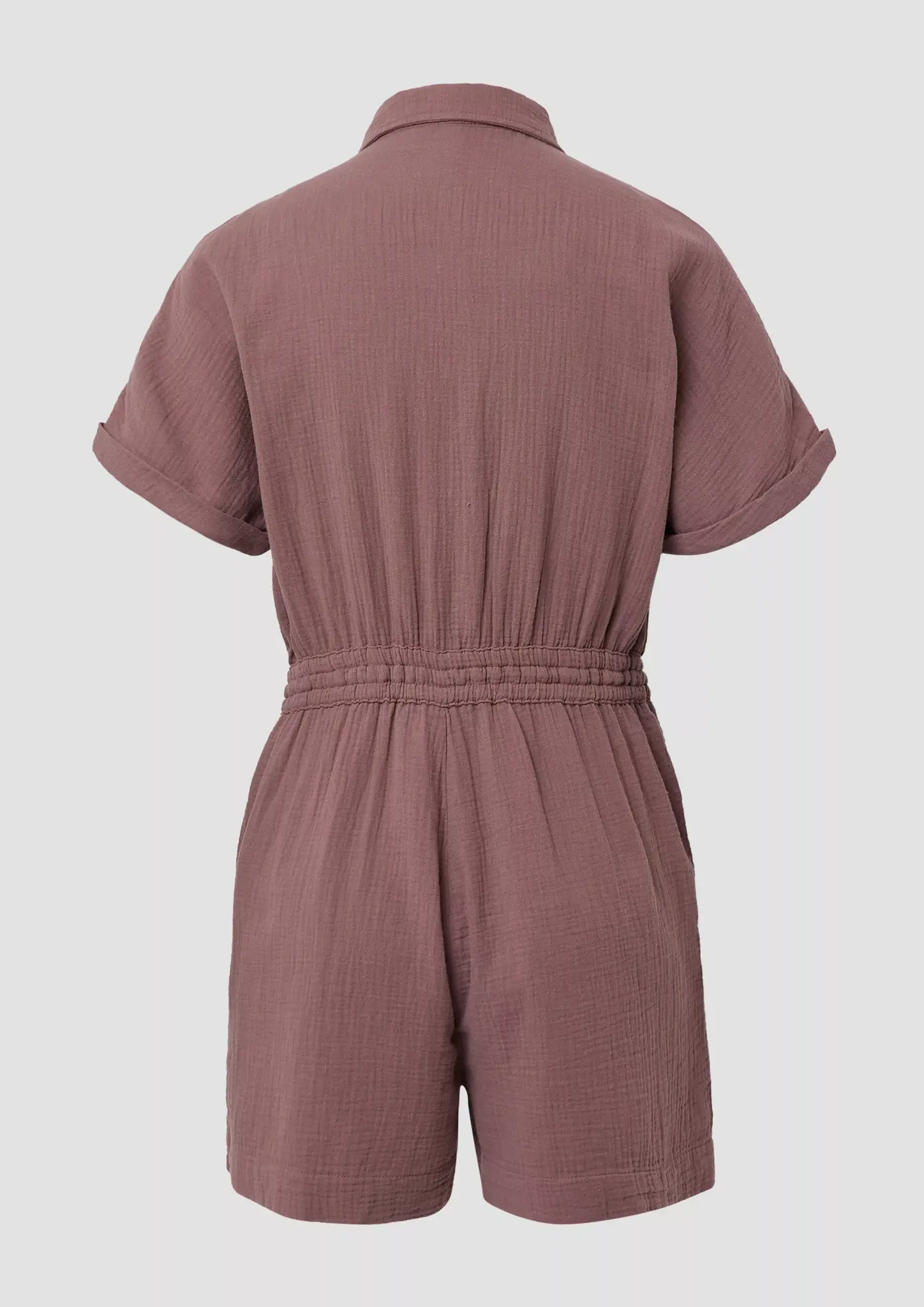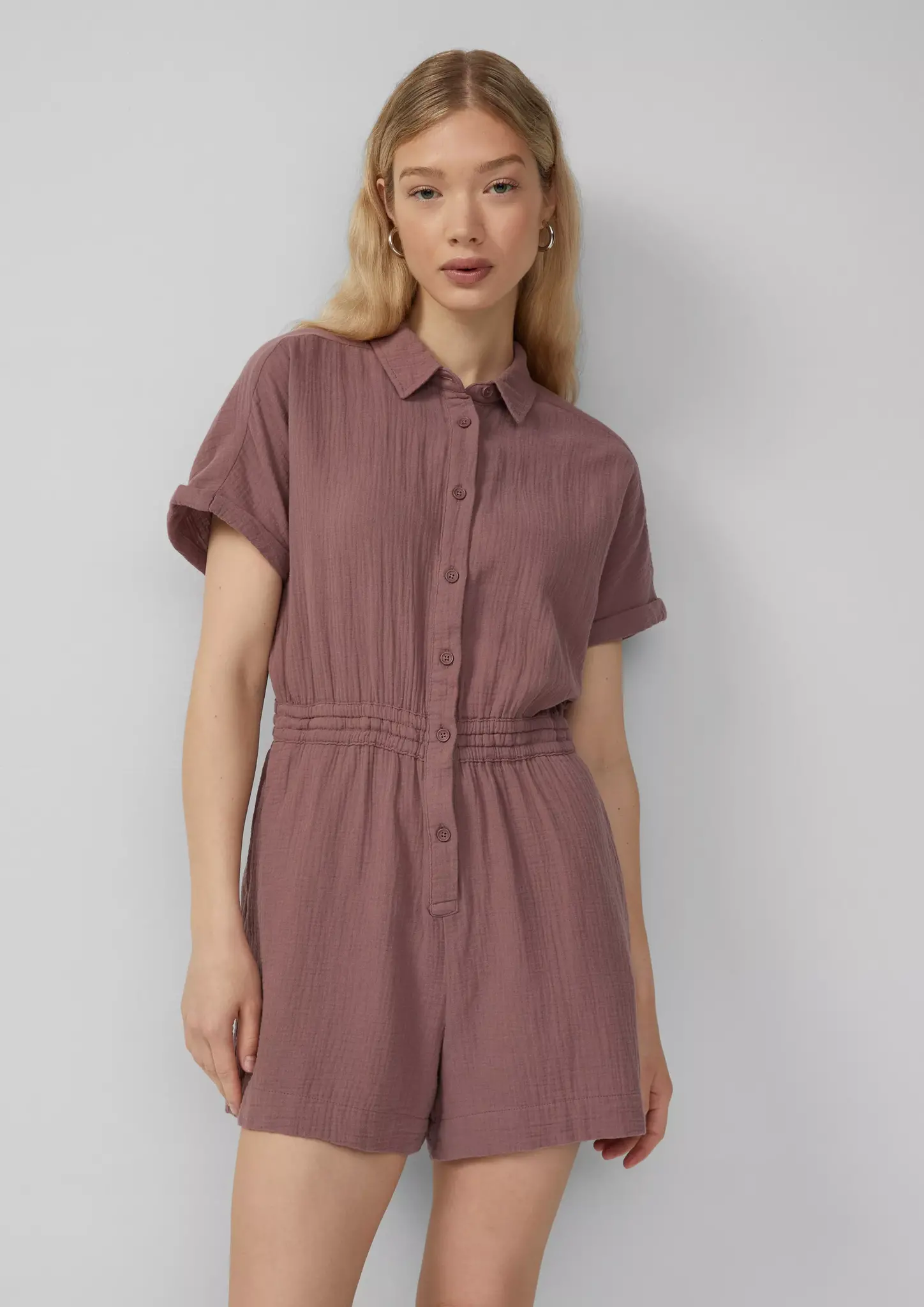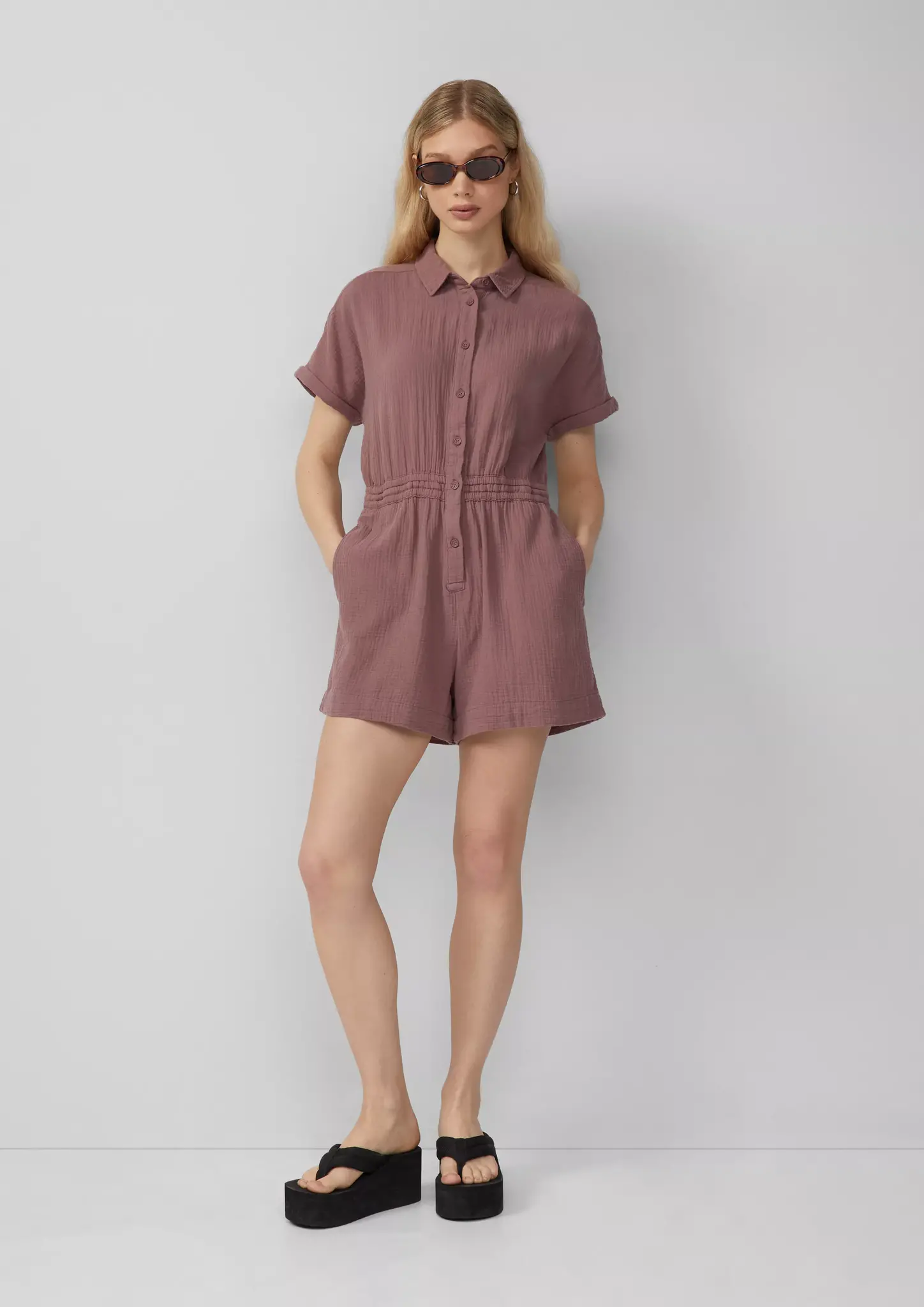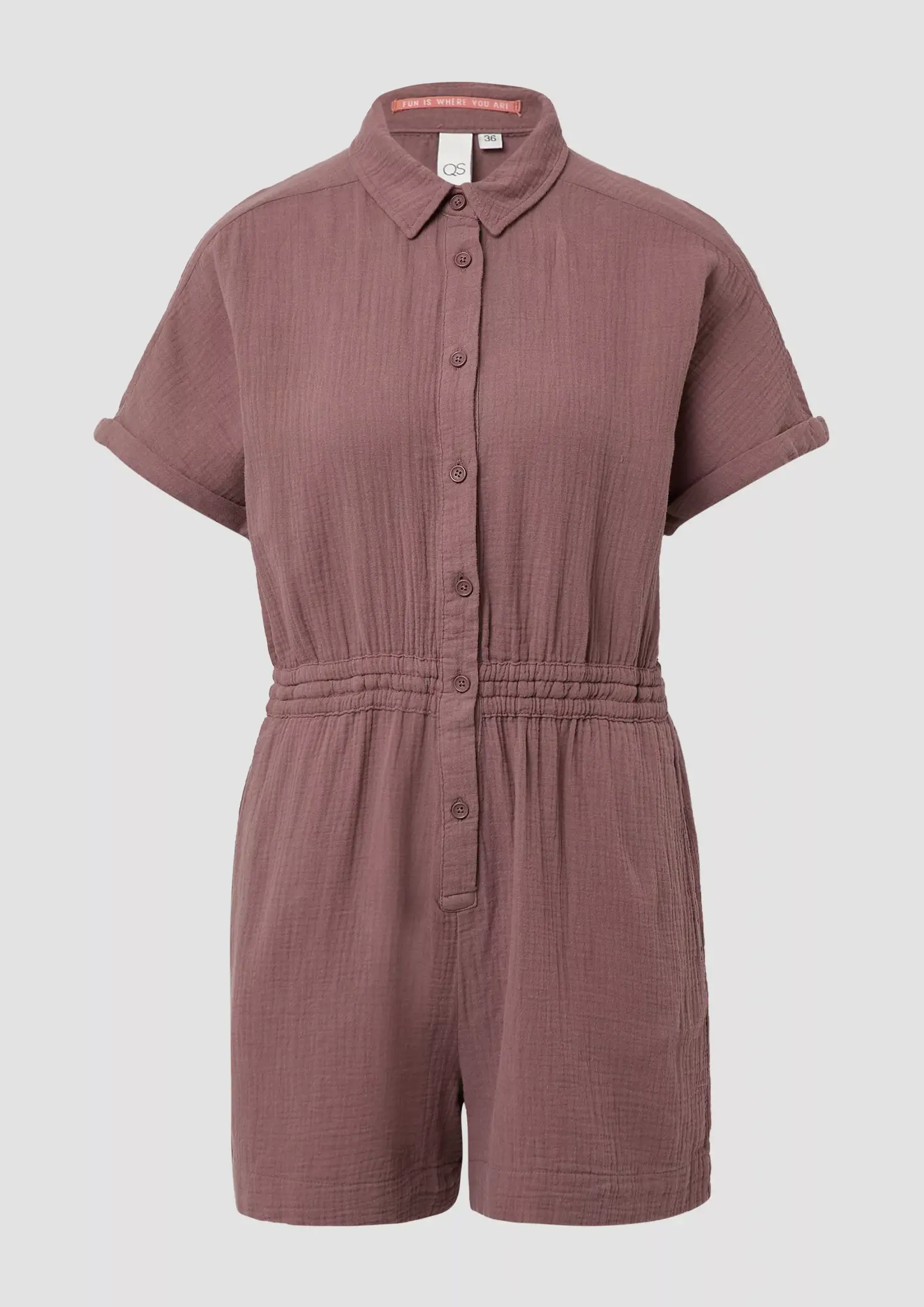 QS by S. Oliver Jumpsuit mit kurzen Ärmeln, Kragen und elastischer Taille. Dieser QS Overall hat einen halben Knopfleiste und ist aus weichem Musselinstoff.
