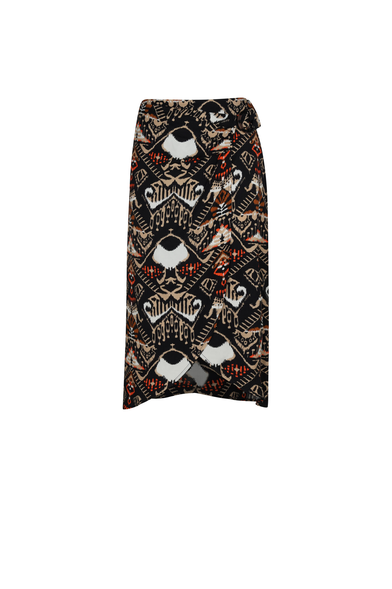 Elvira Collections Ivy. Langer Elvira Collections Rock mit Allover Print. Die Umschlag an der Vorderseite verlaufen diagonal von der Taille bis zum Saum auf der Vorderseite. Der Rock kommt mit ein Zipper hinten und dekorative Schnalle.