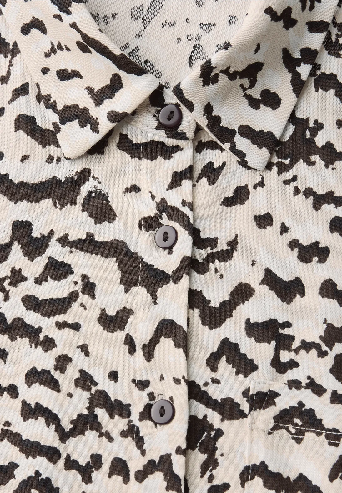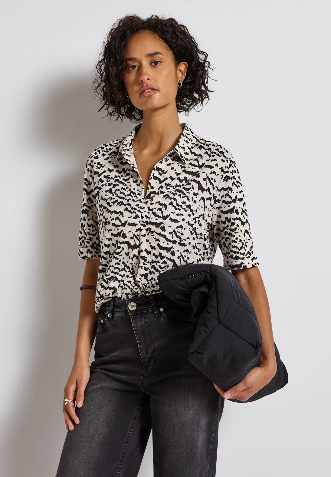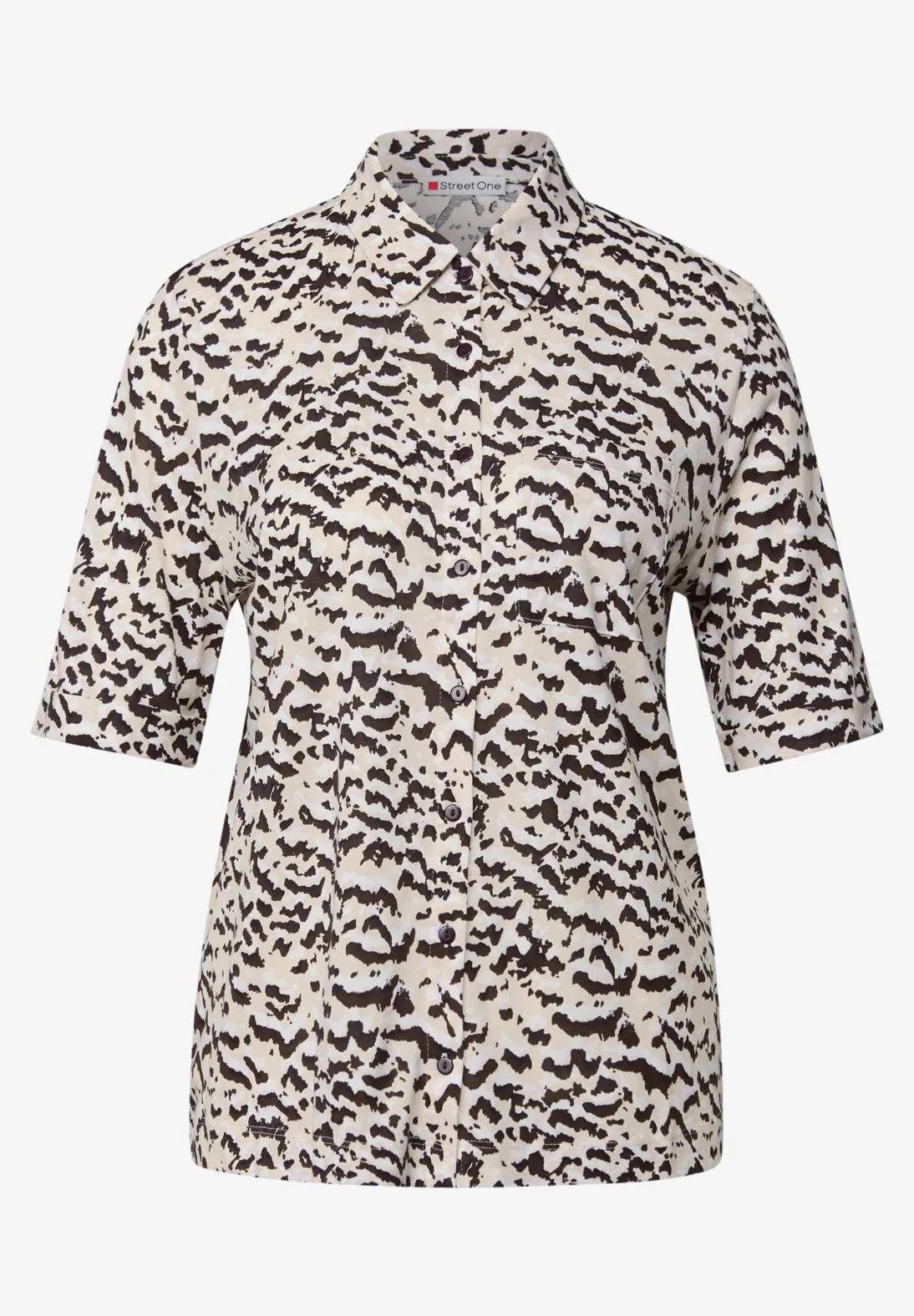 Street One Shirt mit kurzen Ärmeln, Hemdkragen und langer Knopfleiste. Das Street One Shirt kommt mit einen Grafikprint, eine Brusttasche und einen stylischen Blusenlook mit dem Tragekomfort eines T-Shirts.