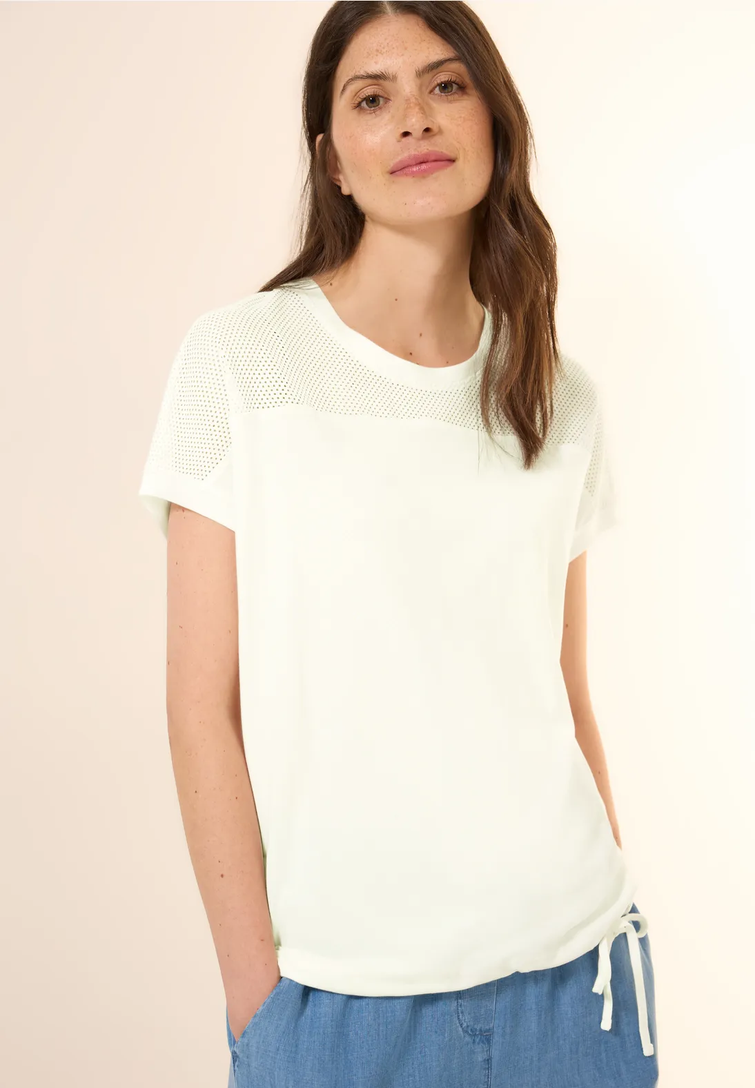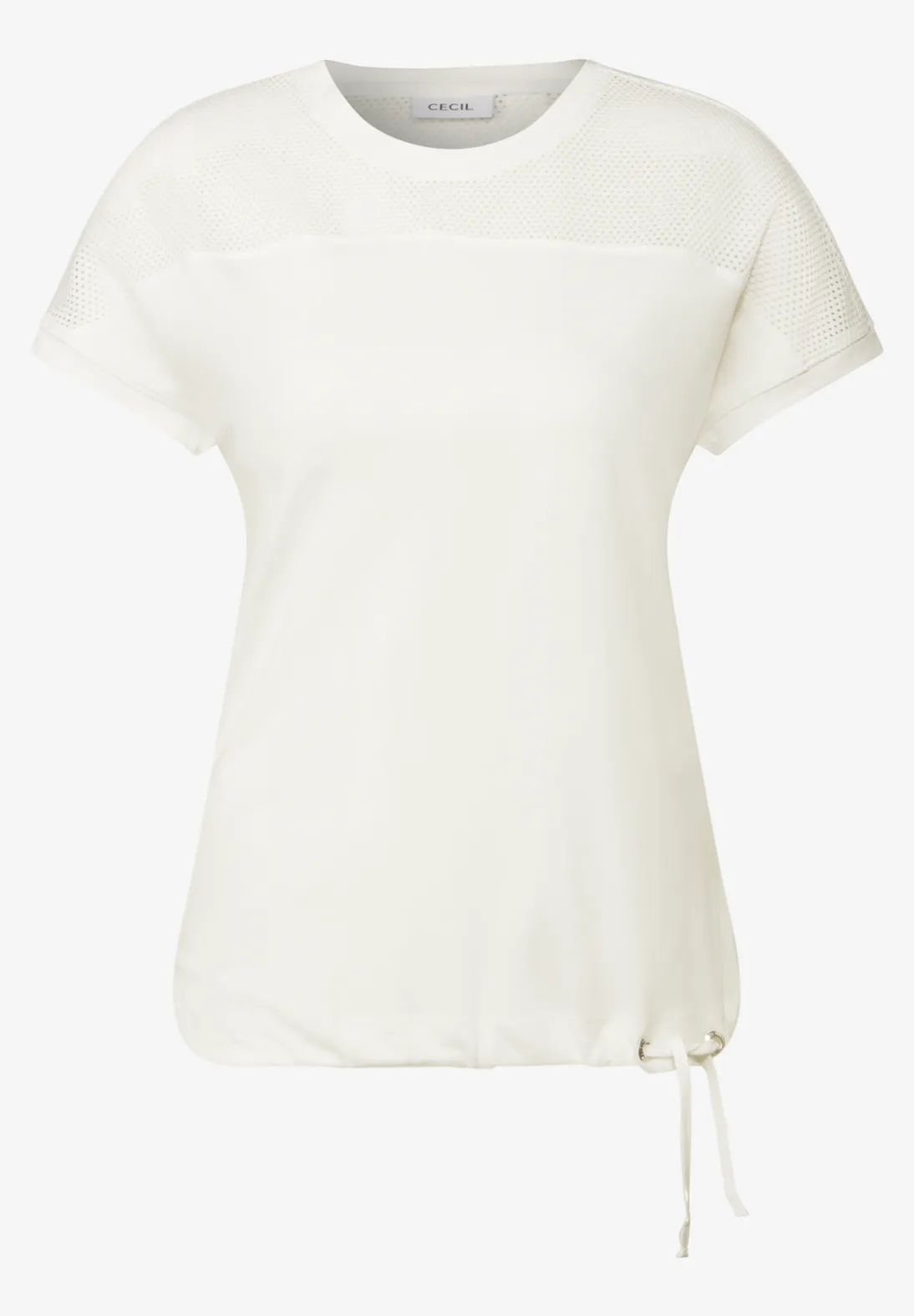 Cecil Shirt mit kurzen Ärmeln, Rundhalsausschnitt und modernem Mesh-Detail. Das Cecil Shirt hat eine lässige Passform mit einem Kordelzug im Saum. Aus einer weichen Baumwoll-Modal-Mix.