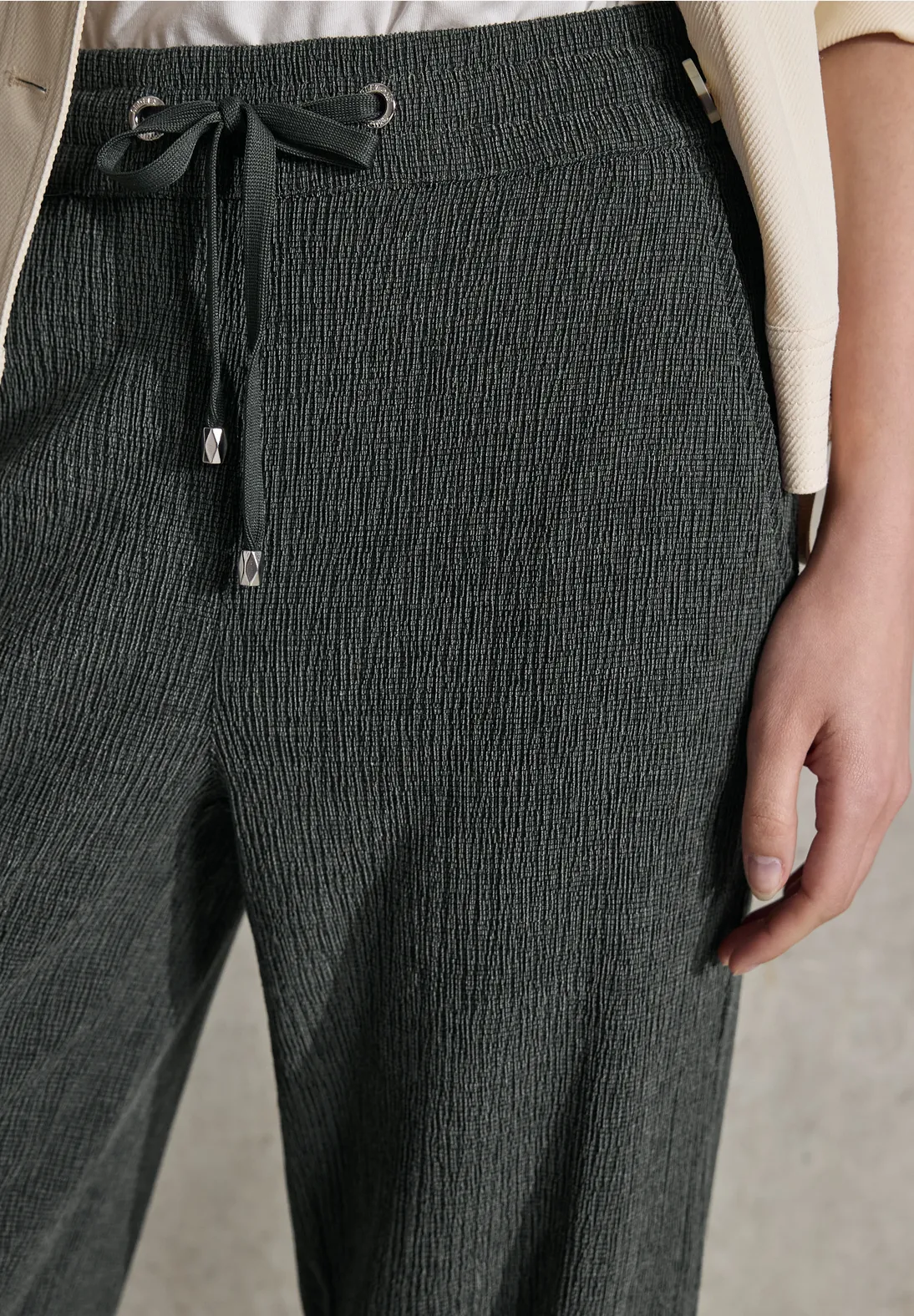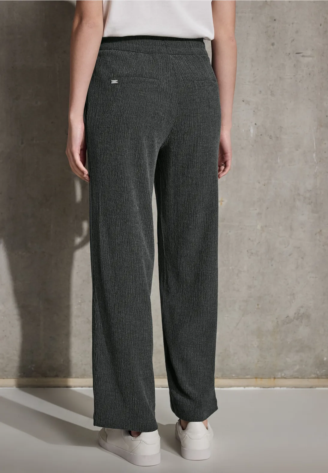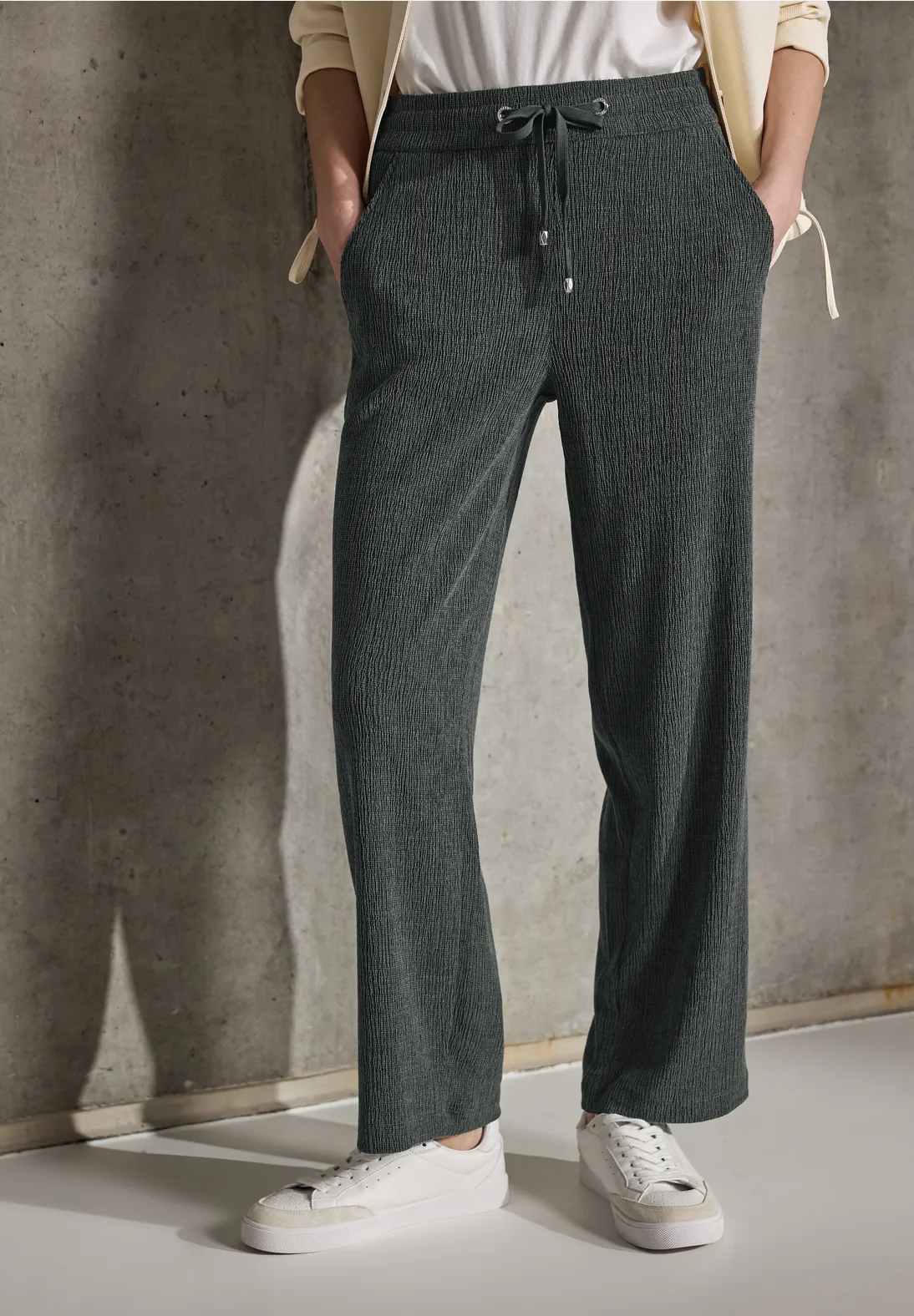 Street One Studio Hose mit lockerer Passform, hoher Taille und geradem Bein. Die Street One Studio Hose hat einen elastischen Bund mit Kordelzug und einen Materialmix mit Stretch und dezenter Struktur.