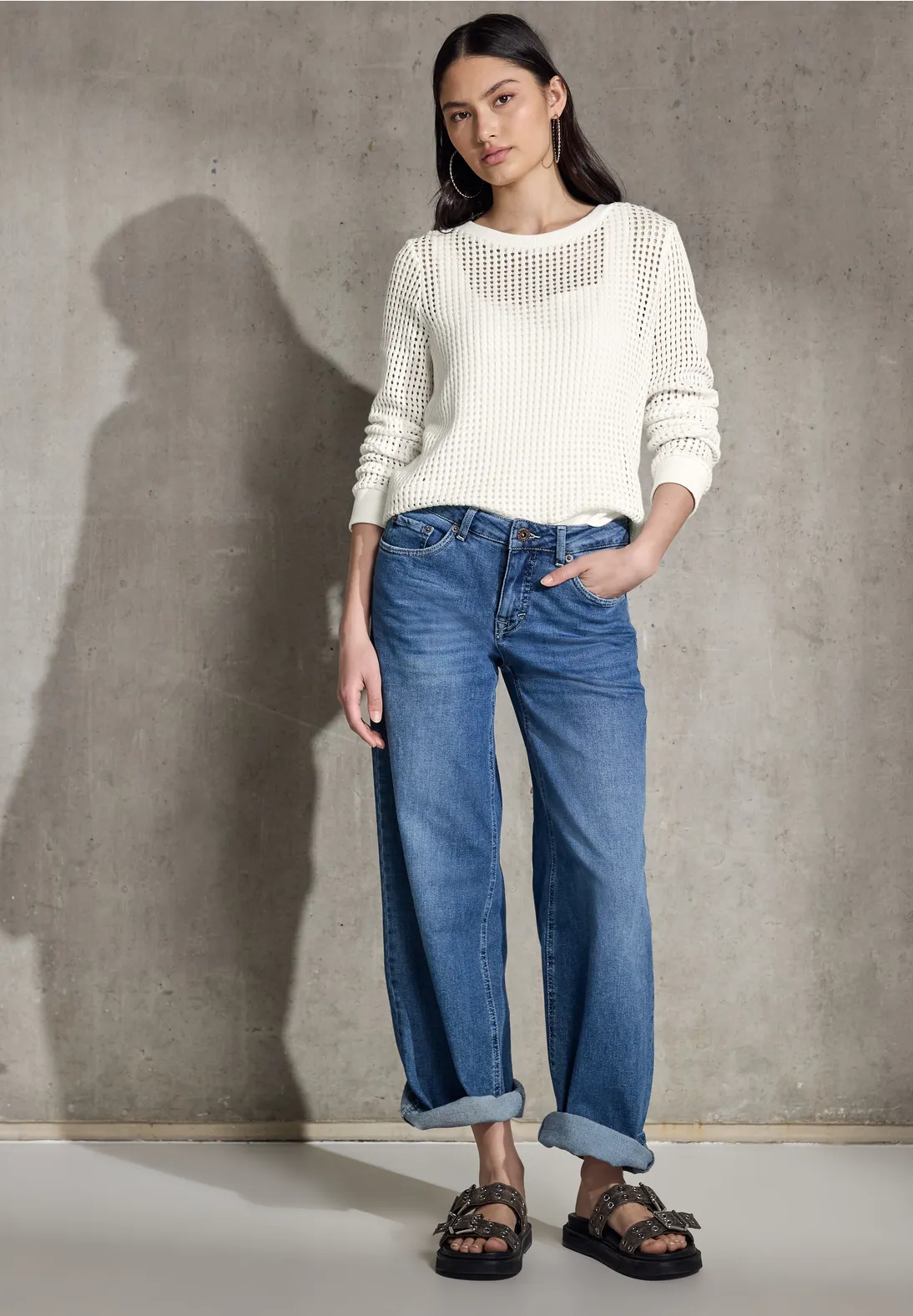 Street One Studio Langarmshirt mit Rundhalsausschnitt und Struktur in Strickoptik. Das Street One Studio Shirt hat ein Lochmuster und ist aus einem Baumwoll-Mix mit Stretchanteil.