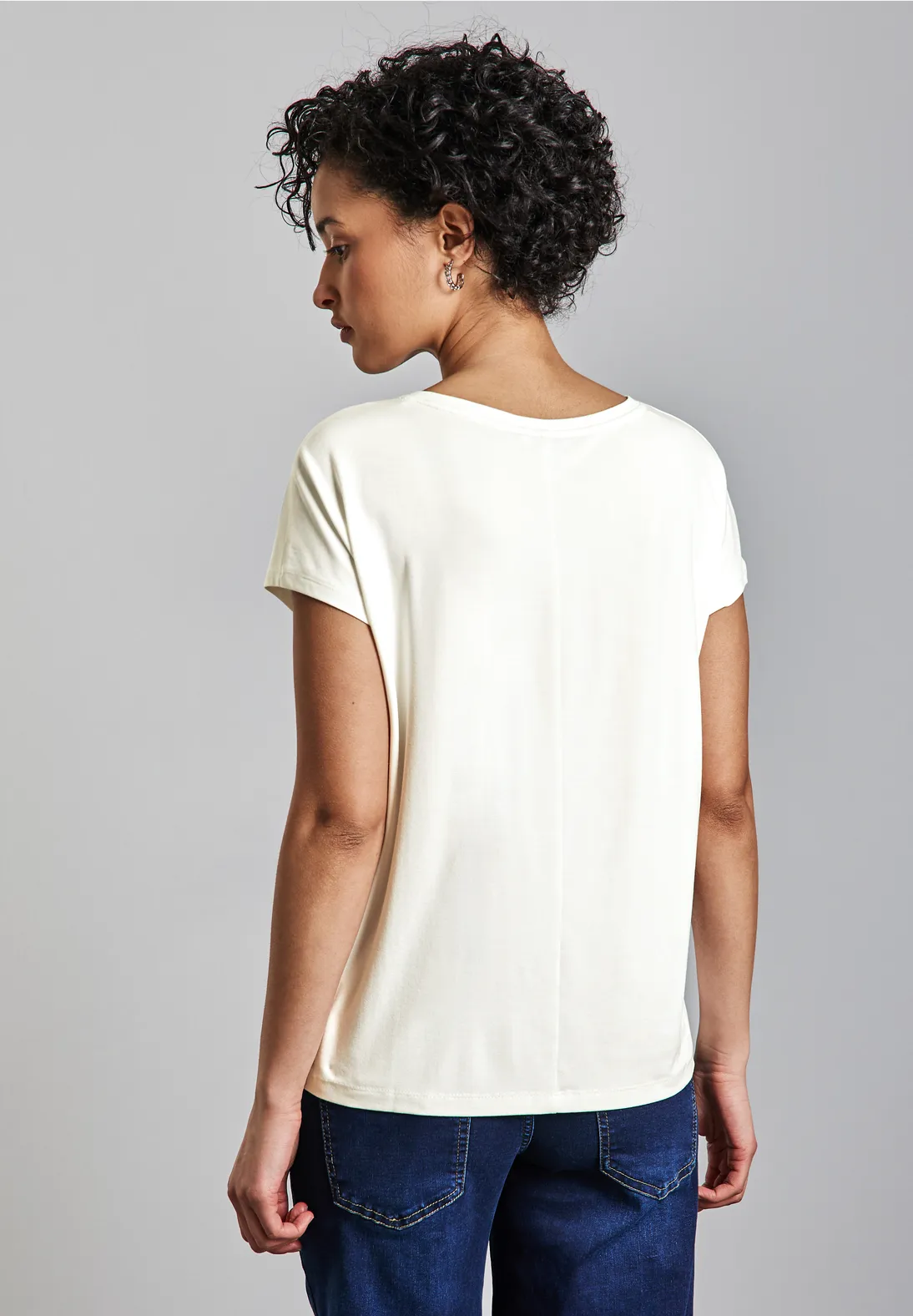 Street One Shirt mit kurzen Ärmeln, Rundhalsausschnitt und Textprint auf der Vorderseite. Das Street One Shirt ist aus einem Viskose-Mix mit angenehmem Stretchanteil.