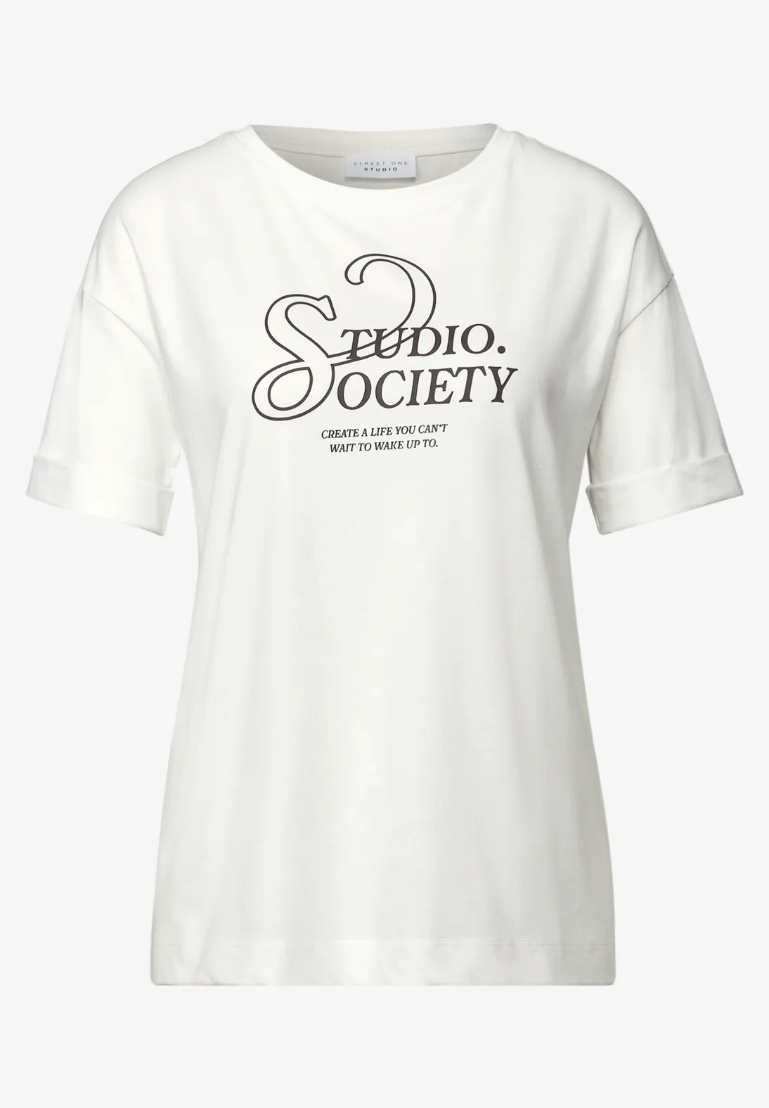 Street One Studio T-Shirt mit kurzen Ärmeln, Rundhalsausschnitt und Wording auf der Vorderseite. Das Street One Studio Shirt ist aus Baumwolle und Modal.