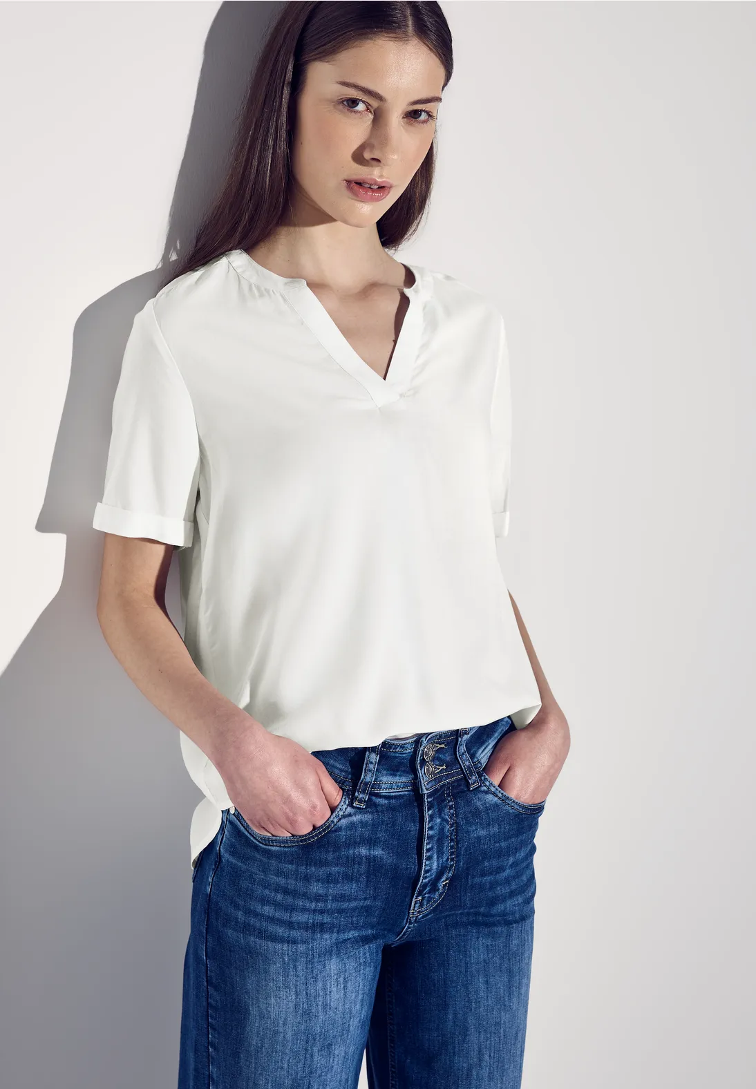 Basic Street One blouse with short sleeves and a round neck with V-slit. This Street One blouse is easy to combine and made of soft viscose.