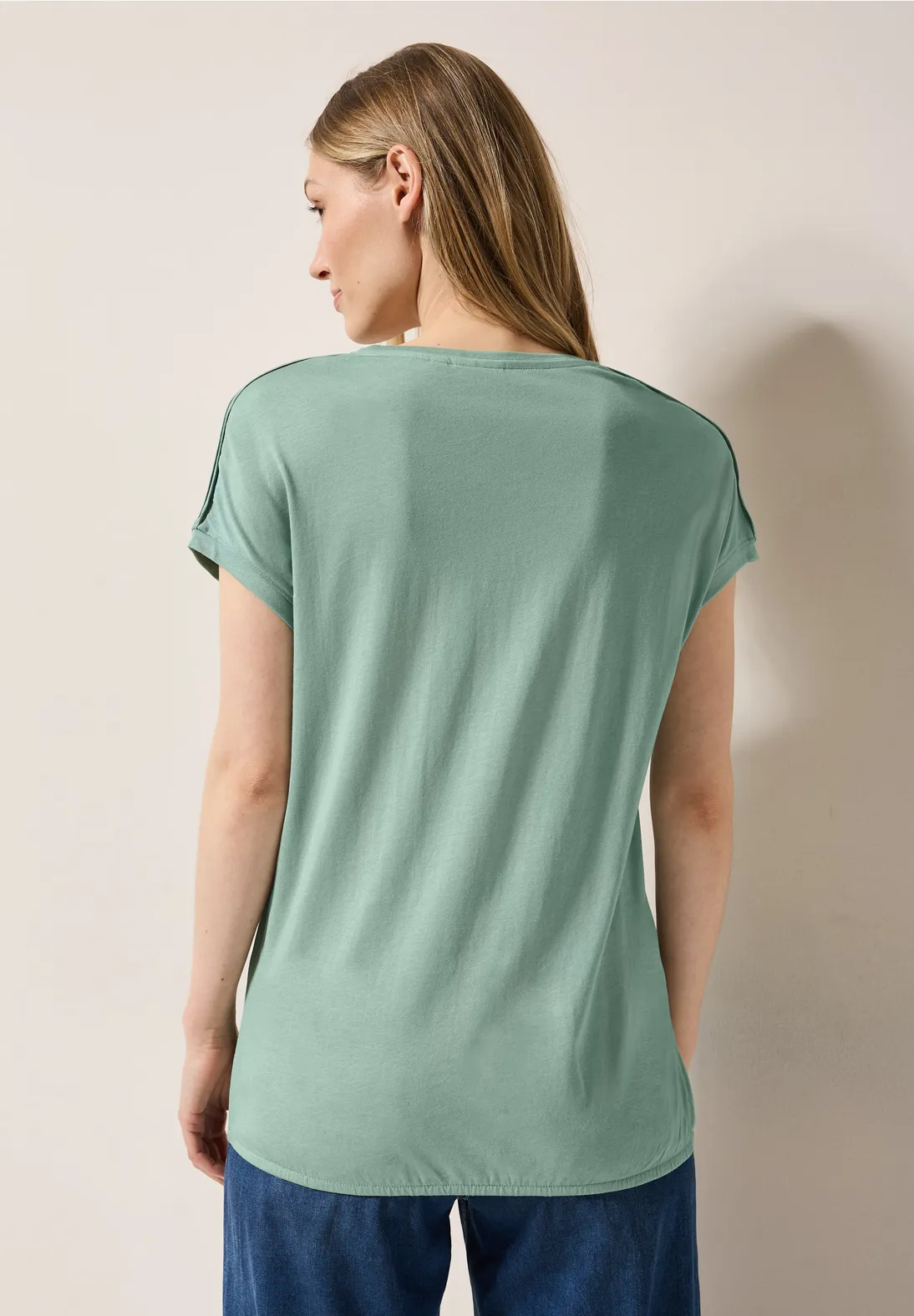 Cecil shirt with short sleeves, a round neckline and a subtle shoulder detail. This Cecil shirt has an elastic hem and is made of a soft cotton-modal mix.