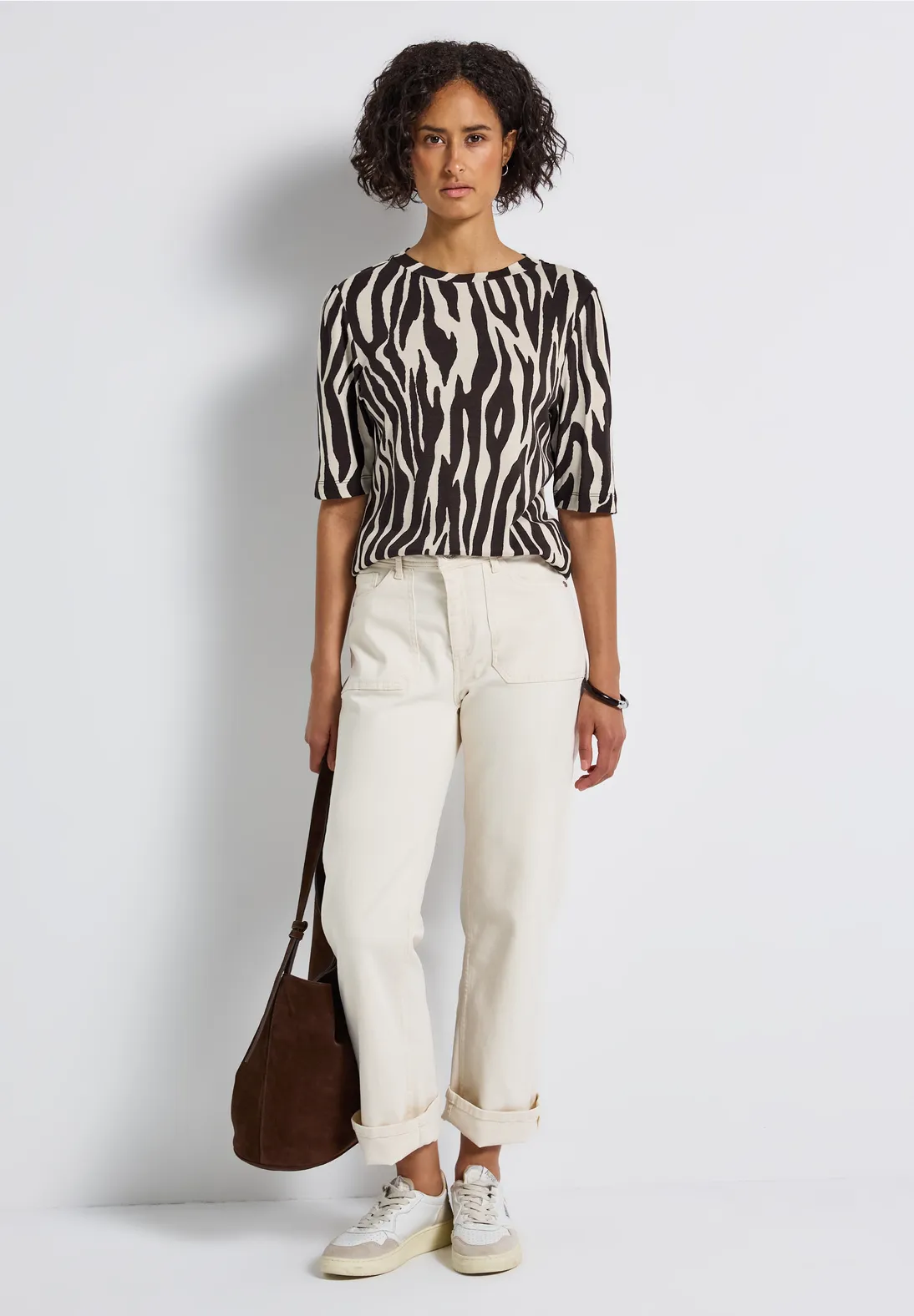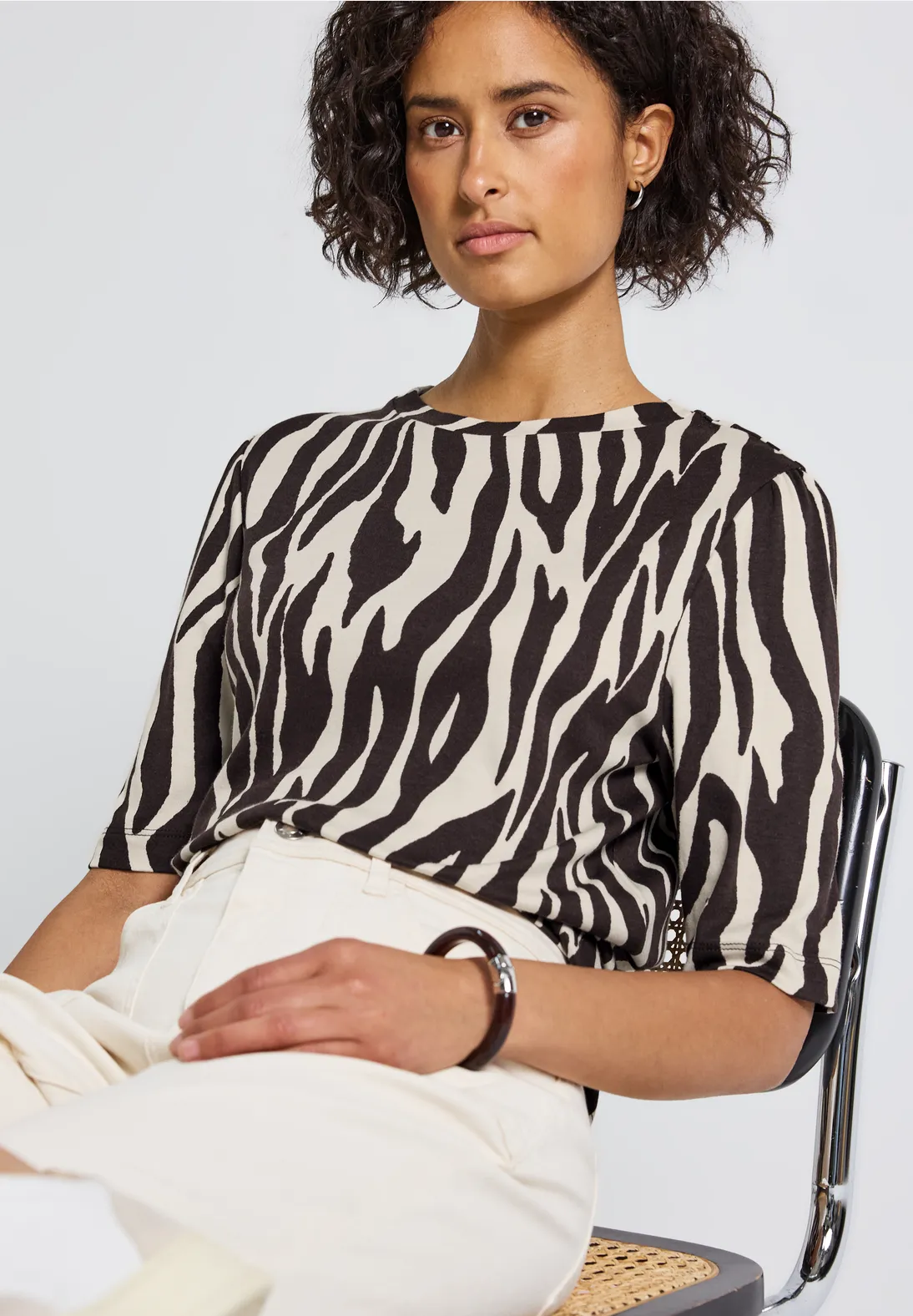 Street One shirt with short sleeves, a round neckline and an animal print. This Street One shirt features subtle pleats on the shoulders and is made of a soft cotton-modal blend.