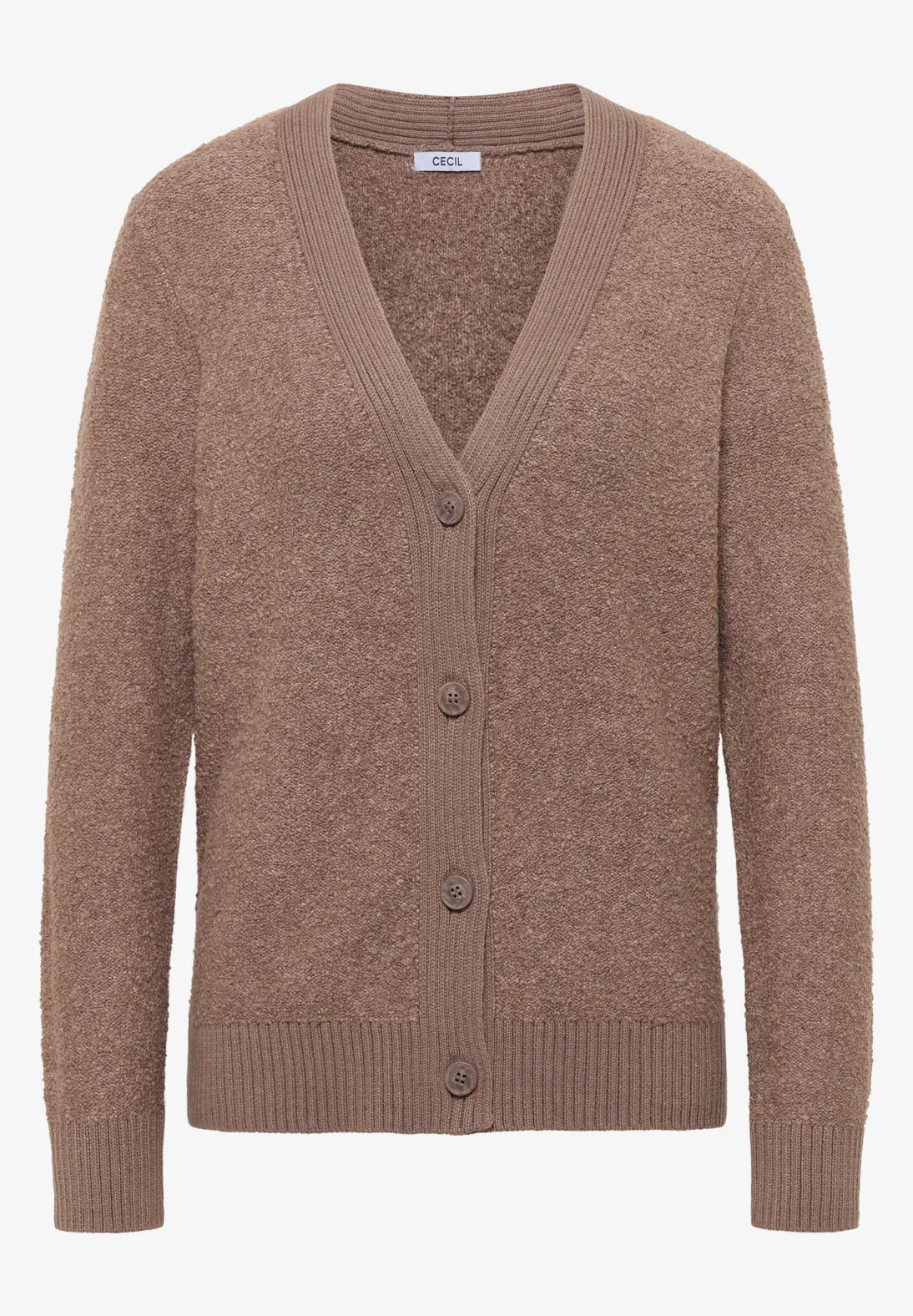 Experience comfort and style with this CECIL women's cardigan in the warm shade Chocolate Mousse Melange. Crafted from soft bouclé fabric, it features a classic V-neck, full button closure, and long sleeves with ribbed cuffs for a timeless and cozy fit. A must-have for casual yet elegant looks.