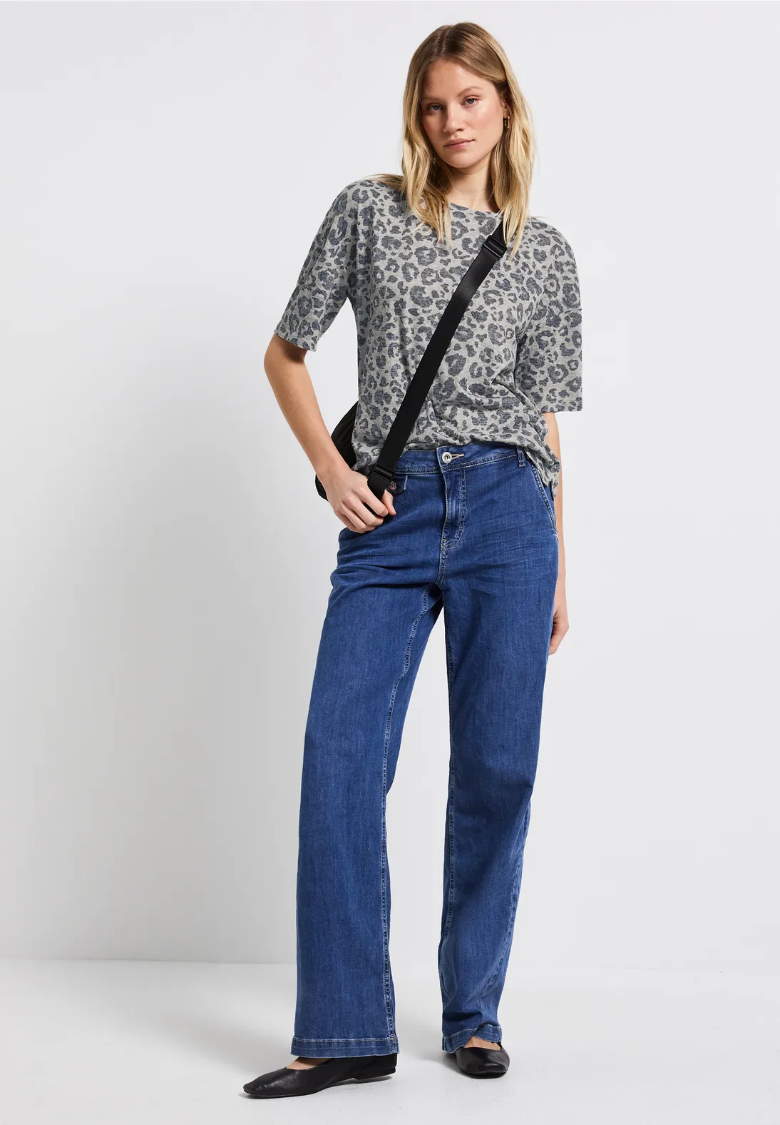 Street One shirt with short sleeves, a round neckline and a leopard print on burn-out material. This Street One shirt has side slits and is made of a lightweight material mix.