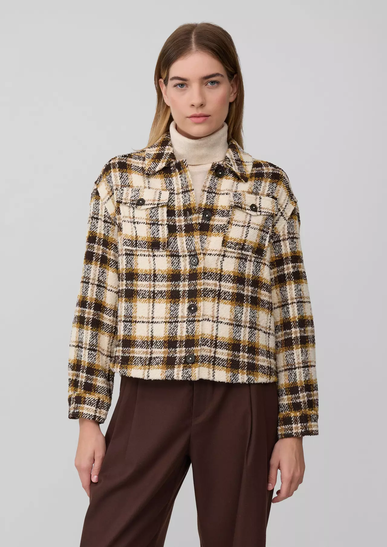 Looking for a touch of classic charm? This short bouclé jacket in beige with a chic checkered pattern adds sophistication to any outfit. The shirt collar and chest pocket give the jacket an elegant flair, while the button closure completes the look. Perfect for adding that extra touch of style to your everyday wear.