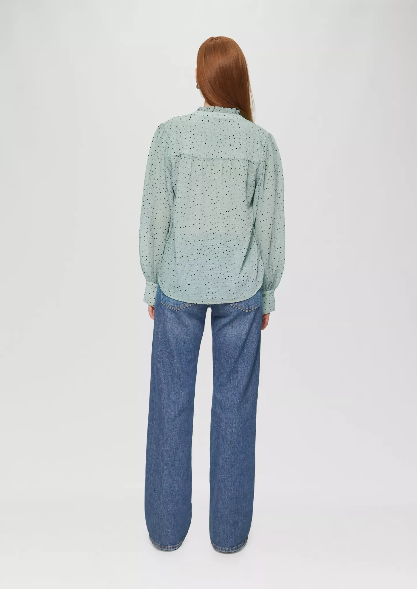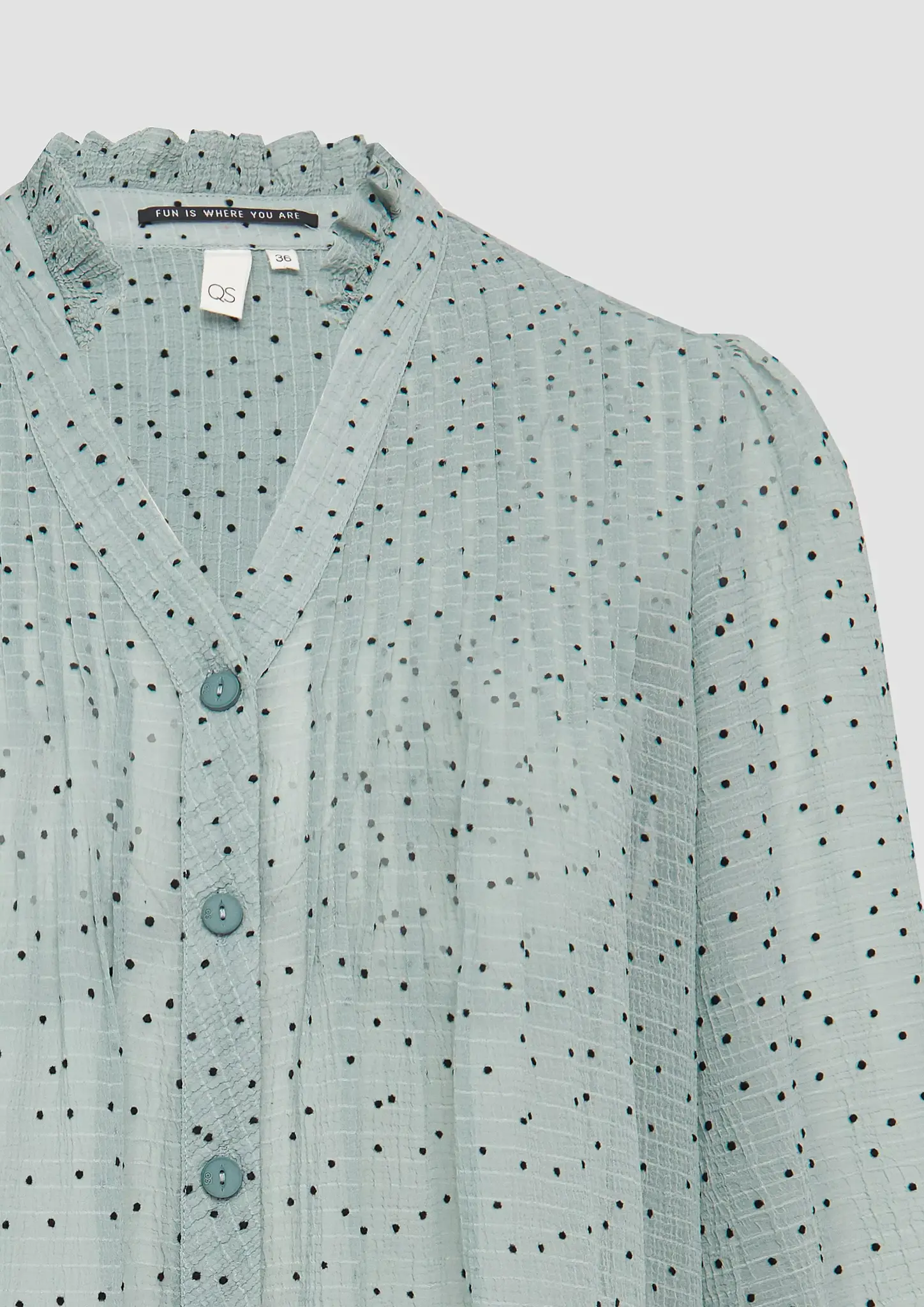 QS by S. Oliver blouse with long sleeves, a V-neckline with ruffles and a polka dot print. This QS blouse has a long button closure and is made of semi-transparent chiffon with a fine structure.