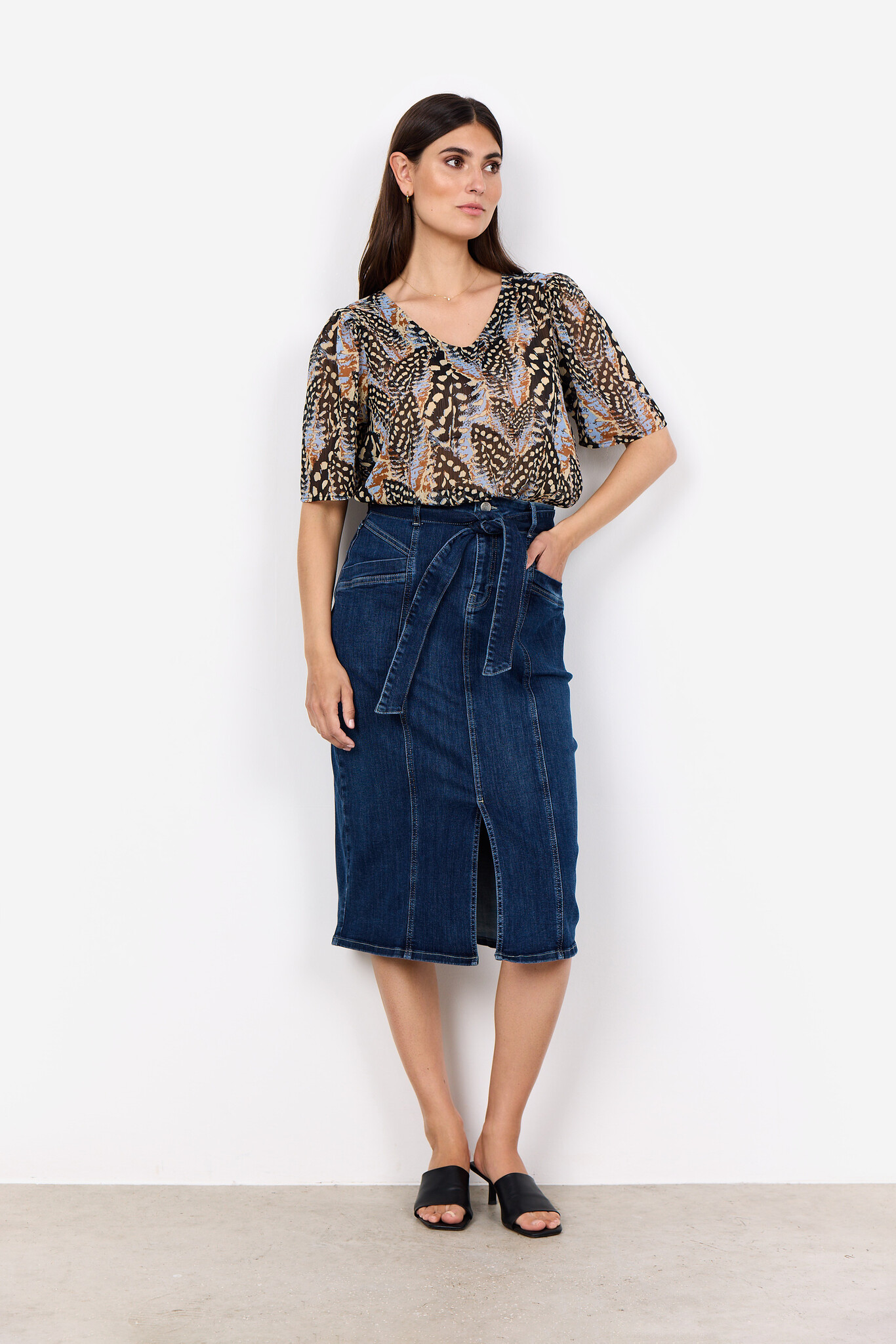 Soyaconcept SC-KIMBERLY 38. Soyaconcept denim skirt with a matching belt, side pockets and a knee length.