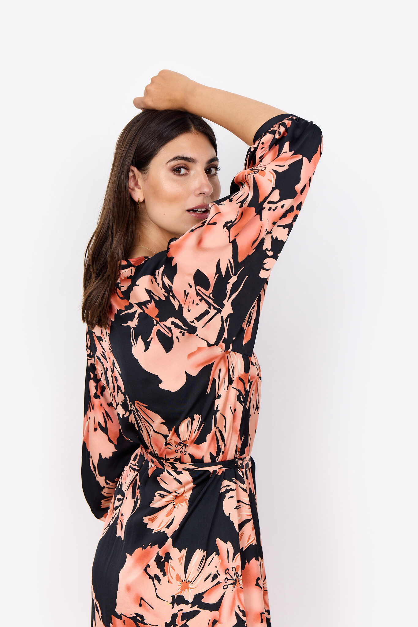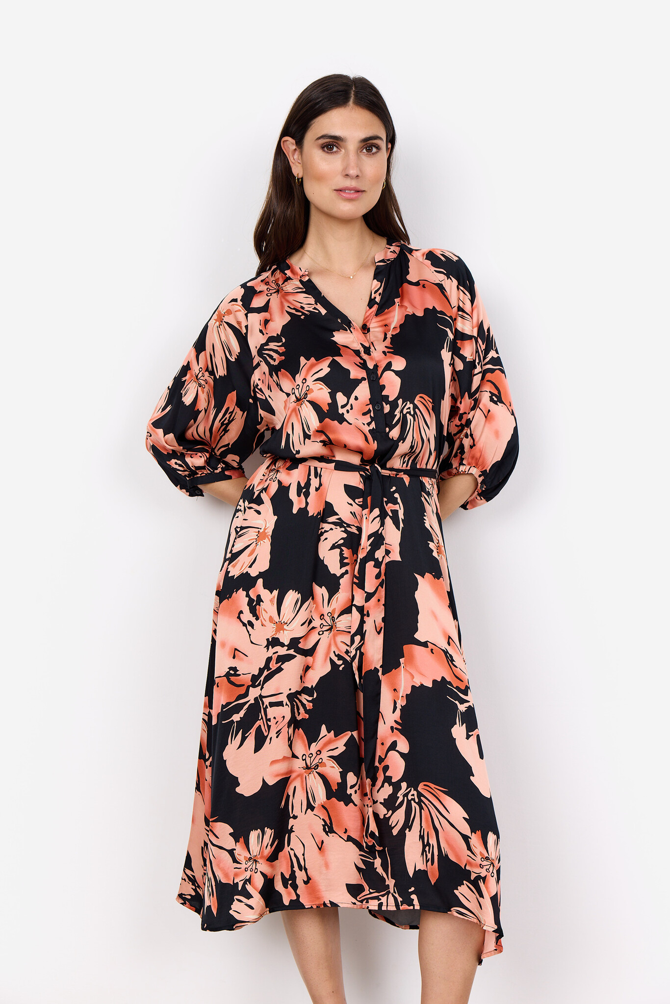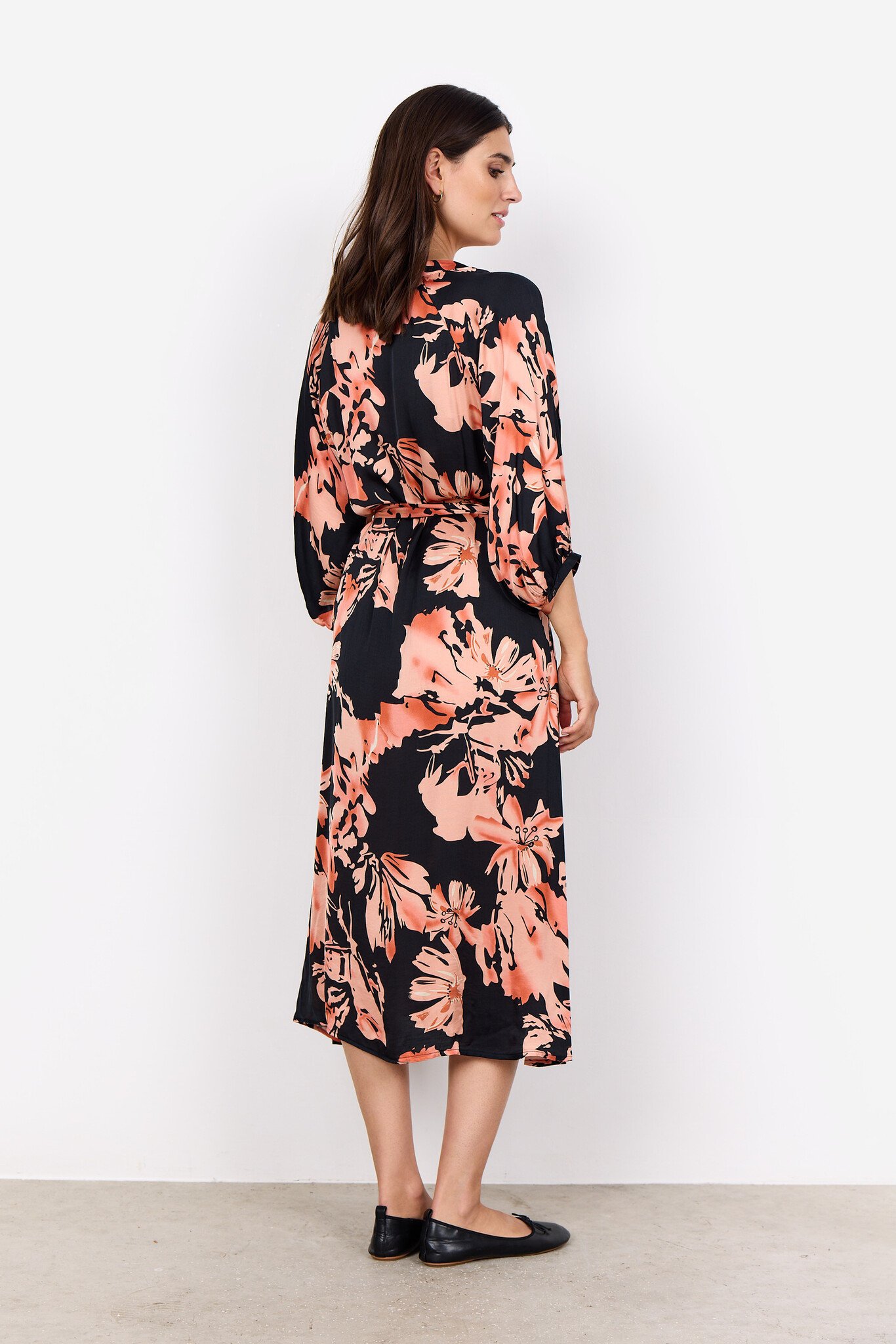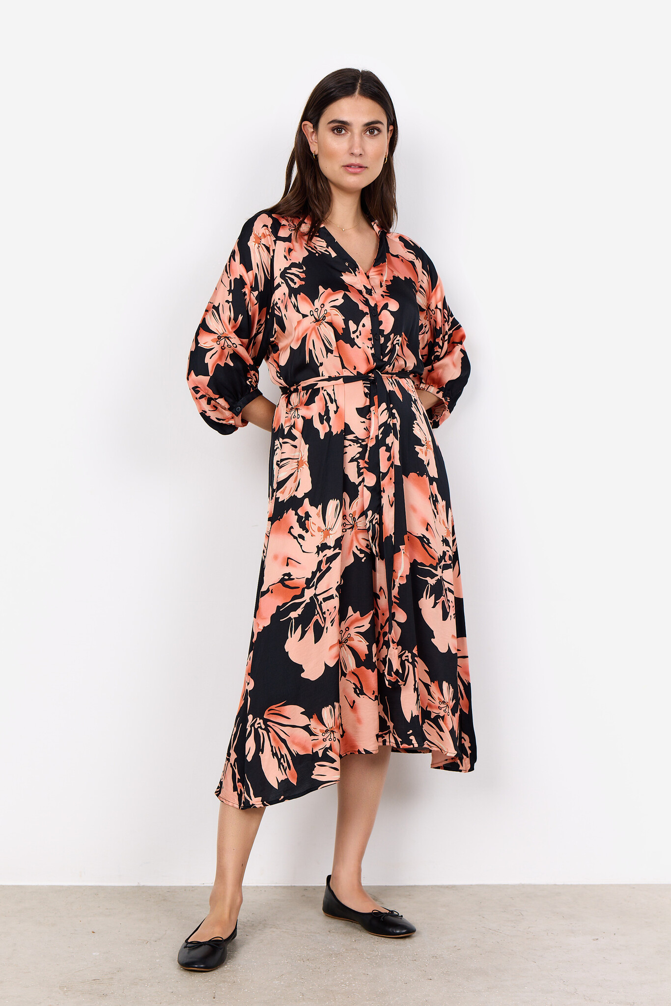 Soyaconcept SC-Peach 4. Soyaconcept dress with 3/4-sleeves, a round neckline with V-slit and an allover print. This Soyaconcept dress has a half-length button closure and a feminine fit in a midi length. Made from sustainable viscose.