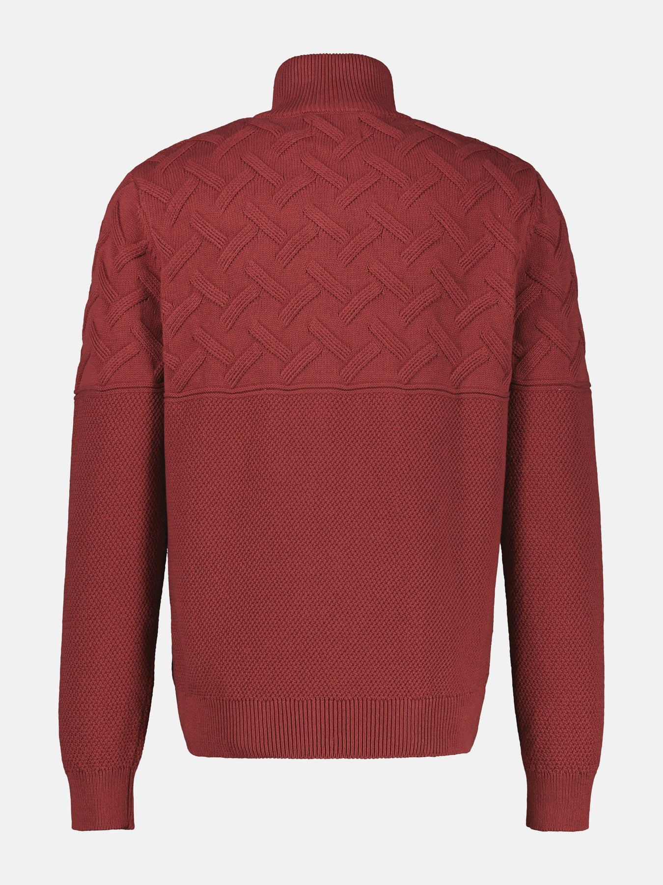 This jacquard knit sweater from LERROS in the rich tone Maple Red blends comfort with refined style. The graphic knit pattern gives it a modern, structured look, while the functional stand-up collar adds warmth and versatility. Wear the collar folded down or zipped up for extra protection on colder days. Made from 100% cotton, it’s breathable, soft, and ideal for layering during transitional weather or colder months.