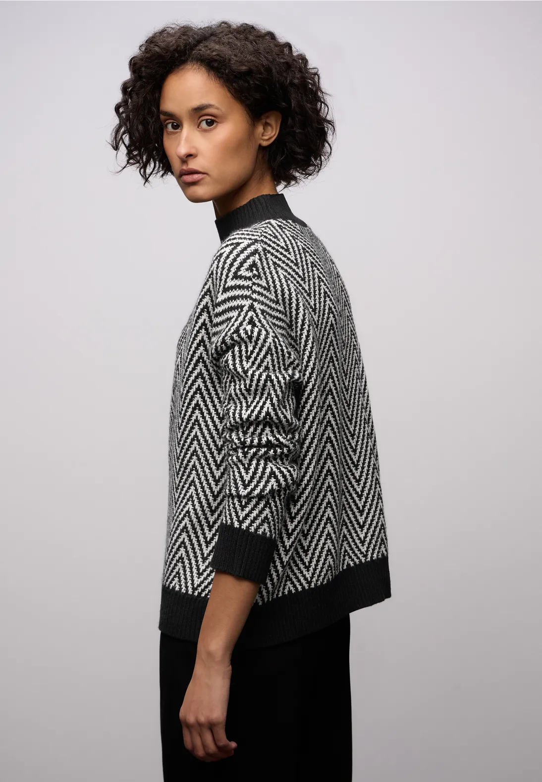 Stylish, cozy, and perfect for the season: this black jacquard turtleneck sweater from Street One is a true must-have for fashion-conscious women. The knitted sweater with a graphic pattern and ribbed details combines comfort with a modern look. The turtleneck and long cuffed sleeves add warmth and a flattering fit.