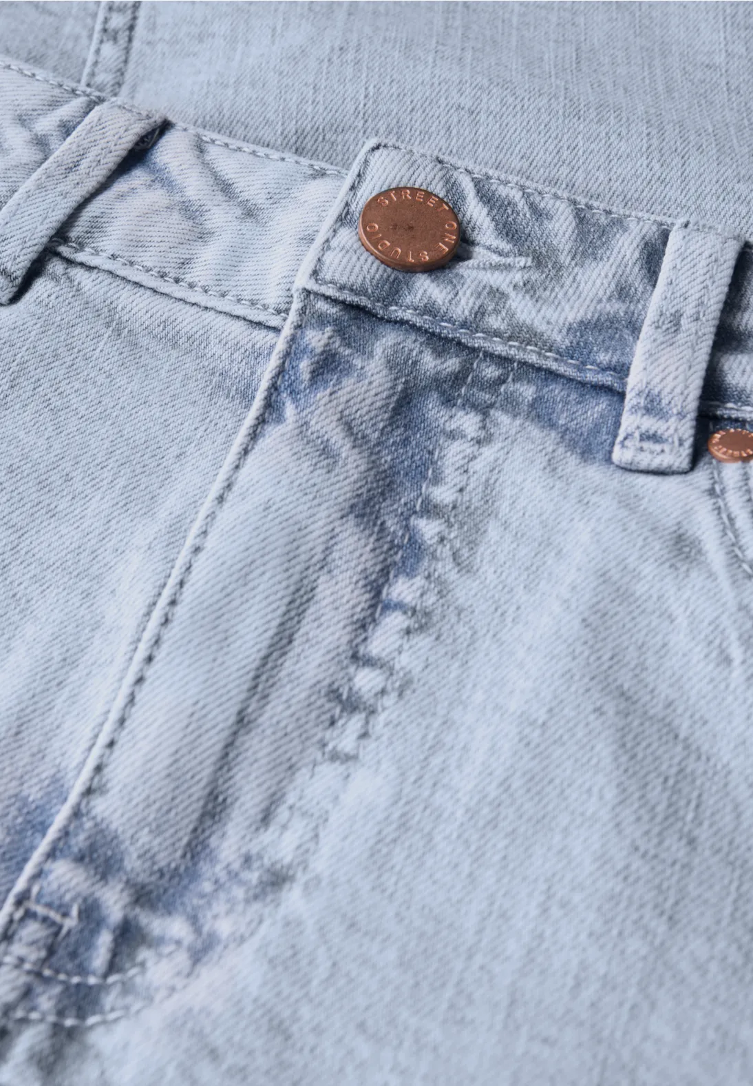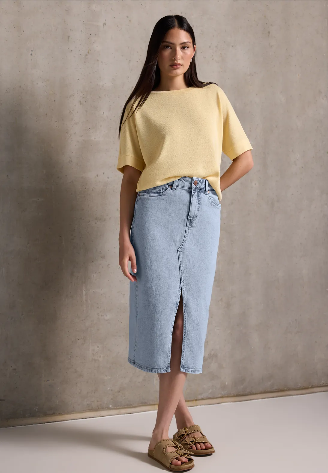 Street One Studio midi denim skirt with a high waist and a front slit. This Street One denim skirt is made from a cotton blend with comfortable stretch.