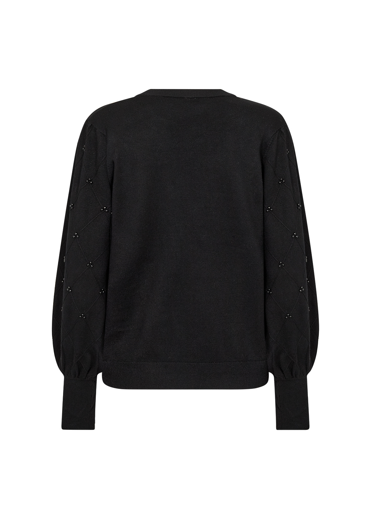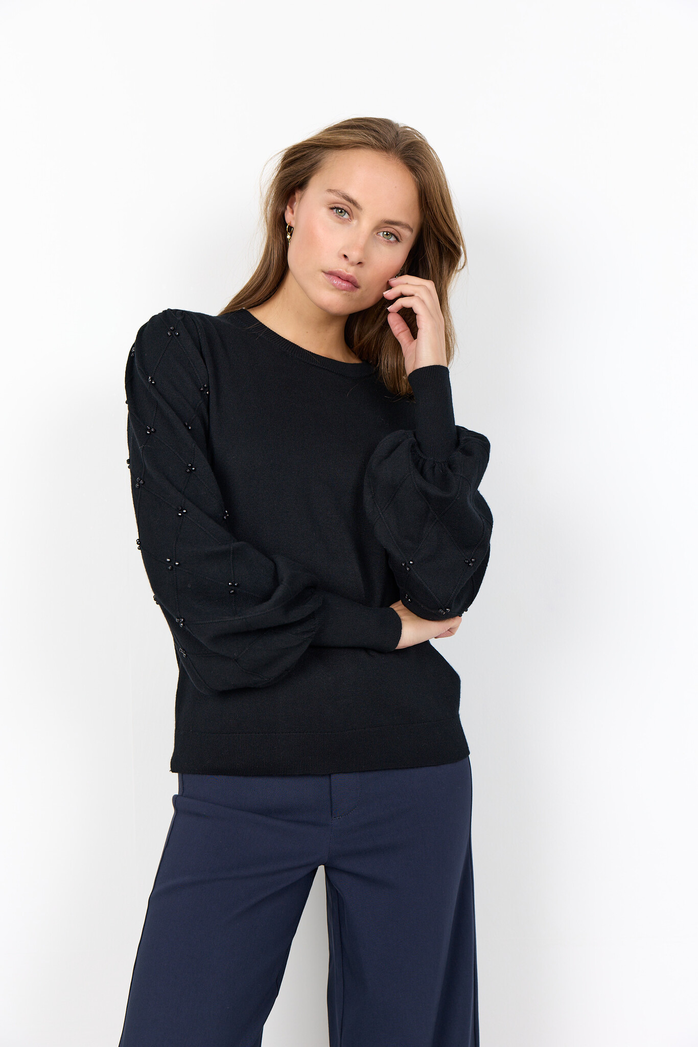 The SC-DOLLIE 802 by Soyaconcept is a refined black pullover designed with elegance in mind. Featuring delicate bead embellishments on the sleeves, a classic round neckline, and ribbed cuffs, this knitwear piece offers a polished look with a touch of glamour. Made from a soft and stretchy viscose blend (75% viscose, 25% nylon), it's perfect for pairing with tailored trousers or a sleek skirt – from office wear to evening outings.