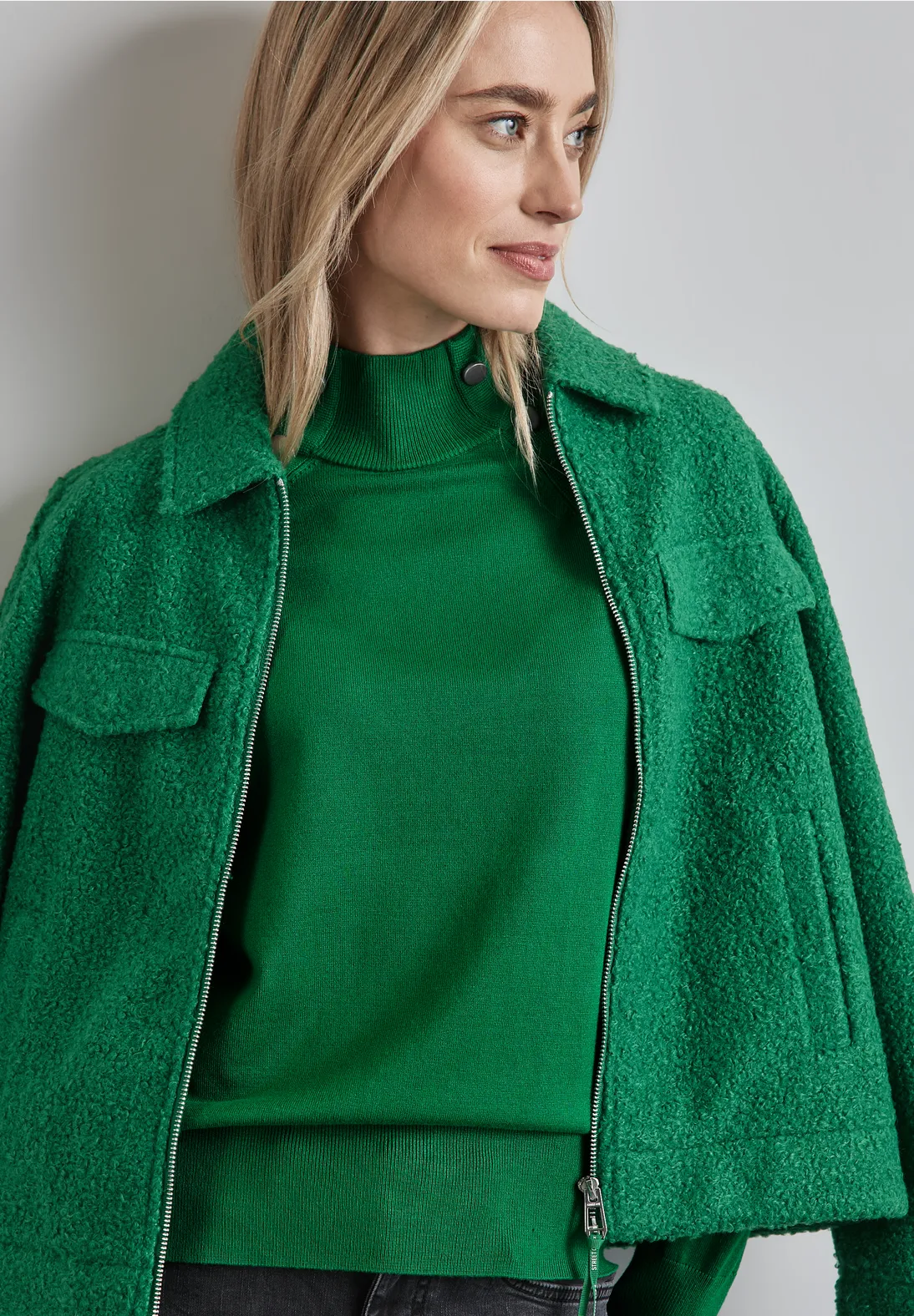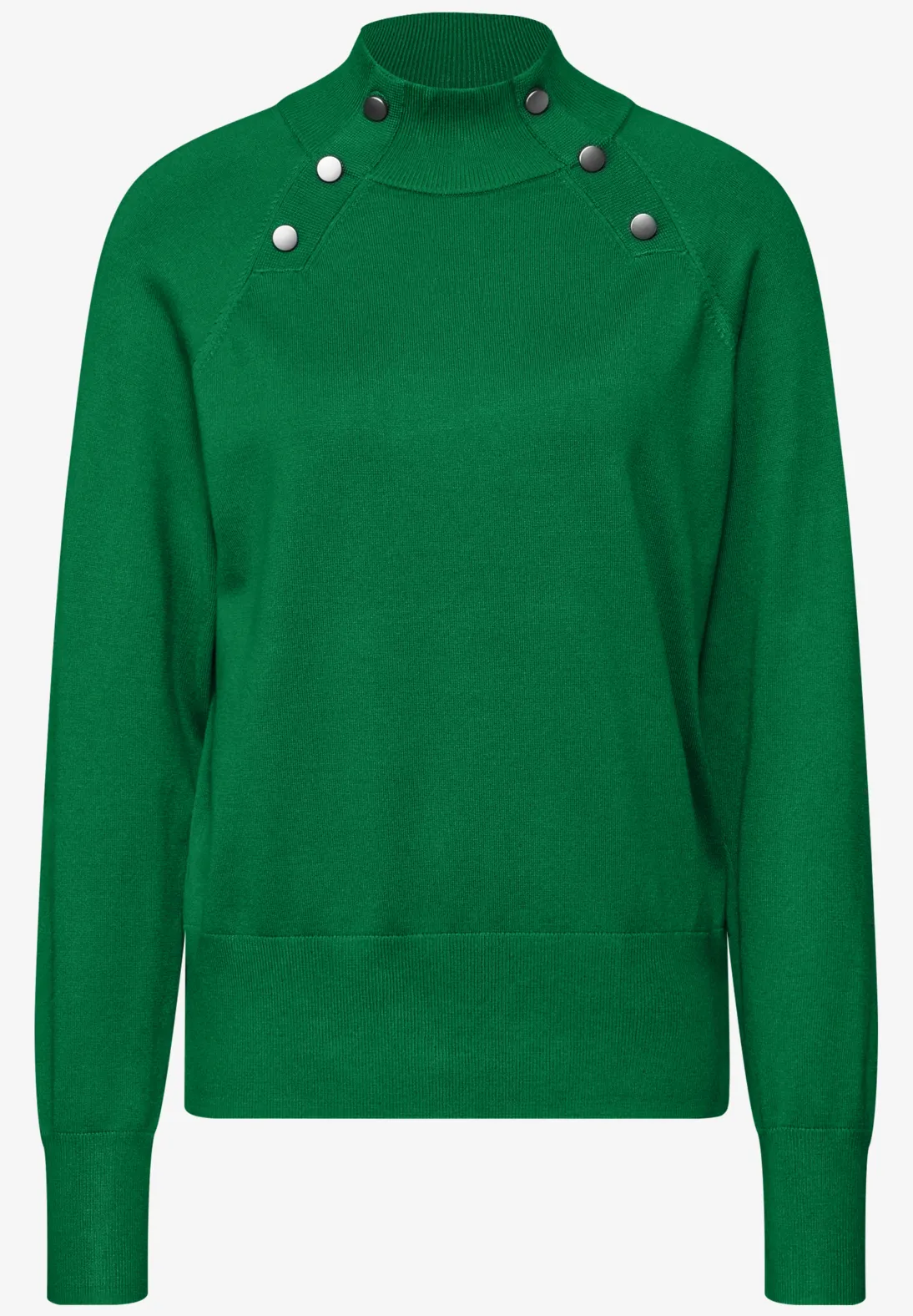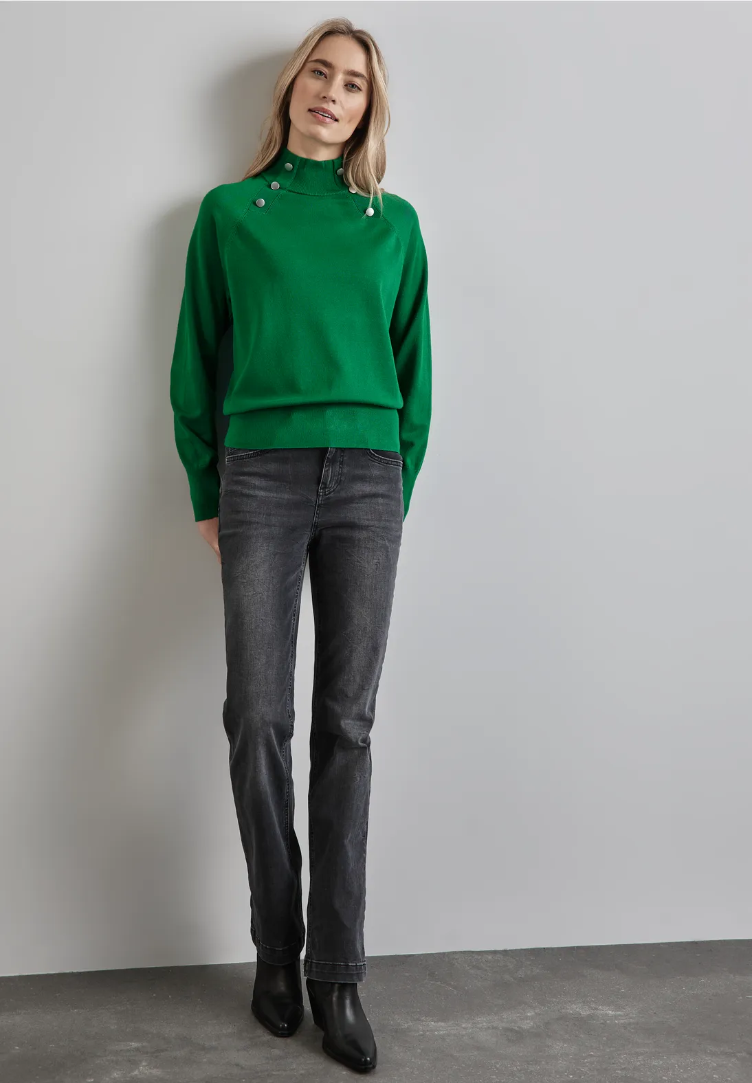 Finely knitted Street One sweater with long sleeves and a standing collar with button details. This Street One sweater is made of a soft viscose mix.