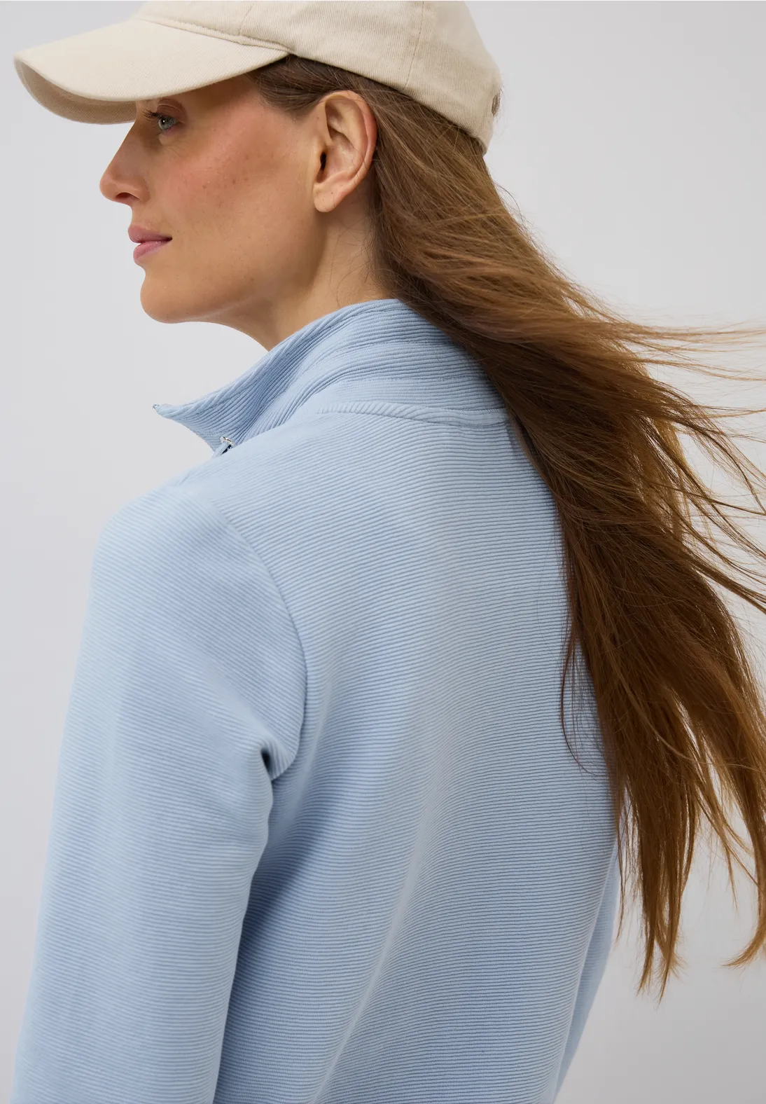 Cecil jacket with long sleeves, an ottoman structure and a standing collar with drawstring. This Cecil vest has pockets and is made of a cotton blend with stretch.