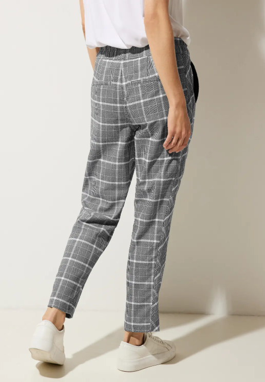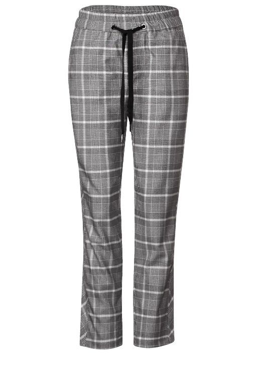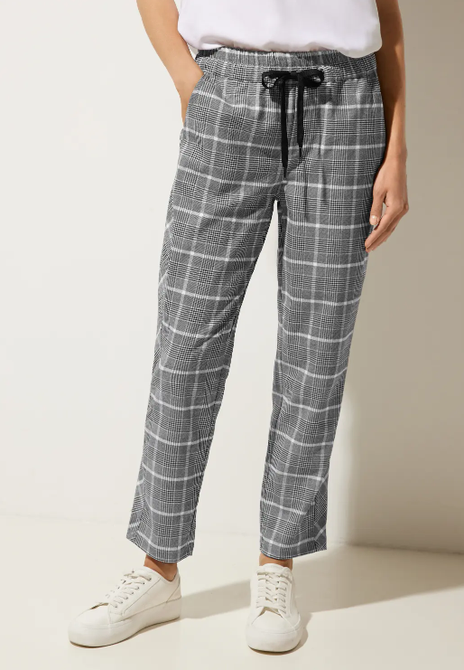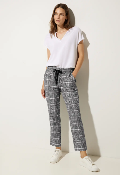 Street One Bonny. Street One pants with a loose fit, middle waist and slim legs. These comfortable Street One pants have side pockets, an elastic waistband with drawstring and an allover checkered print.