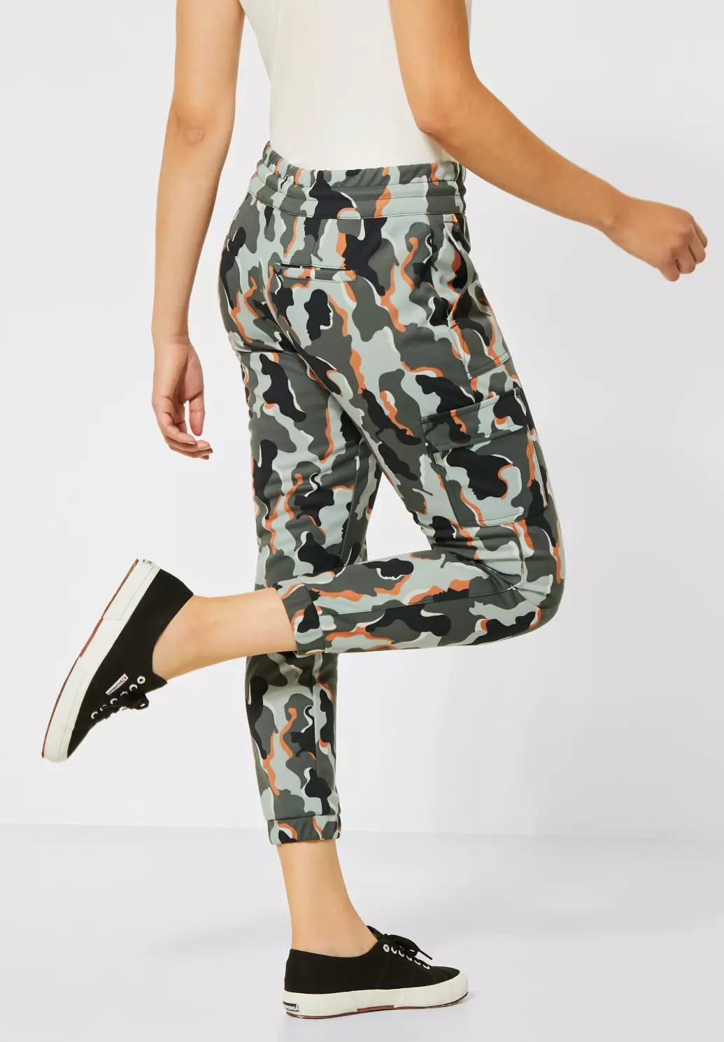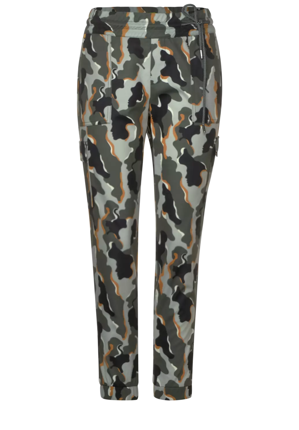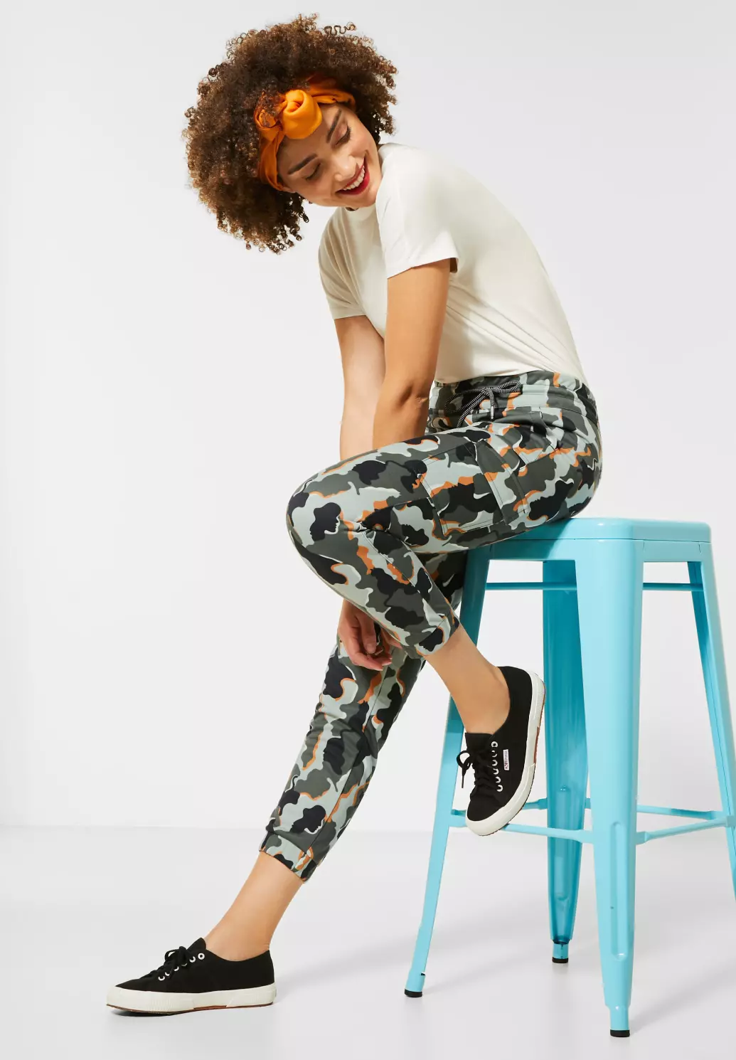 Street One Bonny. Street One pants with a loose fit, middle waist and slim legs with elastic hem. The elastic waistband is finished with a cord closure Made from soft and comfortable material and a camouflage print. The side pockets and sporty cargo-pockets make it complete.