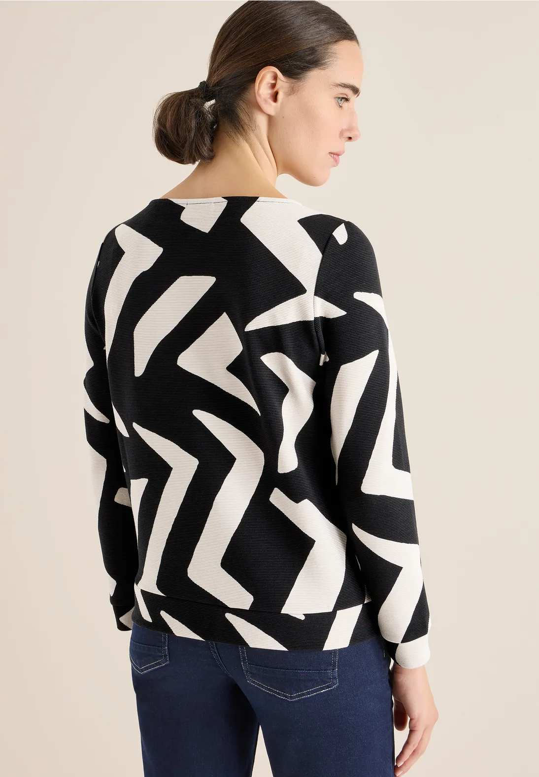 The Ottoman shirt by CECIL in Light Greige features a stylish graphic pattern and a comfortable fit. Made from a soft viscose blend with stretch, it offers excellent comfort. The boat neckline and long sleeves make it a versatile choice for chic everyday looks.