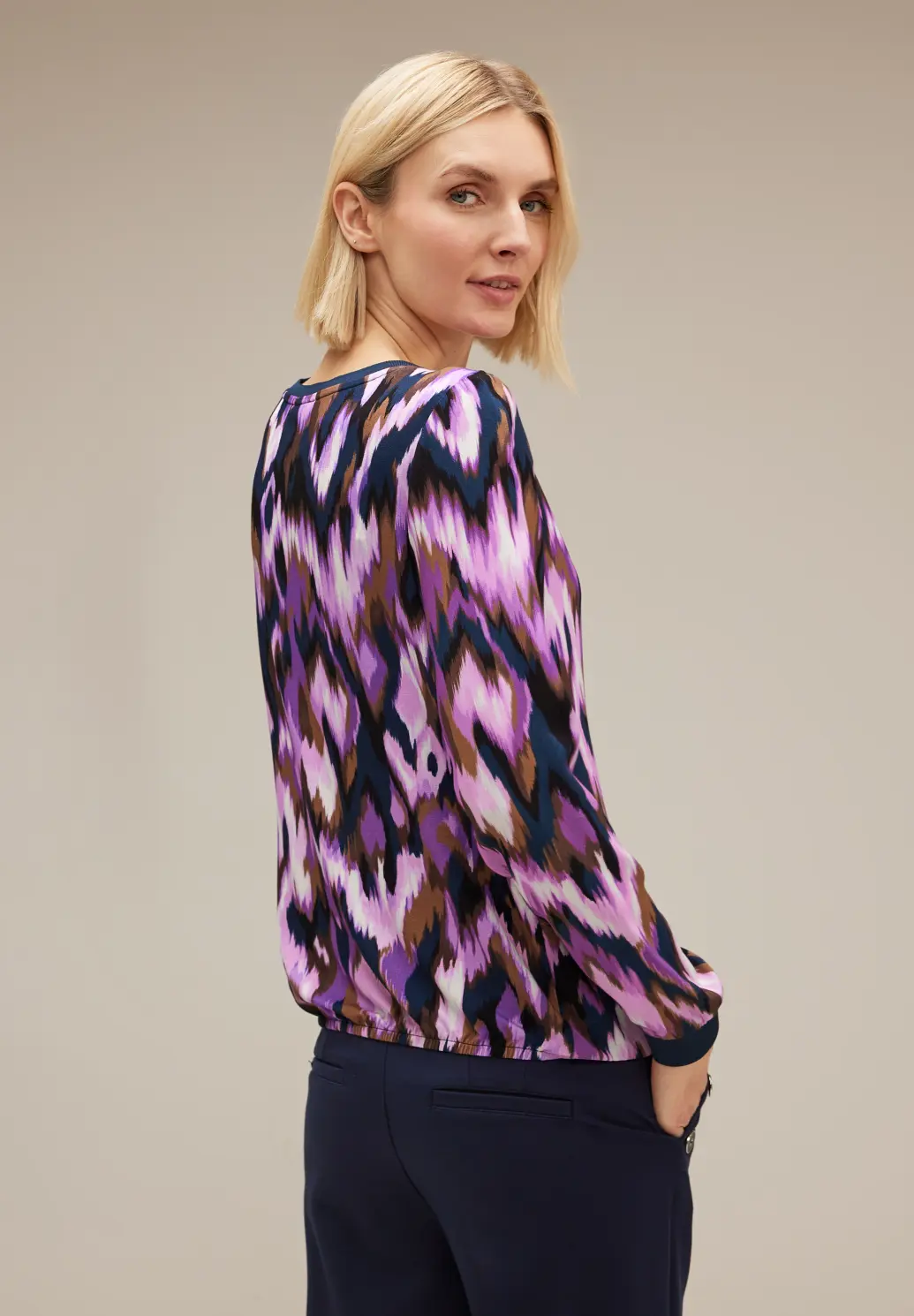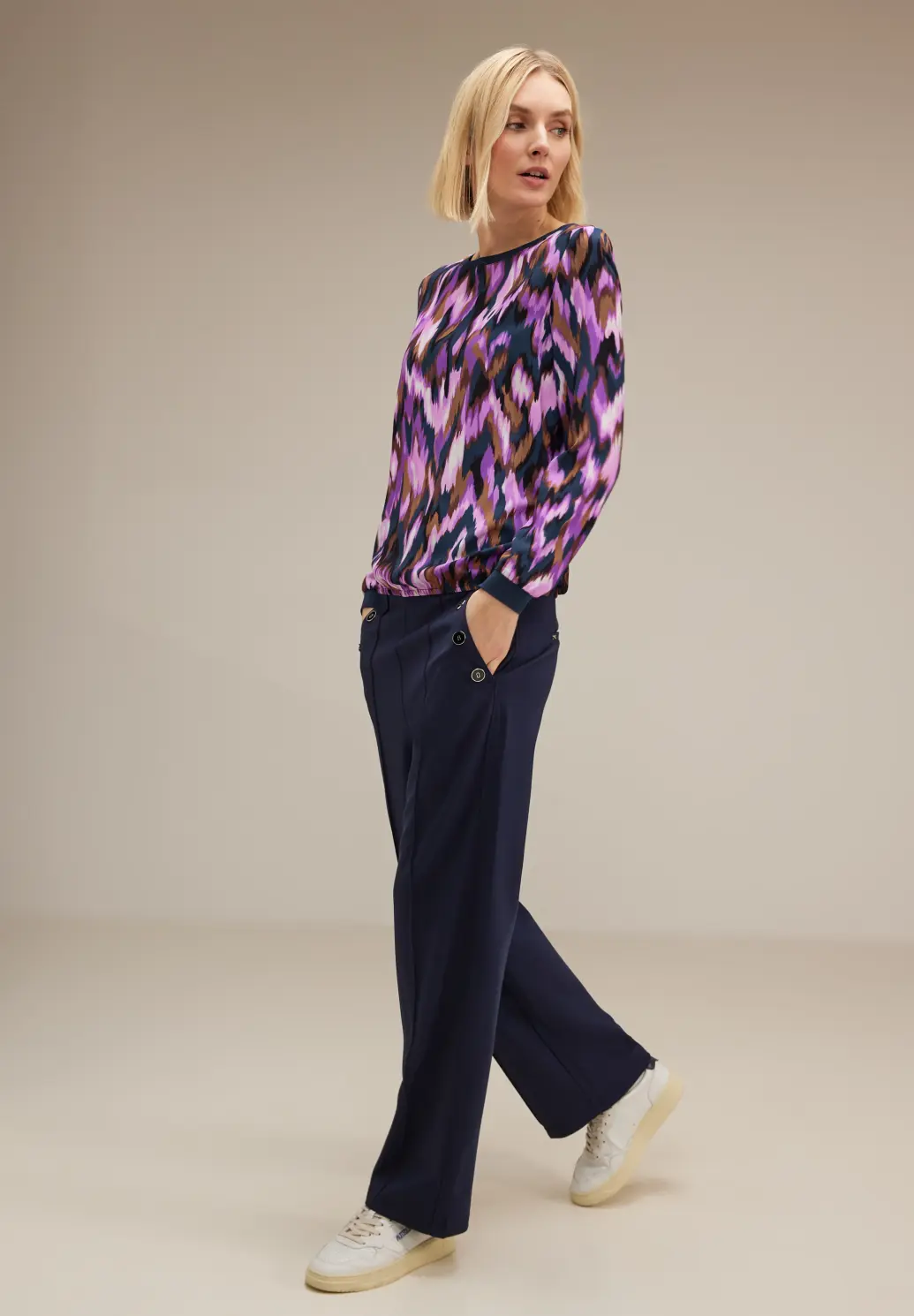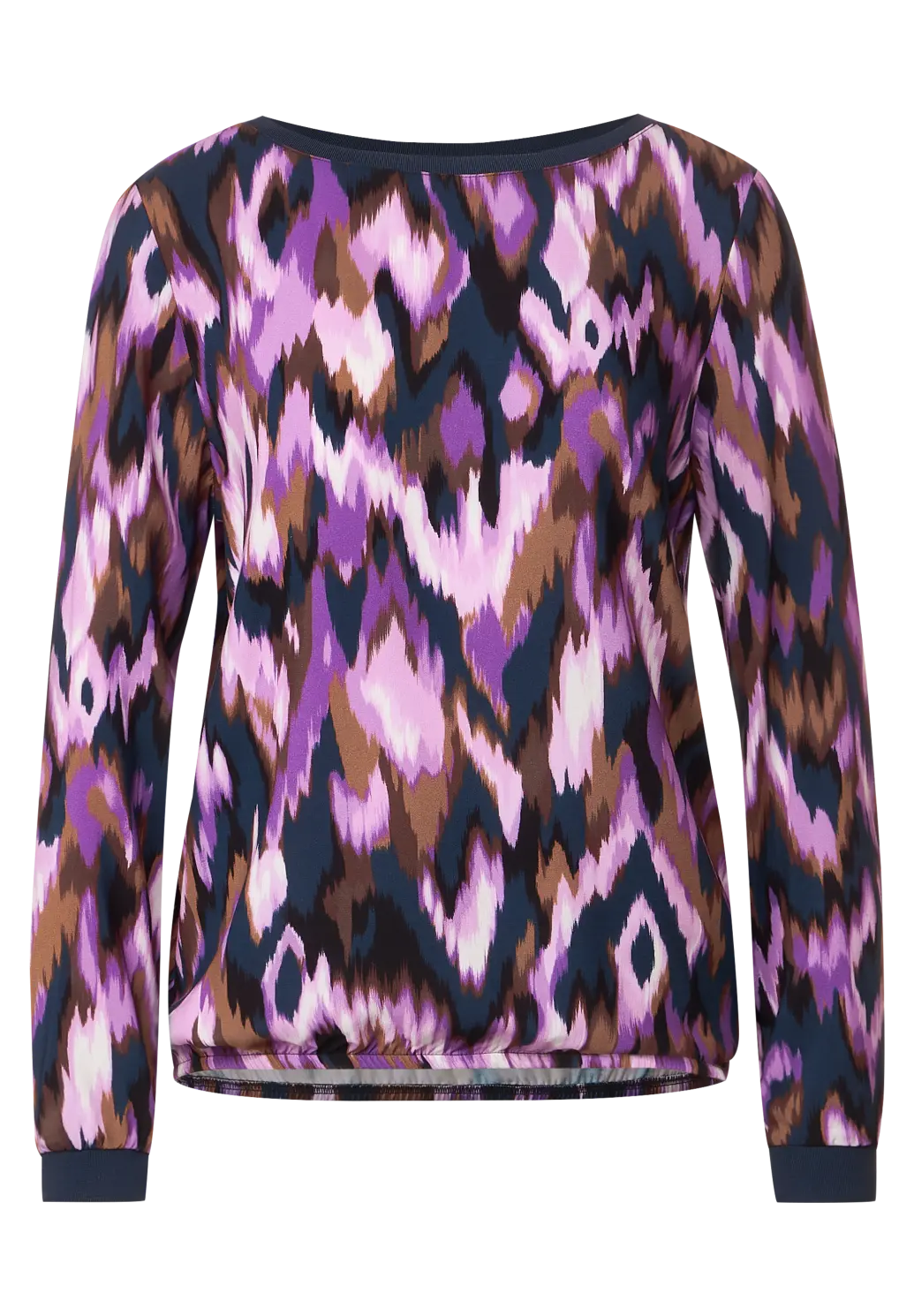 Street One shirt with long sleeves, a boat neckline and a multi-colored print. This Street One shirt has an elastic hem and cuffs on the sleeves. Made from a comfortable material mix with soft viscose.