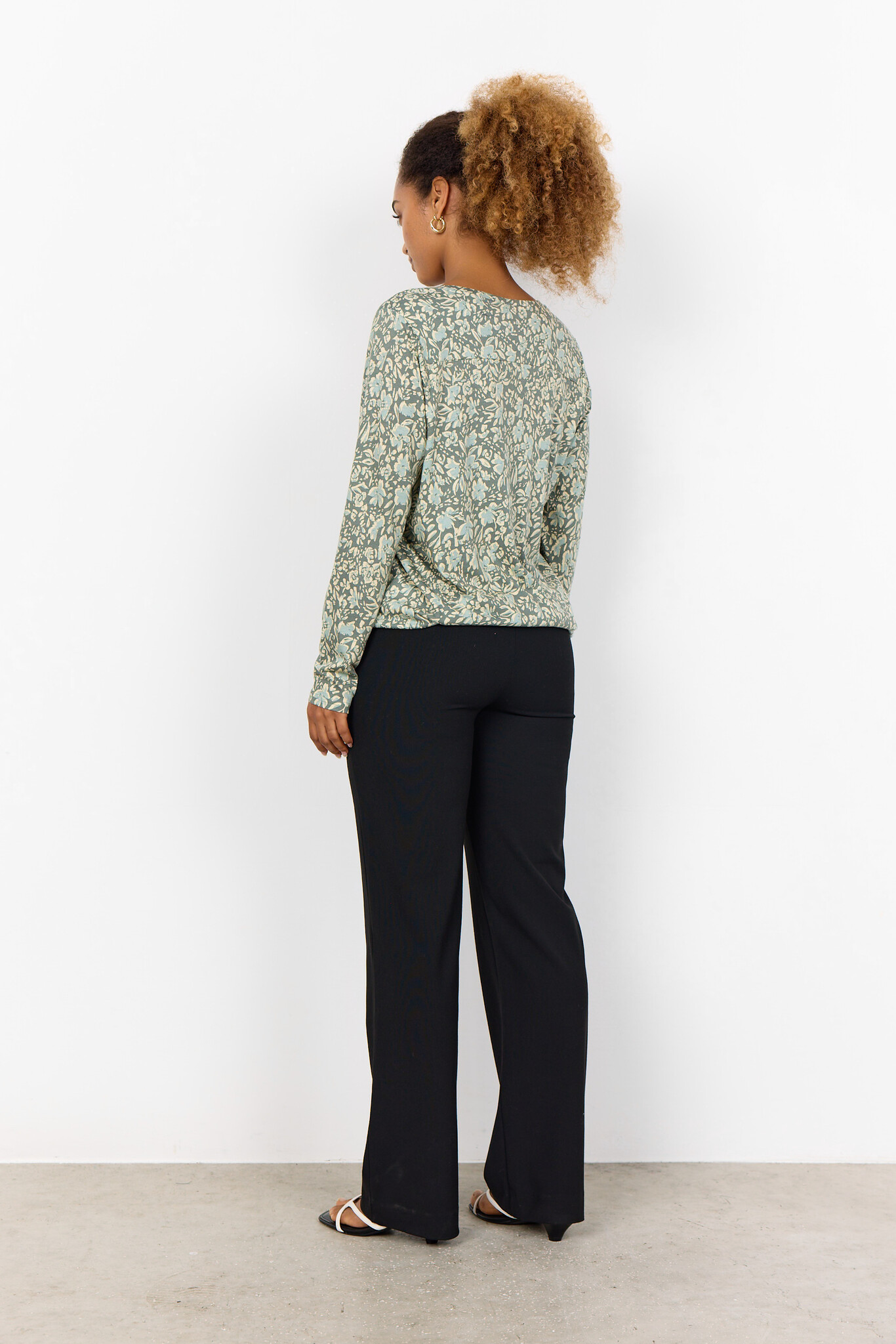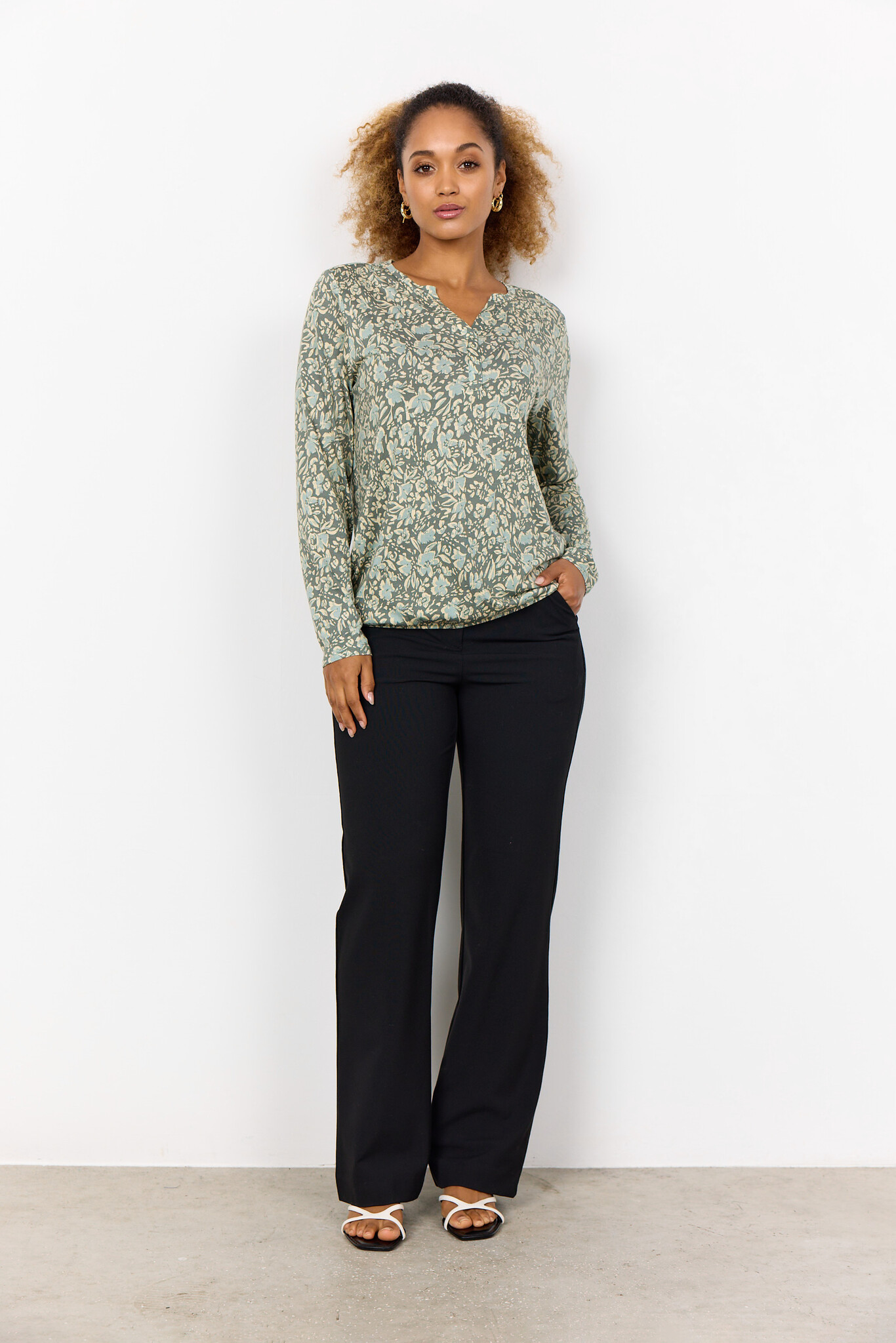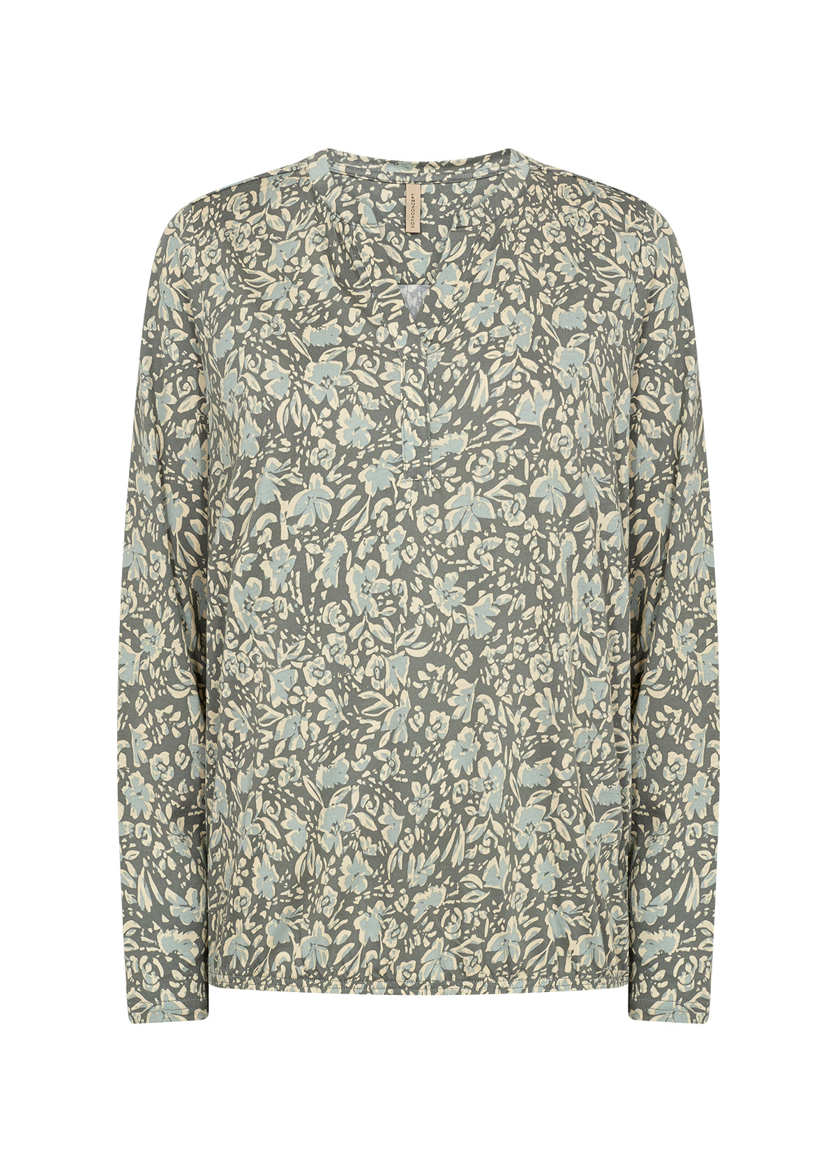 SC-Felicity AOP 493. Soyaconcept shirt with a round neckline with V-slit, long sleeves and an allover print. The loose model with elastic hem provides a sporty accent. Made from a comfortable mix of organic cotton and viscose.
