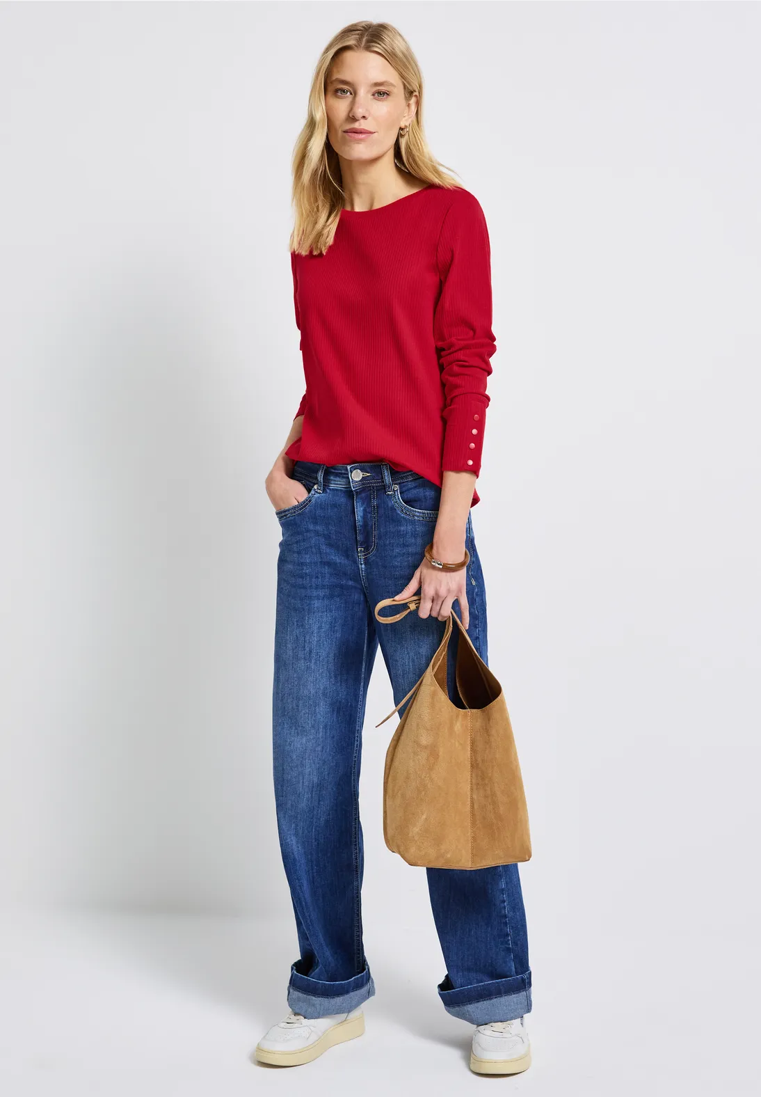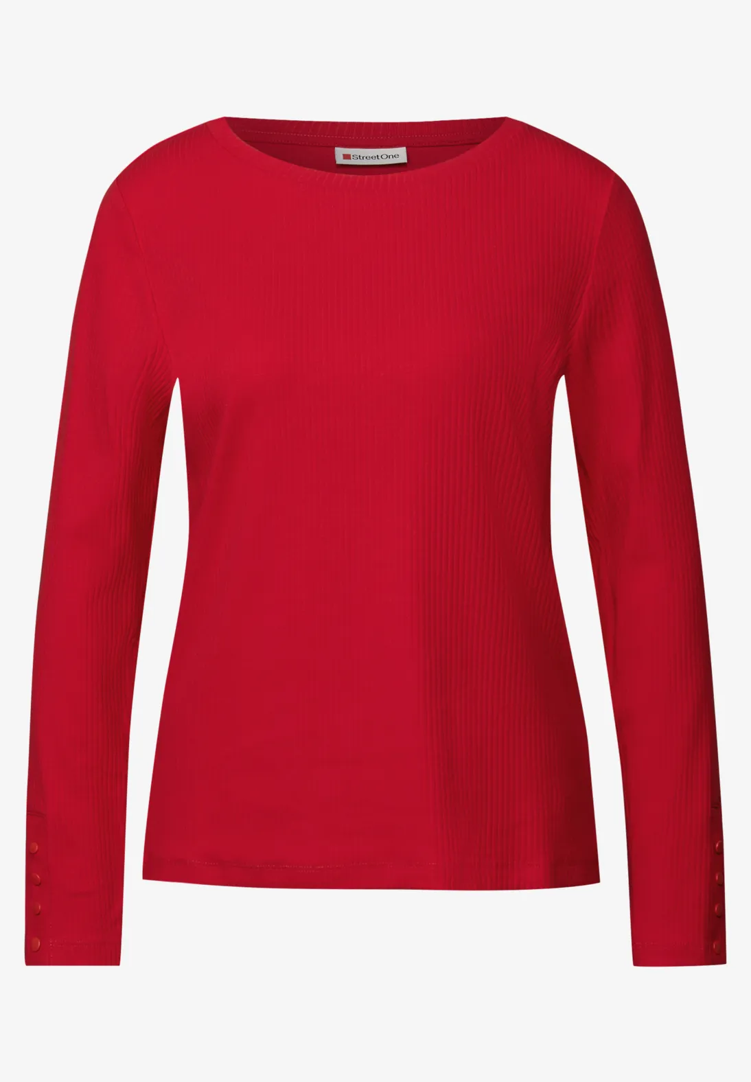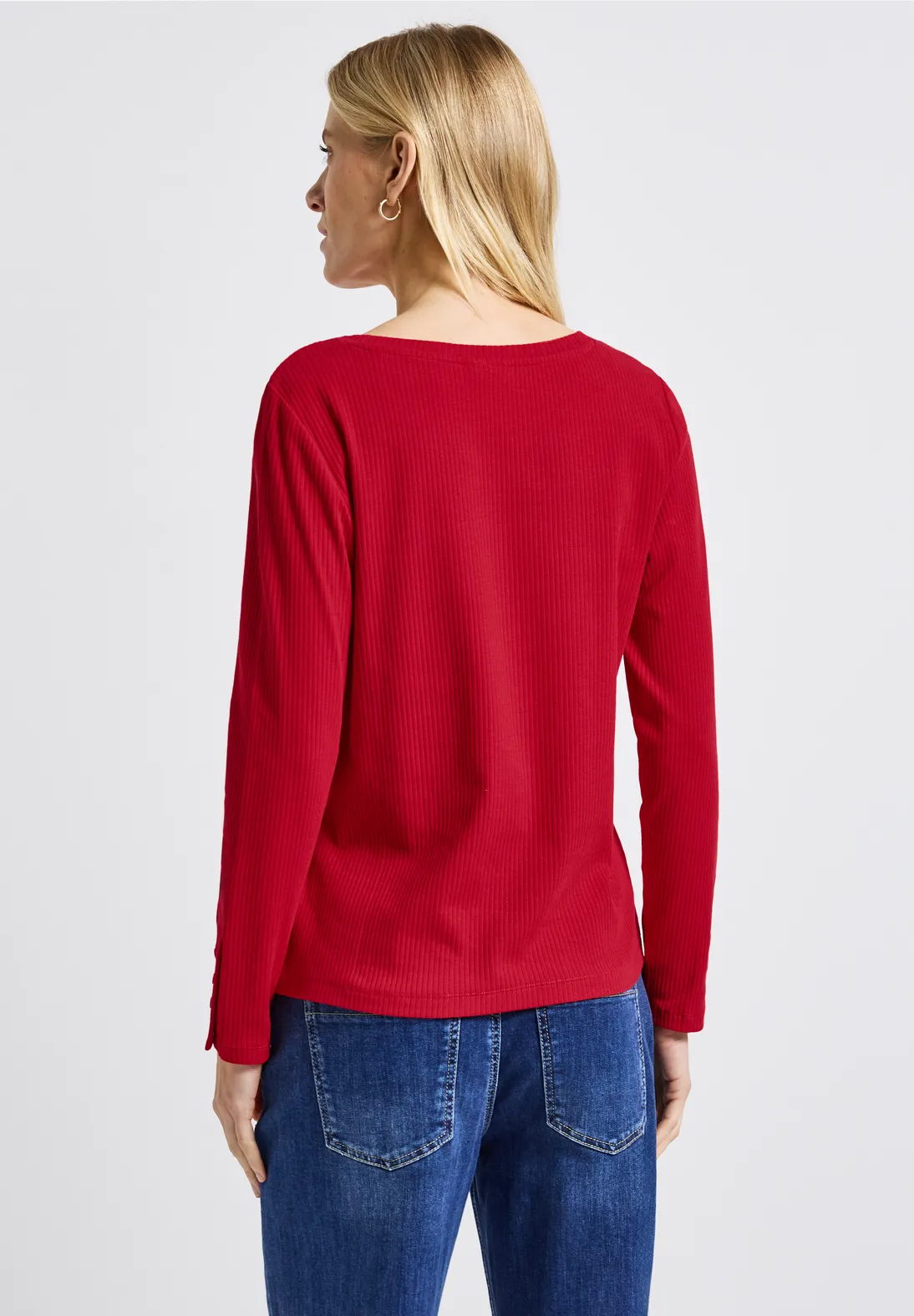 Street One shirt with long sleeves, a boat neckline and a fine ribbed texture. The long sleeves are finished with decorative buttons. This Street One shirt is made of soft, stretchy cotton.