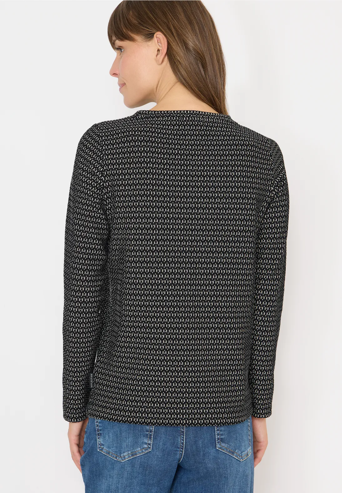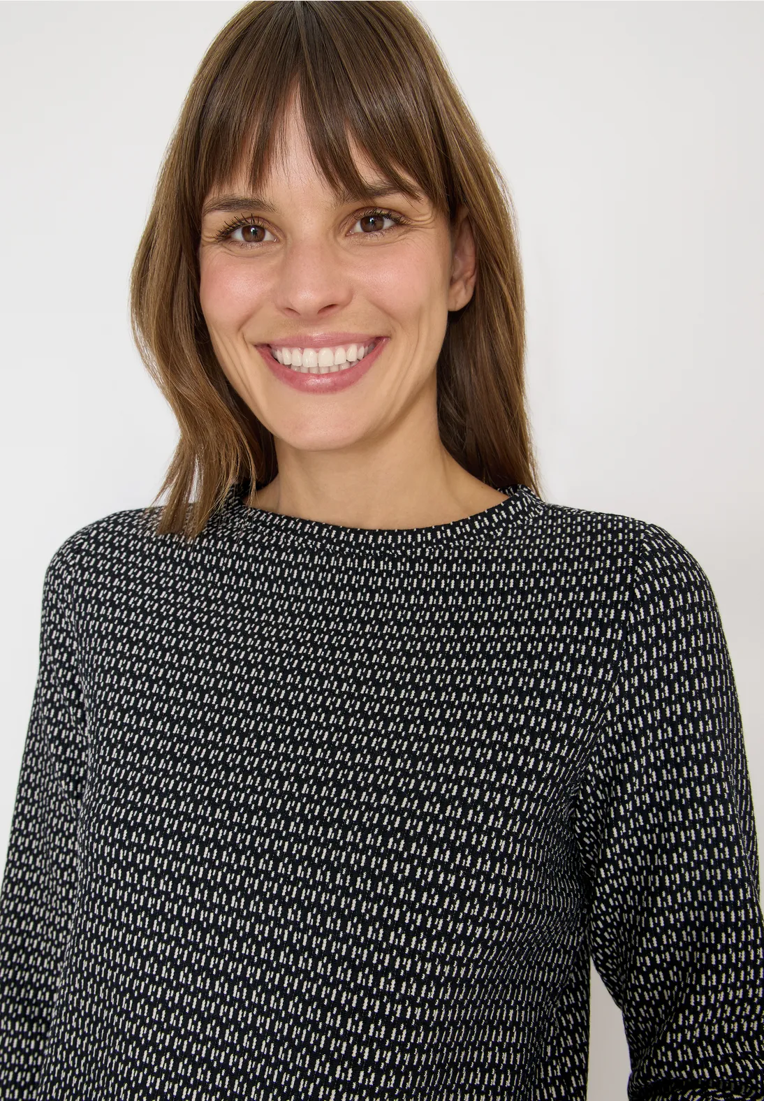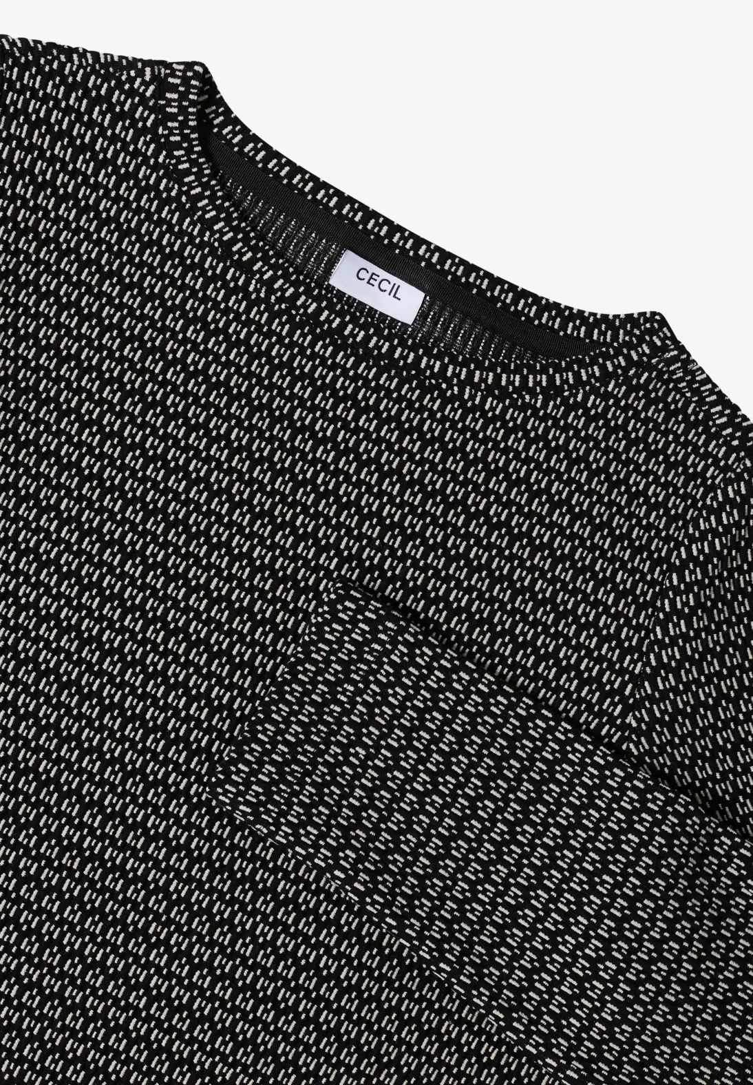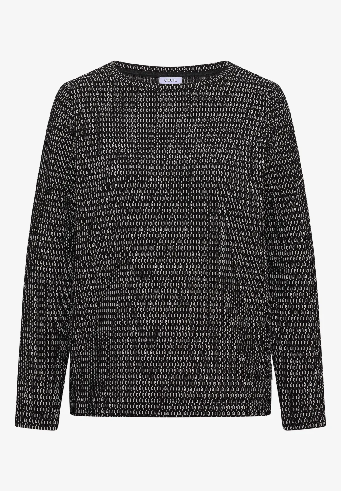 This black women’s shirt by CECIL features a subtle two-tone textured pattern. The boat neckline and long sleeves give it a feminine, polished look. Made from a soft cotton blend with stretch, it offers all-day comfort – perfect for effortlessly stylish everyday outfits.
