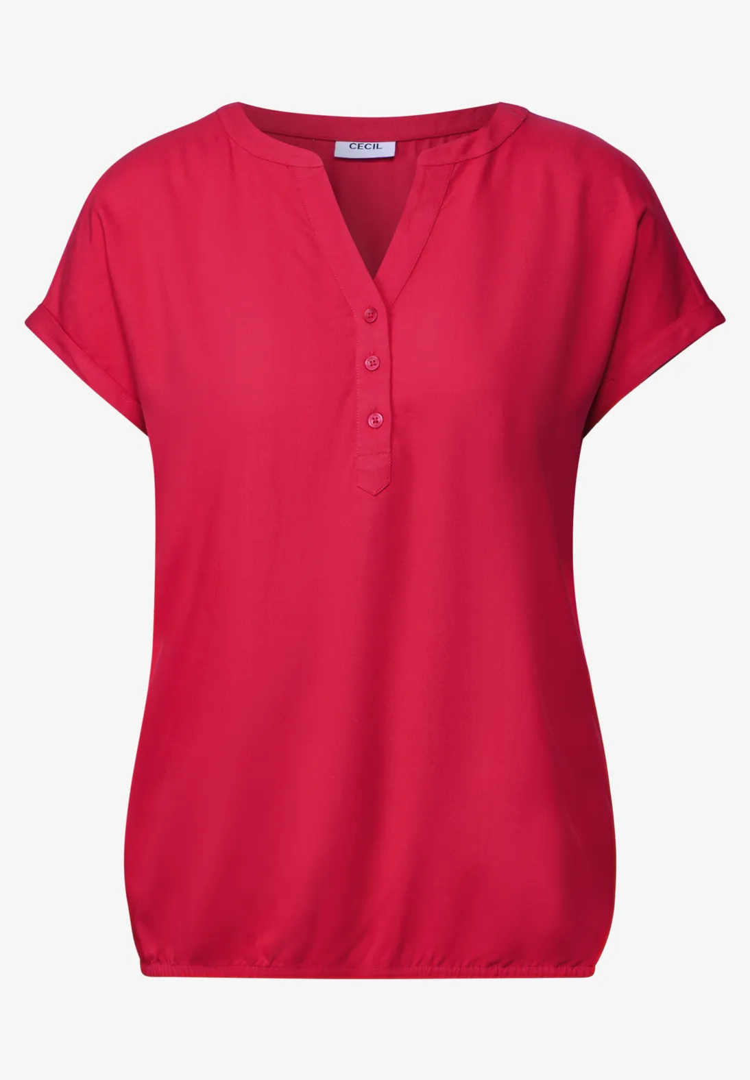 Basic Cecil blouse with short sleeves and a neckline with a slit and decorative button closure. This Cecil blouse has an elastic hem and is made of soft viscose.