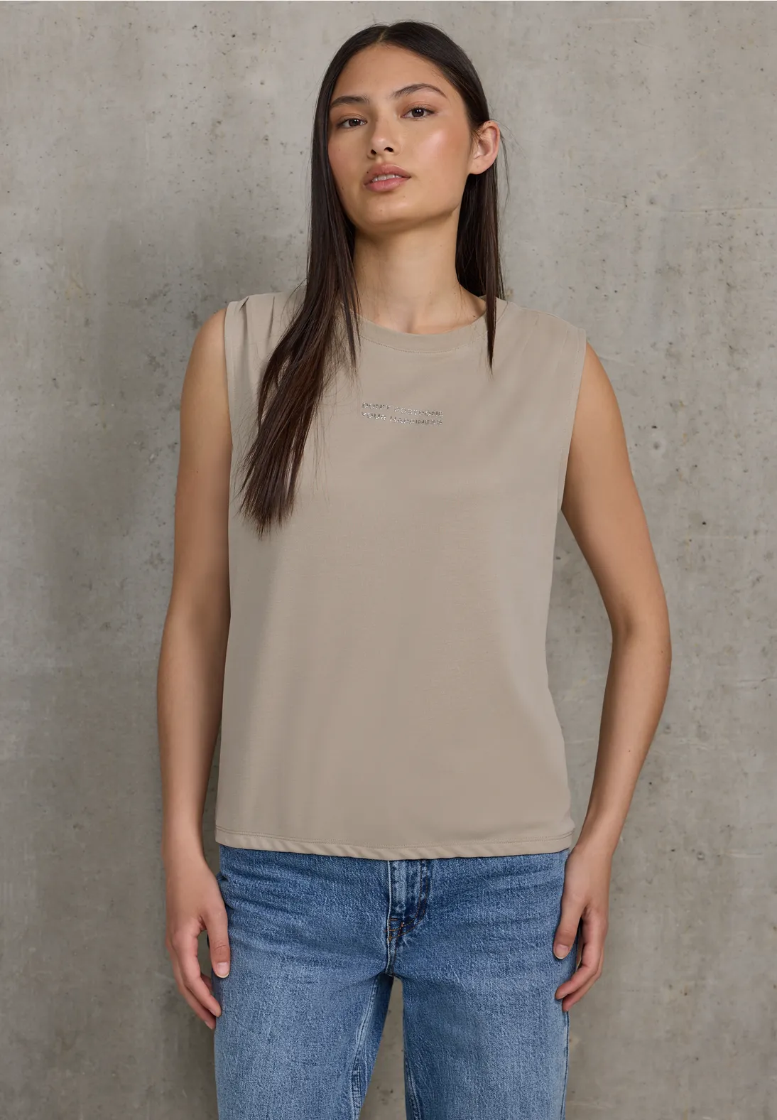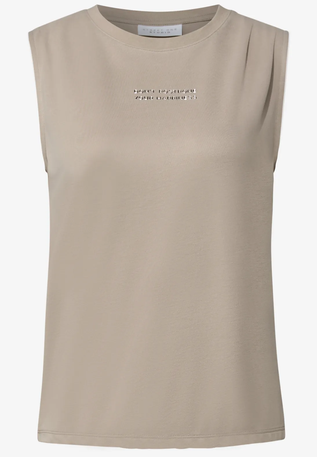 JeansSkirts/DressesCardigans/JumpersJackets/CoatsBlazersDescriptionSilk-Look Top with Text - Sandshell Beige